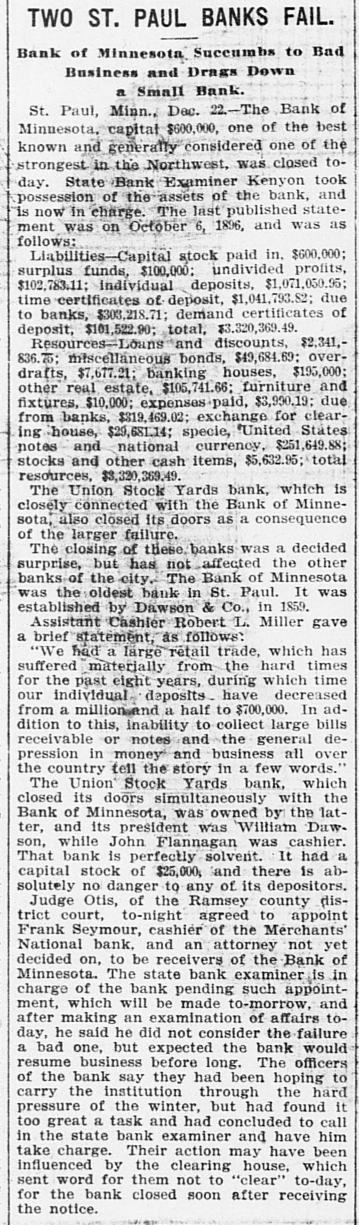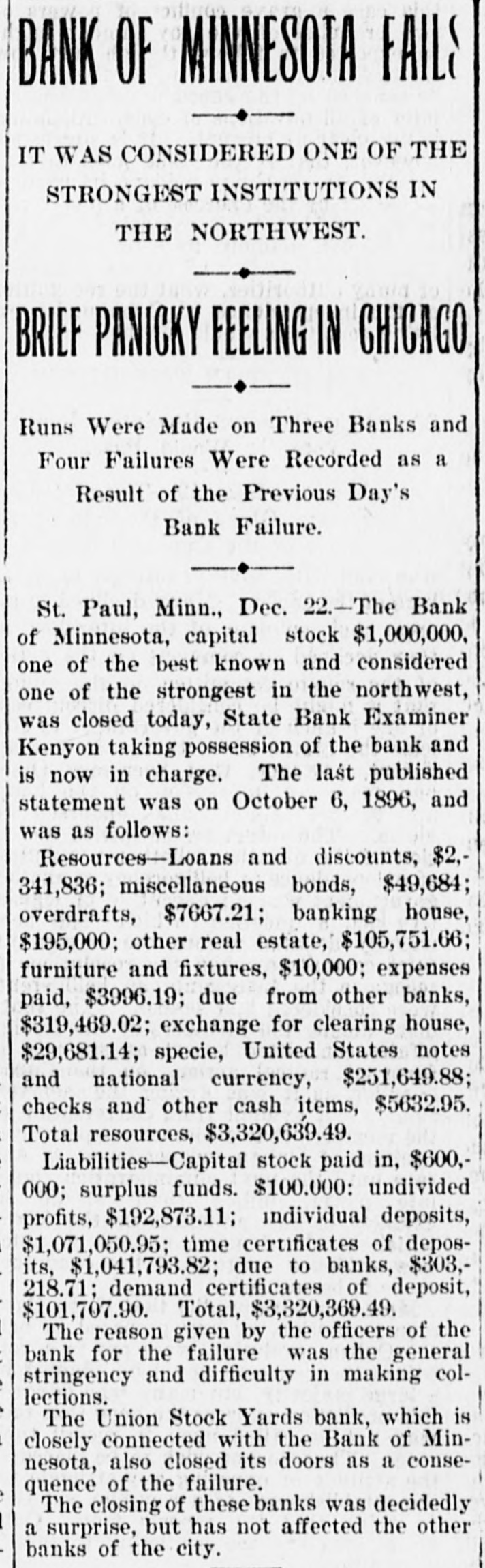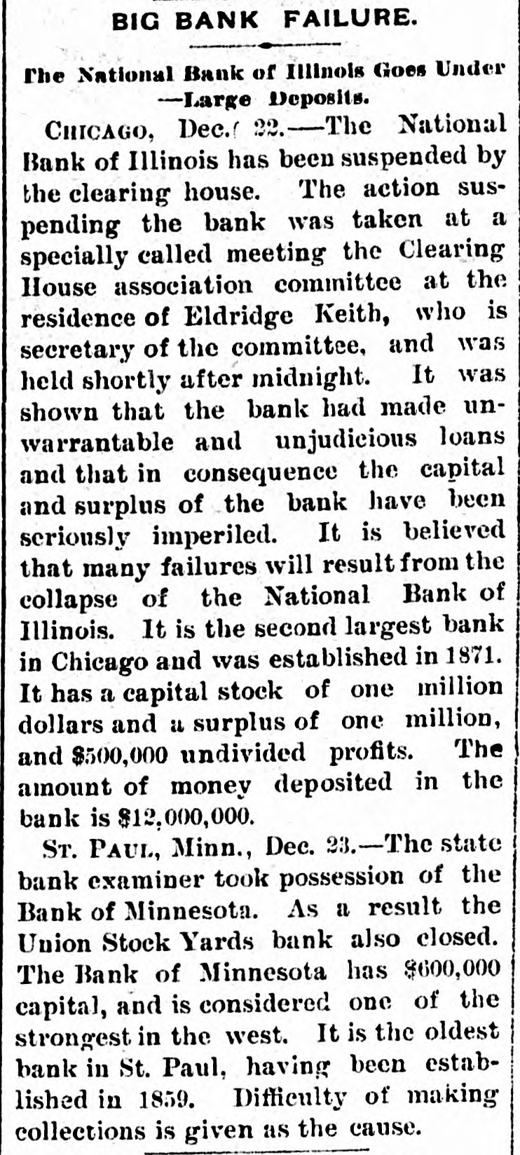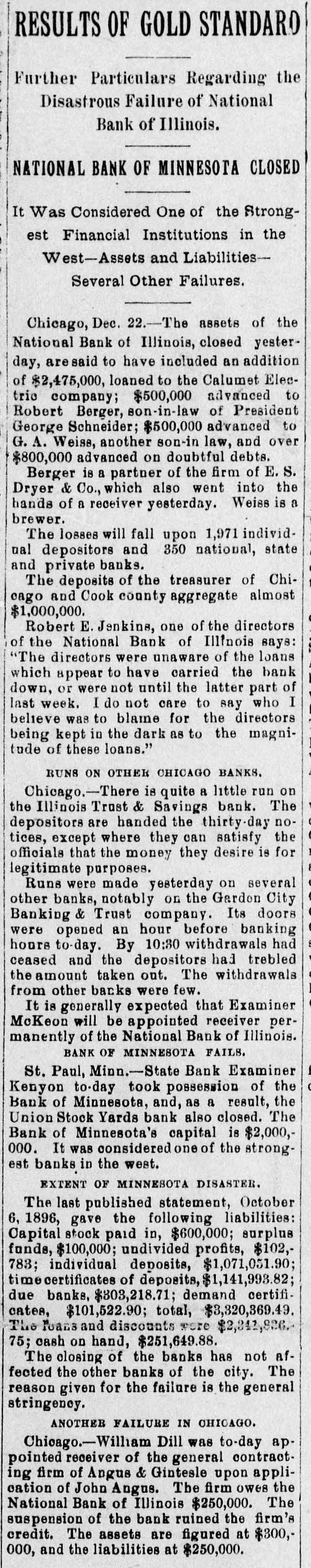 RESULTS OF GOLD STANDARD Further Particulars Regarding the Disastrous Failure of National Bank of Illinois. NATIONAL BANK OF MINNESOTA CLOSED It Was Considered One of the Strongest Financial Institutions in the West-Assets and Liabilities-Several Other Failures. Chicago, Dec. 22.-The assets of the National Bank of Illinois, closed yesterday, aresaid to have included an addition of $2,475,000, loaned to the Calumet Electrio company; $500,000 advanced to Robert Berger, son-in-law of President George Schneider; $500,000 advanced to G. A. Weise, another son-in law, and over $800,000 advanced on doubtful debts. Berger is a partner of the firm of E. S. Dryer & Co., which also went into the hands of a receiver yesterday. Weiss is a brewer. The losses will fall upon 1,971 individnal depositors and 350 national, state and private banks. The deposits of the treasurer of Chicago and Cook county aggregate almost $1,000,000. Robert E. Jenkins, one of the directors of the National Bank of Illinois says: "The directors were unaware of the loans which appear to have carried the bank down, or were not until the latter part of last week. I do not care to say who believe was to blame for the directors being kept in the dark as to the magnitude of these loans." RUNS ON OTHER CHICAGO BANKS. Chicago.-There is quite a little run on the Illinois Trust & Savings bank. The depositors are handed the thirty-day notices, except where they can satisfy the officials that the money they desire is for legitimate purposes. Runs were made yesterday on several other banks, notably on the Gardon City Banking & Trust company. Its doors were opened an hour before banking hours to-day. By 10:30 withdrawals had ceased and the depositors had trebled the amount taken out. The withdrawals from other backs were few. It is generally expected that Examiner McKeon will be appointed receiver permanently of the National Bank of Illinois. BANK OF MINNESOTA FAILS. St. Paul, Minn.-State Bank Examiner Kenyon to-day took possession of the Bank of Minnesota, and, as a result, the Union Stock Yards bank also closed. The Bank of Minnesota's capital is $2,000, 000. It was considered one of the strongest banks in the west. EXTENT OF MINNESOTA DISASTER. The last published statement, October 6, 1896, gave the following liabilities: Capital stock paid in, $600,000; surplus funds, $100,000; undivided profits, $102,783; individual deposits, $1,071,051.90; time certificates of deposits, $1,141,993.82; due banks, $303,218.71; demand certificates, $101,522.90; total, $3,320,369.49. The Teams and discounts were $2,342,826. 75; cash on hand, $251,649.88. The closing of the banks has not affected the other banks of the city. The reason given for the failure is the general stringency. ANOTHER FAILURE IN CHICAGO. Chicago.-William Dill was to-day appointed receiver of the general contracting firm of Angus & Gintesle upon application of John Angus. The firm owes the National Bank of Illinois $250,000. The suspension of the bank ruined the firm's credit. The assets are figured at $300,000, and the liabilities at $250,000.