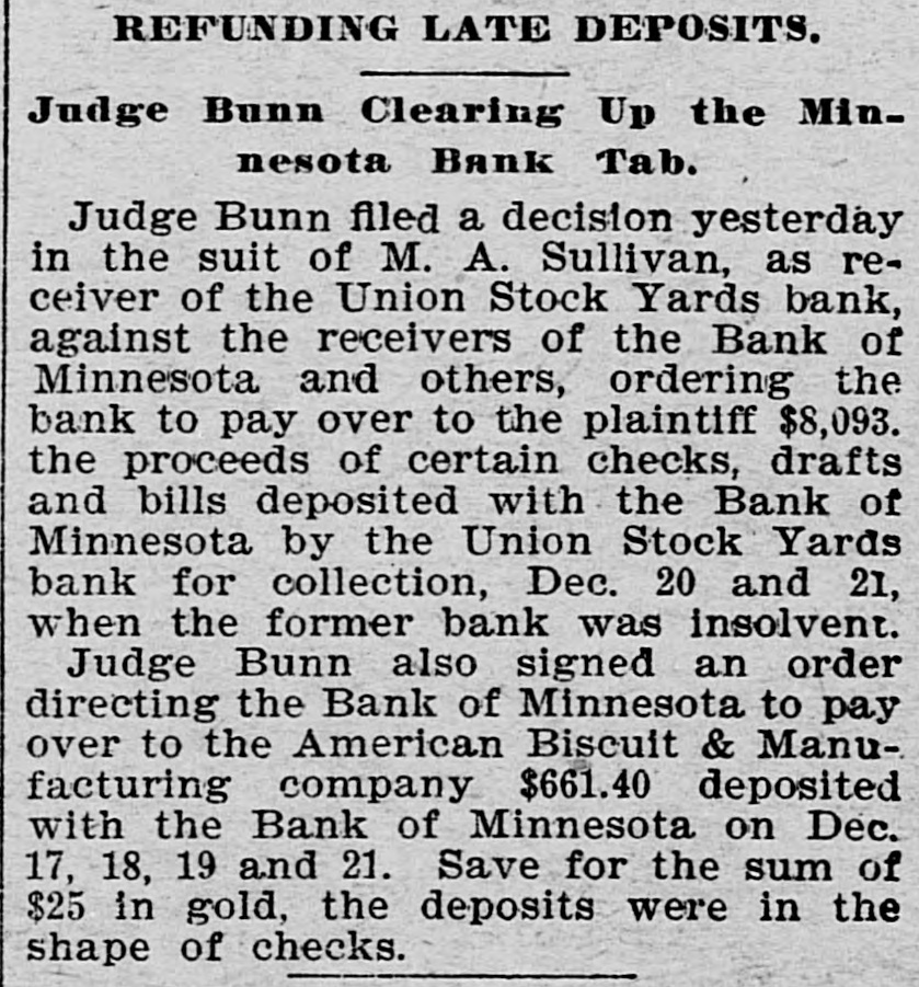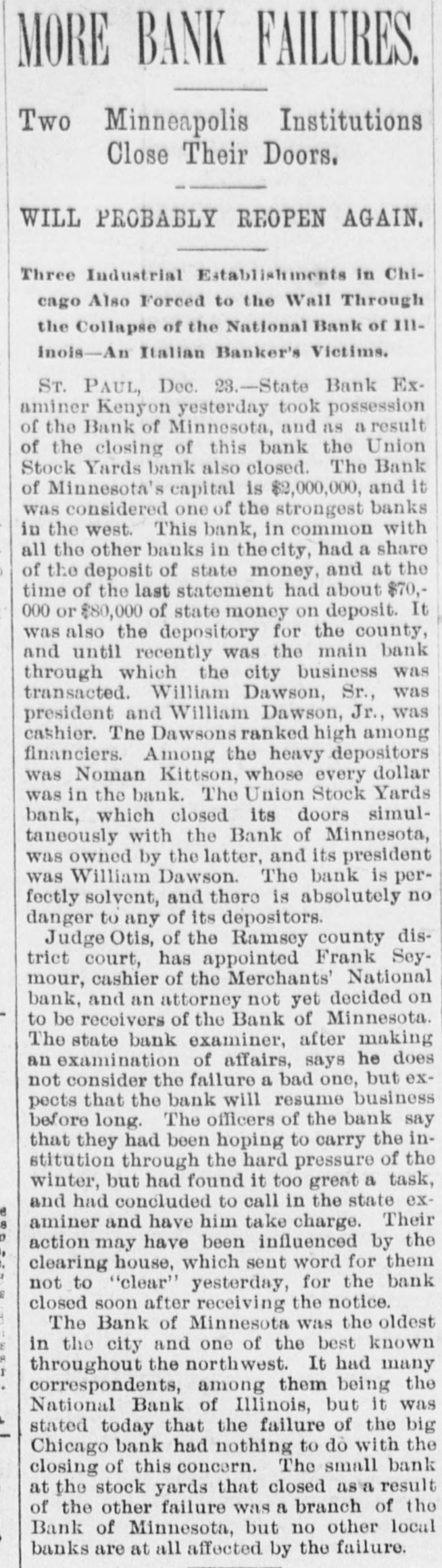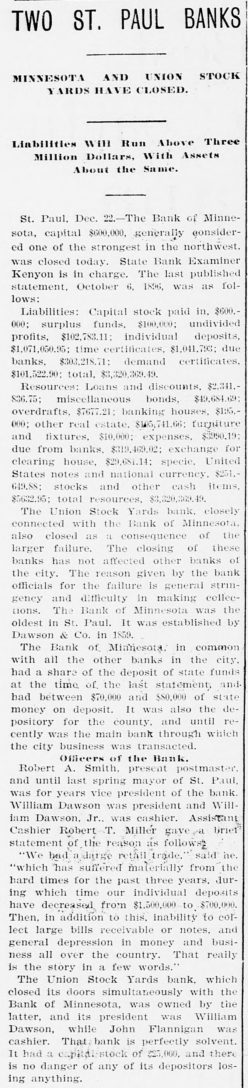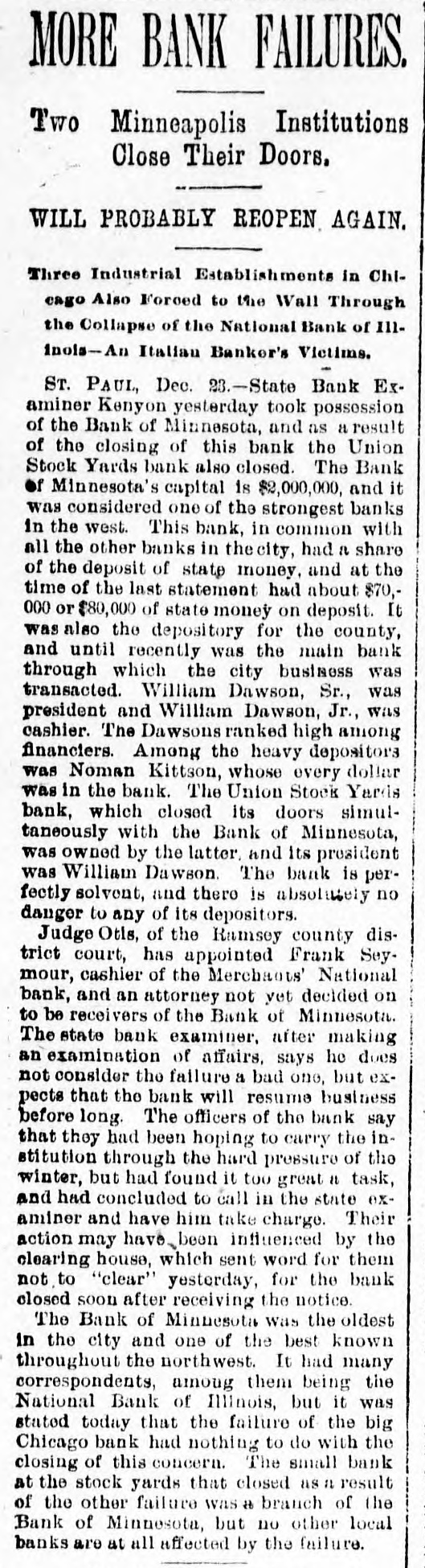 RESULTS OF GOLD STANDARD Further Particulars Regarding the Disastrous Failure of National Bank of Illinois. NATIONAL BANK OF MINNESOTA CLOSED It Was Considered One of the Strongest Financial Institutions in the West-Assets and Liabilities-Several Other Failures. Chicago, Dec. 22.-The assets of the National Bank of Illinois, closed yesterday, aresaid to have included an addition of $2,475,000, loaned to the Calumet Electrio company; $500,000 advanced to Robert Berger, son-in-law of President George Schneider; $500,000 advanced to G. A. Weise, another son-in law, and over $800,000 advanced on doubtful debts. Berger is a partner of the firm of E. S. Dryer & Co., which also went into the hands of a receiver yesterday. Weiss is a brewer. The losses will fall upon 1,971 individnal depositors and 350 national, state and private banks. The deposits of the treasurer of Chicago and Cook county aggregate almost $1,000,000. Robert E. Jenkins, one of the directors of the National Bank of Illinois says: "The directors were unaware of the loans which appear to have carried the bank down, or were not until the latter part of last week. I do not care to say who believe was to blame for the directors being kept in the dark as to the magnitude of these loans." RUNS ON OTHER CHICAGO BANKS. Chicago.-There is quite a little run on the Illinois Trust & Savings bank. The depositors are handed the thirty-day notices, except where they can satisfy the officials that the money they desire is for legitimate purposes. Runs were made yesterday on several other banks, notably on the Gardon City Banking & Trust company. Its doors were opened an hour before banking hours to-day. By 10:30 withdrawals had ceased and the depositors had trebled the amount taken out. The withdrawals from other backs were few. It is generally expected that Examiner McKeon will be appointed receiver permanently of the National Bank of Illinois. BANK OF MINNESOTA FAILS. St. Paul, Minn.-State Bank Examiner Kenyon to-day took possession of the Bank of Minnesota, and, as a result, the Union Stock Yards bank also closed. The Bank of Minnesota's capital is $2,000, 000. It was considered one of the strongest banks in the west. EXTENT OF MINNESOTA DISASTER. The last published statement, October 6, 1896, gave the following liabilities: Capital stock paid in, $600,000; surplus funds, $100,000; undivided profits, $102,783; individual deposits, $1,071,051.90; time certificates of deposits, $1,141,993.82; due banks, $303,218.71; demand certificates, $101,522.90; total, $3,320,369.49. The Teams and discounts were $2,342,826. 75; cash on hand, $251,649.88. The closing of the banks has not affected the other banks of the city. The reason given for the failure is the general stringency. ANOTHER FAILURE IN CHICAGO. Chicago.-William Dill was to-day appointed receiver of the general contracting firm of Angus & Gintesle upon application of John Angus. The firm owes the National Bank of Illinois $250,000. The suspension of the bank ruined the firm's credit. The assets are figured at $300,000, and the liabilities at $250,000.