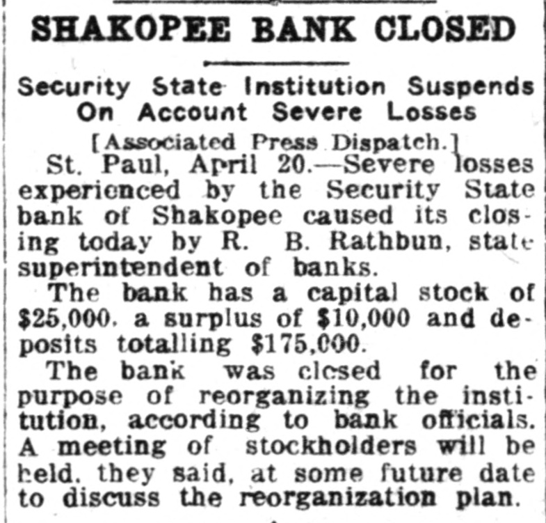 SHAKOPEE BANK CLOSED Security State Institution Suspends On Account Severe Losses [Associated Press Dispatch.] St. Paul, April 20.-Severe losses experienced by the Security State bank of Shakopee caused its closing today by R. B. Rathbun, state superintendent of banks. The bank has a capital stock of $25,000. a surplus of $10,000 and deposits totalling $175,000. The bank was closed for the purpose of reorganizing the institution, according to bank officials. A meeting of stockholders will be held. they said, at some future date to discuss the reorganization plan.