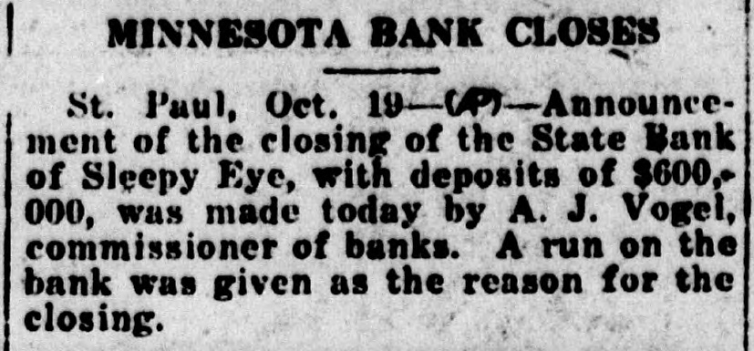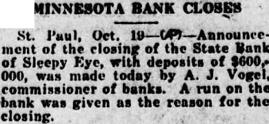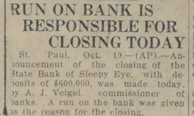 Run on Sleepy Eye Bank Causes Closing St. Paul, Minn., Oct. the closing the State Bank Sleepy Eye, posits of $600,000. made today Viegel, commissioner banks. George Berkner was president the bank and Herzog the bank given the the closing.