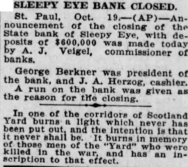 SLEEPY EYE BANK CLOSED. St. Paul, Oct. nouncement the closing of State bank of Sleepy Eye, deposits of was made today Veigel, commissioner of banks. George Berkner was president of the bank, and Herzog, cashier. run bank given the reason for the closing. one the corridors of burns which Scotland been put and the memory men the and has an inscription to that