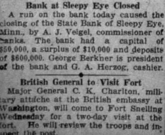 Bank at Sleepy Eye Closed A run on the bank today caused the closing of the State Bank of Sleepy Eye, Minn., by A. J. Veigel, commissioner of banks. The bank had a capital of $50,000. surplus of $10,000 and deposits of $600,000. George Berkher is president of the bank and G. A. Herzog, cashier. British General to Visit Fort Major General C. K. Charlton, mill tary attache at the British embassy at Washington, will come to Fort Snelling W ednesday for two-day visit at the fort. He will review the troops and in: spect the post.