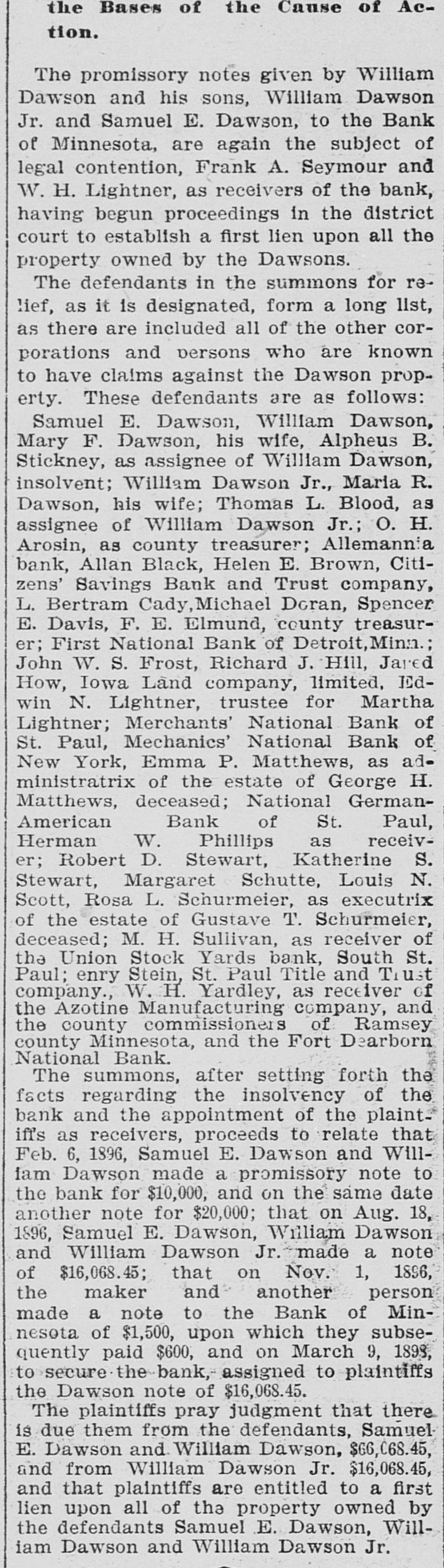 the Bases of the Cause of Action. The promissory notes given by William Dawson and his sons, William Dawson Jr. and Samuel E. Dawson, to the Bank of Minnesota, are again the subject of legal contention, Frank A. Seymour and W. H. Lightner, as receivers of the bank, having begun proceedings in the district court to establish a first lien upon all the property owned by the Dawsons. The defendants in the summons for relief, as it is designated, form a long list, as there are included all of the other corporations and persons who are known to have claims against the Dawson property. These defendants are as follows: Samuel E. Dawson, William Dawson, Mary F. Dawson, his wife, Alpheus B. Stickney, as assignee of William Dawson, insolvent; William Dawson Jr., Maria R. Dawson, his wife; Thomas L. Blood, as assignee of William Dawson Jr.; O. H. Arosin, as county treasurer; Allemannia bank, Allan Black, Helen E. Brown, Citizens' Savings Bank and Trust company, L. Bertram Cady, Michael Doran, Spencer E. Davis, F. E. Elmund, county treasurer; First National Bank of Detroit, Minn.; John W. S. Frost, Richard J. Hill, Jared How, Iowa Land company, limited, Edwin N. Lightner, trustee for Martha Lightner; Merchants' National Bank of St. Paul, Mechanics' National Bank of New York, Emma P. Matthews, as administratrix of the estate of George H. Matthews, deceased; National German-American Bank of St. Paul, Herman W. Phillips as receiver; Robert D. Stewart, Katherine S. Stewart, Margaret Schutte, Louis N. Scott, Rosa L. Schurmeier, as executrix of the estate of Gustave T. Schurmeier, deceased; M. H. Sullivan, as receiver of the Union Stock Yards bank, South St. Paul; enry Stein, St. Paul Title and Trust company., W. H. Yardley, as receiver of the Azotine Manufacturing company, and the county commissioners of Ramsey county Minnesota, and the Fort Dearborn National Bank. The summons, after setting forth the facts regarding the insolvency of the bank and the appointment of the plaintiff's as receivers, proceeds to relate that Feb. 6, 1896, Samuel E. Dawson and William Dawson made a promissory note to the bank for $10,000, and on the same date another note for $20,000; that on Aug. 18, 1896, Samuel E. Dawson, William Dawson and William Dawson Jr. made a note of $16,068.45; that on Nov. 1, 1896, the maker and another person made a note to the Bank of Minnesota of $1,500, upon which they subsequently paid $600, and on March 9, 1899, to secure the bank, assigned to plaintiffs the Dawson note of $16,068.45. The plaintiffs pray judgment that there is due them from the defendants, Samuel E. Dawson and William Dawson, $66,068.45, and from William Dawson Jr. $16,068.45, and that plaintiffs are entitled to a first lien upon all of the property owned by the defendants Samuel E. Dawson, William Dawson and William Dawson Jr.