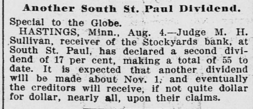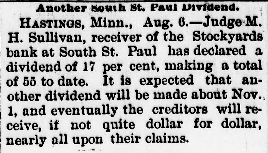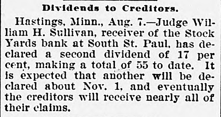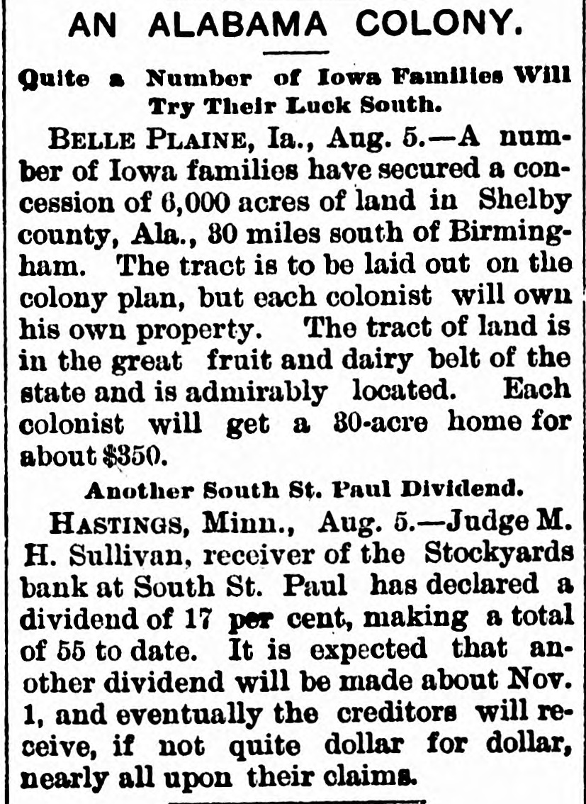 AN ALABAMA COLONY. Quite a Number of Iowa Families Will Try Their Luck South. BELLE PLAINE, Ia., Aug. 5.-A number of Iowa families have secured a concession of 6,000 acres of land in Shelby county, Ala., 30 miles south of Birmingham. The tract is to be laid out on the colony plan, but each colonist will own his own property. The tract of land is in the great fruit and dairy belt of the state and is admirably located. Each colonist will get a 30-acre home for about $350. Another South St. Paul Dividend. HASTINGS, Minn., Aug. 5.-Judge M. H. Sullivan, receiver of the Stockyards bank at South St. Paul has declared a dividend of 17 per cent, making a total of 55 to date. It is expected that another dividend will be made about Nov. 1, and eventually the creditors will receive, if not quite dollar for dollar, nearly all upon their claims.