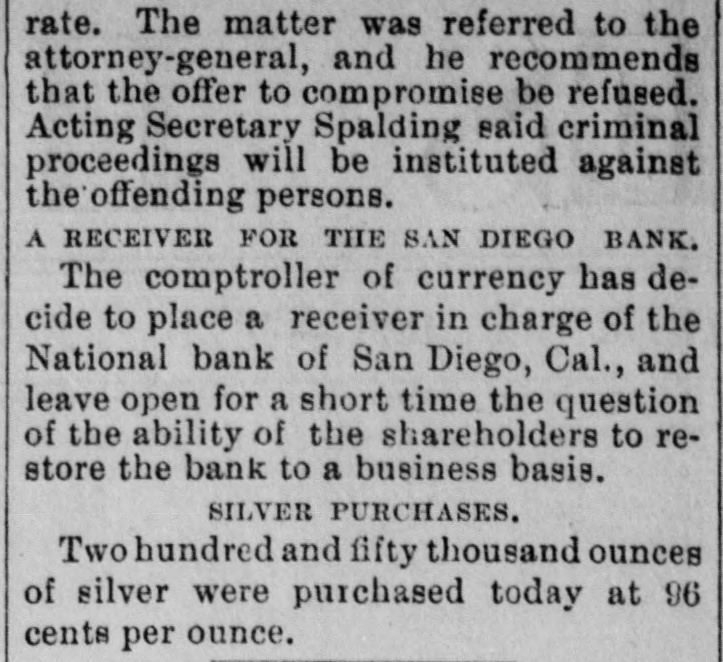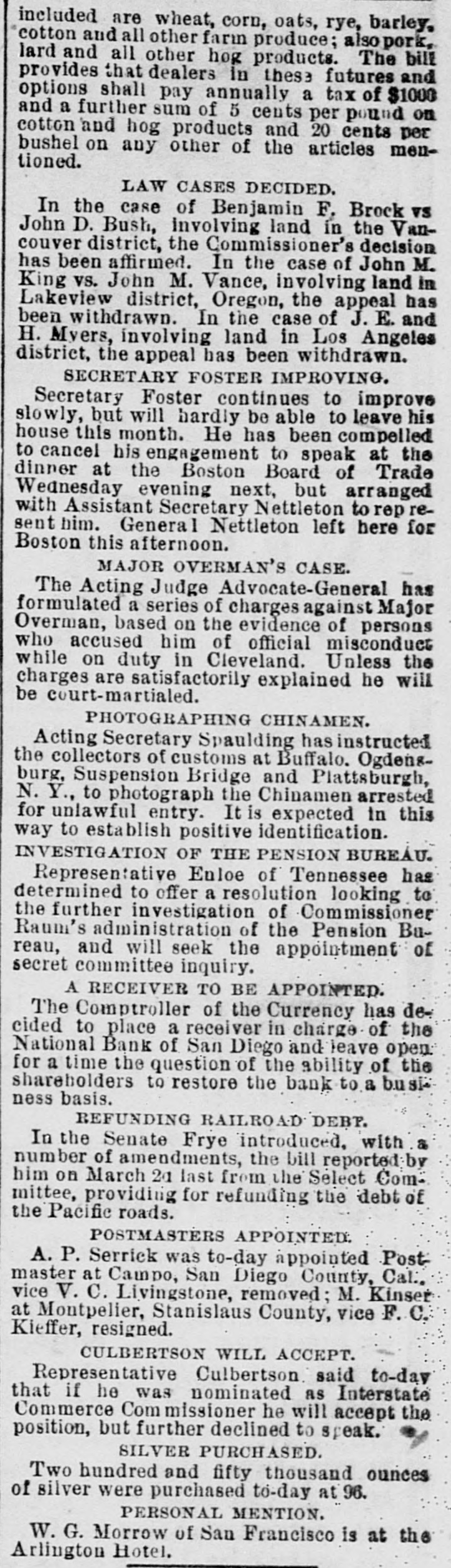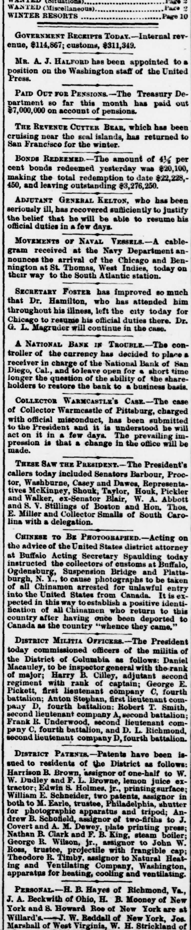 (Situations) Page Page WANTED (Misceilaneous) WINTER RESORTS Page 10 GOVERNMENT RECEIPTS TODAY.-Internal revenue, $114,867; customs, $311,349. MR. A. J. HALFORD has been appointed to a position on the Washington staff of the United Press. PAID OUT FOR PENSIONS.-The Treasury Department 80 far this month has paid out $7,000,000 on account of pensions. THE REVENUE CUTTER BEAR, which has been cruising near the seal islands, has returned to San Francisco for the winter. BONDS REDEEMED-The amount of 41/2 per cent bonds redeemed yesterday was $20,100, making the total redemption to date $22,228,450, and leaving outstanding $3,276,250. ADJUTANT GENERAL KELTON, who has been seriously ill, has recovered sufficiently to justify the belief that he will be able to resume his official duties in a few days. MOVEMENTS OF NAVAL VESSELS.-A cablegram received at the Navy Department announces the arrival of the Chicago and Bennington at St. Thomas, West Indies, today on their way to the South Atlantic station. SECRETARY FOSTER has improved 80 much that Dr. Hamilton, who has attended him throughout his illness, left the city today for Chicago to resume his official duties there. Dr. G. L. Magruder will continue in the case. A NATIONAL BANK IN TROUBLE-The controller of the currency has decided to place a receiver in charge of the National Bank of San Diego, Cal., and to leave open for a short time longer the question of the ability of the shareholders to restore the bank to a business basis. COLLECTOR WARMCASTLE'S CASE.-The case of Collector Warmcastle of Pittsburg, charged with official misconduct, has been submitted to the President and it is understood be will act on it in a few days. The prevailing impression is that a change in the office will be made. THESE Saw THE PRESIDENT.-The President's callers today included Senators Barbour, Proctor, Washburne, Casey and Dawes, Representatives McKinney, Shouk, Taylor, Houk, Pickler and Walker, ex-Senator Blair, W. A. Abbott and S. V. Stillings of Boston and Hon. Thos. E. Miller and Collector Smalls of South Carolina with a delegation. CHINESE TO BE PHOTOGBAPHED.-Acting on the advice of the United States district attorney at Buffaio Acting Secretary Spaulding today instructed the collectors of customs at Buffalo, Ogdensburg, Suspension Bridge and Plattsburgh, N. Y., to cause photographs to be taken of all Chinamen arrested for unlawful entry into the United States from Canada. It t is expected in this way to establish a positive identilication of all Chinamen who return to this country after having once been deported to Canada as the country "whence they came." DISTRICT MILITIA OFFICERS.-The President today commissioned officers of the militia of the District of Columbia as follows: Daniel Macauley, to be inspector general with the rank of major; Harry B. Cilley, adjutant second regiment with rank of captain; George E. Pickett, first lieutenant company C, fourth battalion; Anton Stephan, first lieutenant company D, fourth battalion: Robert T. Smith, second lieutenant company A, second battalion; Frank R. Underwood. second lieutenant company C. fourth battalion, and D. L. Richmond, second lieutenant company D, fourth battalion. DISTRICT PATENTS.-Patents have been issued to residents of the District as follows: Harrison B. Brown, assignor of one-half to W. W. Dudley and F. L. Browne, lemon juice extractor; Edwin S. Holmes. jr., printing surface; William E. Schneider, two patents, assignor in both to M. Earle, trustee, Philadelphia, shutter for photographic apparatus and tripod; Andrew B. Schofield, assignor of two-fifths to J. Covert and A. M. Dewey. plate printing press; Nathan B. Clark and F. B. King, steam boiler; George R. Wilson, jr., assignor to John W. Ross, trustee, projectile with frangible cap; Theodore R. Timby. assignor to Natural Heating and Ventilating Company, Washington, apparatus for heating, cooling and ventilating. PERSONAL-H. B. Hayes of Richmond, Va., J. A. Beckwith of Ohio, H. B. Mooney of New York and S. Howard Roe of New York are at Willard's W. Reddall of New York, Jos. Marshall of West Virginia, W. H. Strickland of