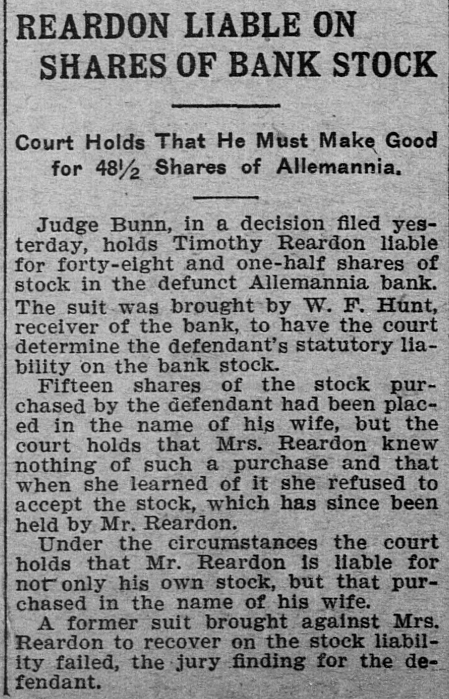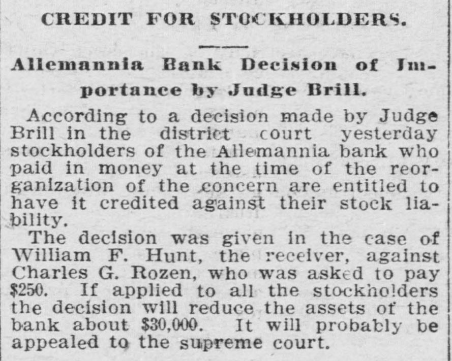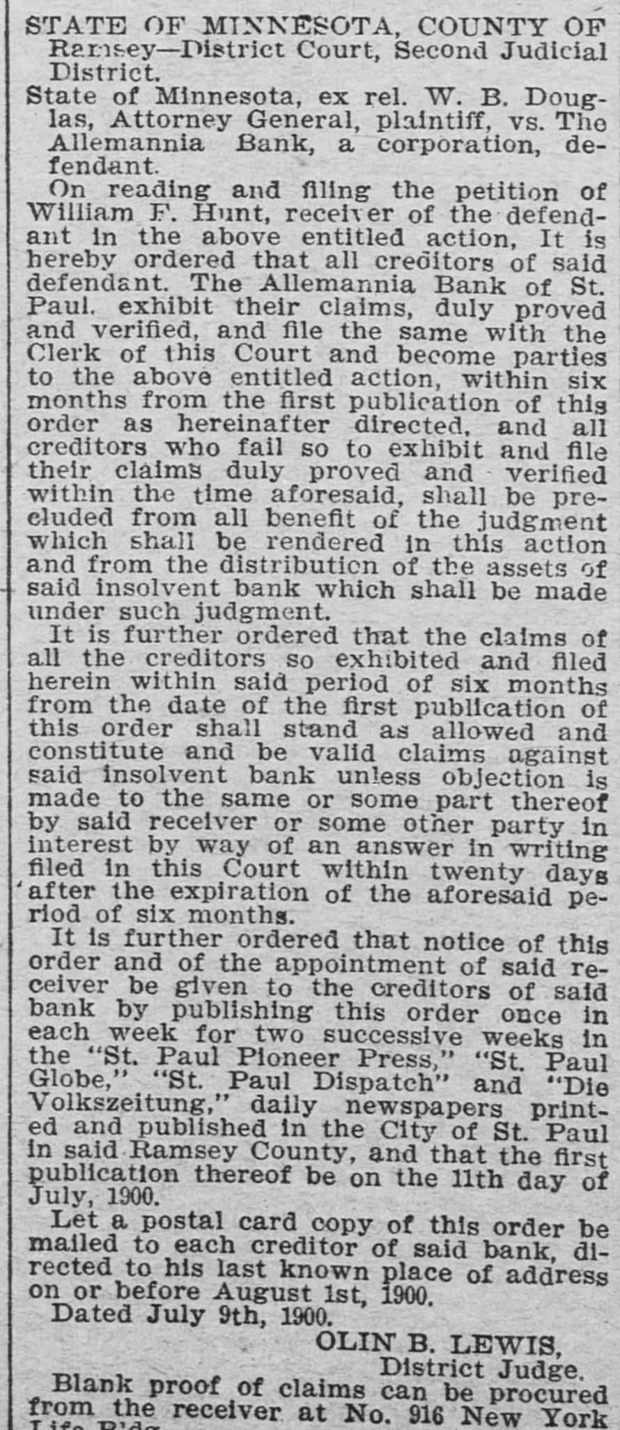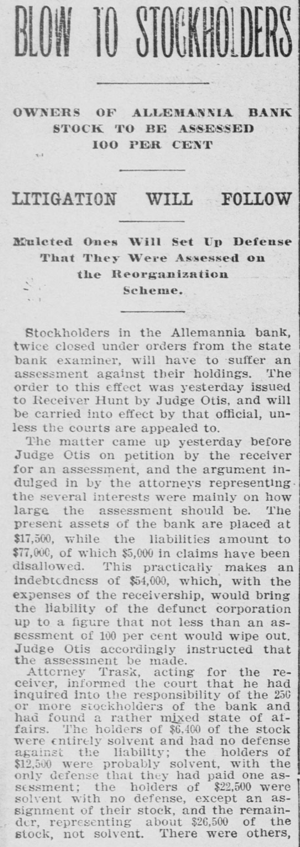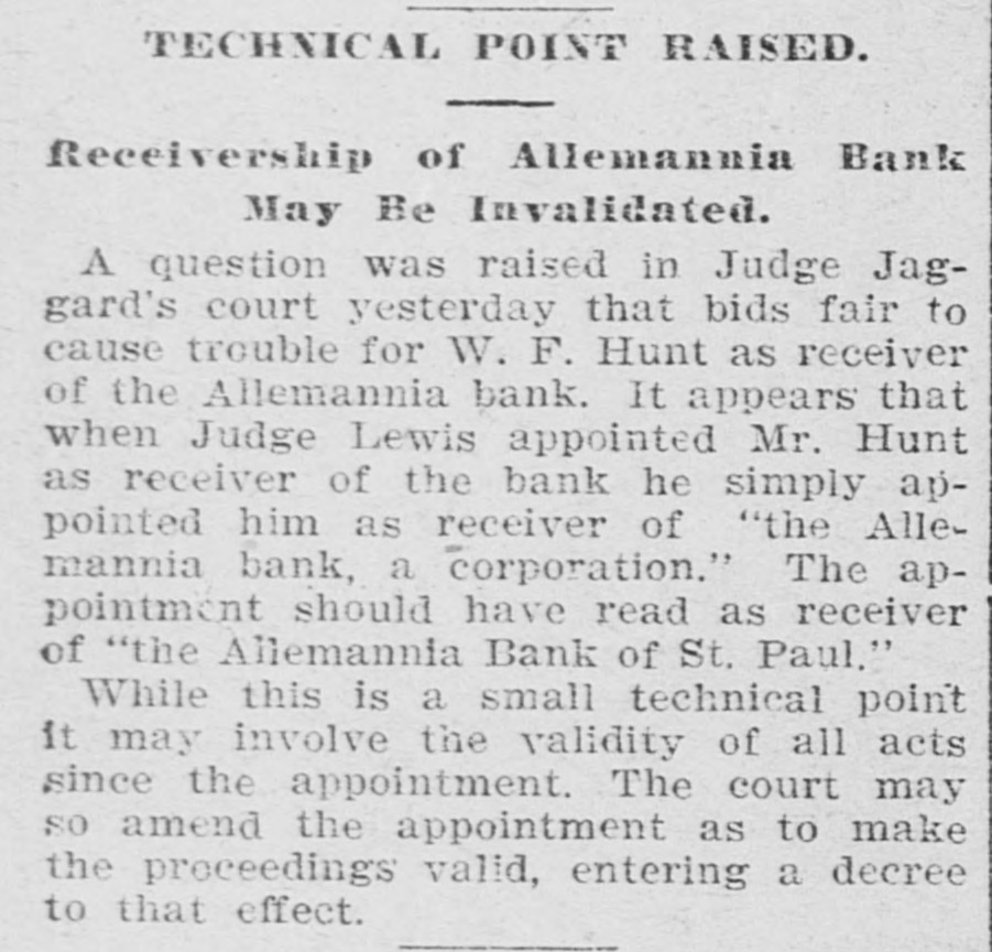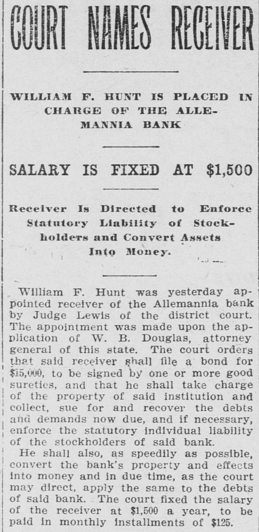 COURT NAMES RECEIVER WILLIAM F. HUNT IS PLACED IN CHARGE OF THE ALLEMANNIA BANK SALARY IS FIXED AT $1,500 Receiver Is Directed to Enforce Statutory Liability of Stockholders and Convert Assets Into Money. William F. Hunt was yesterday appointed receiver of the Allemannia bank by Judge Lewis of the district court. The appointment was made upon the application of W. B. Douglas, attorney general of this state. The court orders that said receiver shall file a bond for $15,000, to be signed by one or more good sureties, and that he shall take charge of the property of said institution and collect, sue for and recover the debts and demands now due, and if necessary, enforce the statutory individual liability of the stockholders of said bank. He shall also, as speedily as possible, convert the bank's property and effects into money and in due time, as the court may direct, apply the same to the debts of said bank. The court fixed the salary of the receiver at $1,500 a year, to be paid in monthly installments of $125.