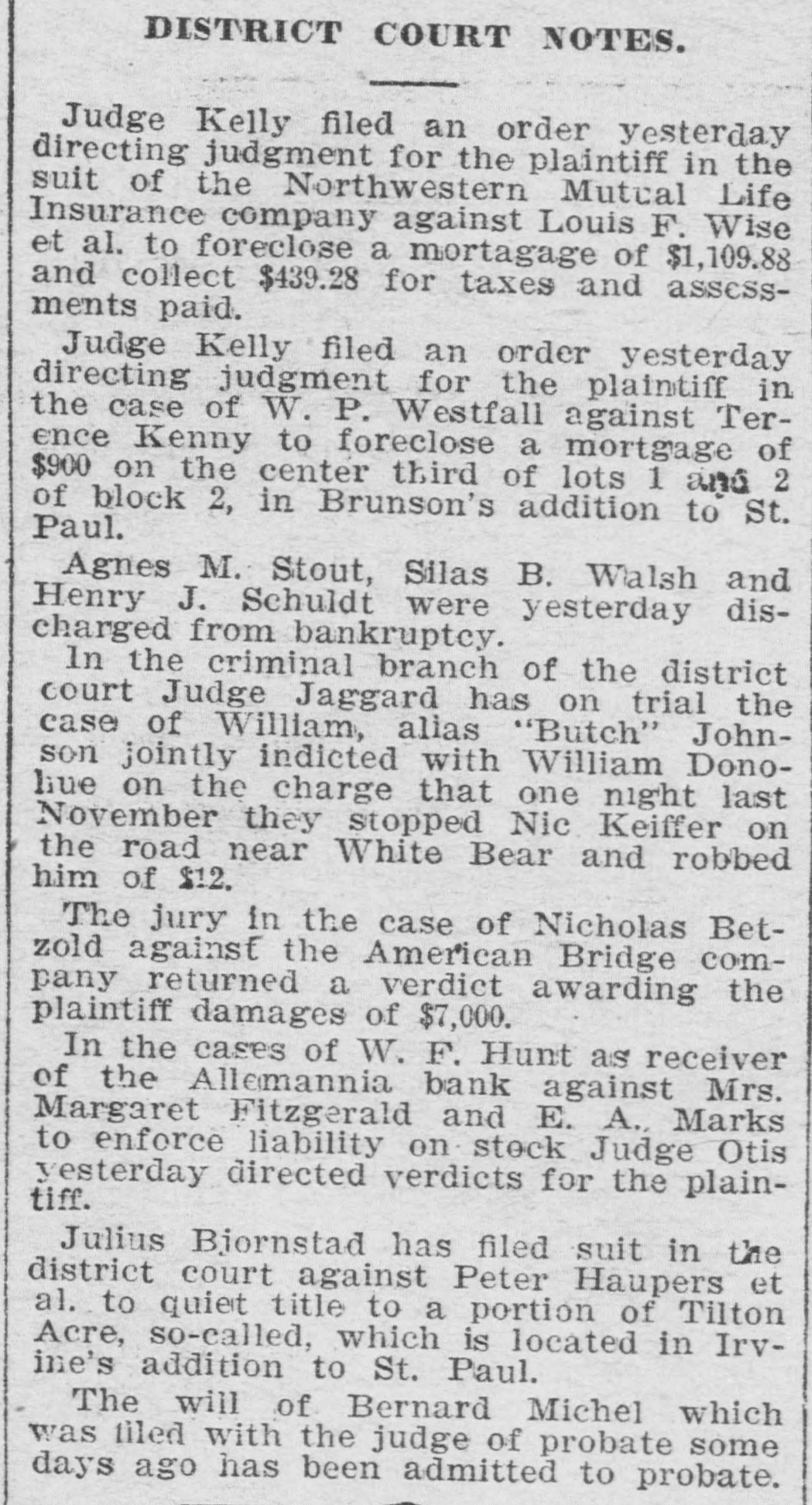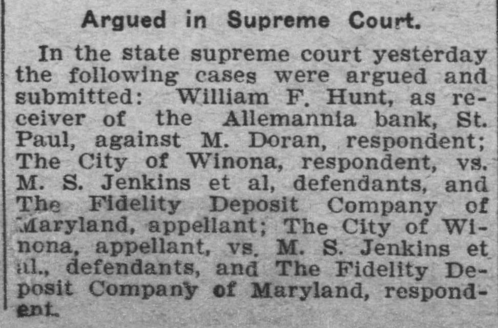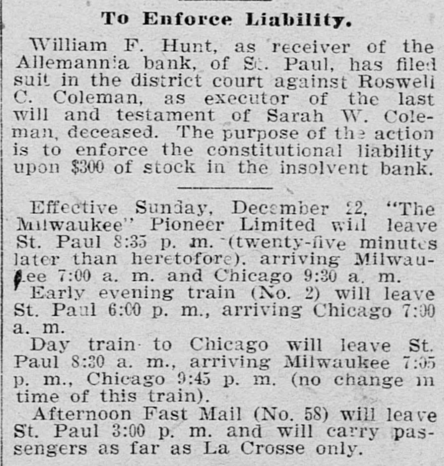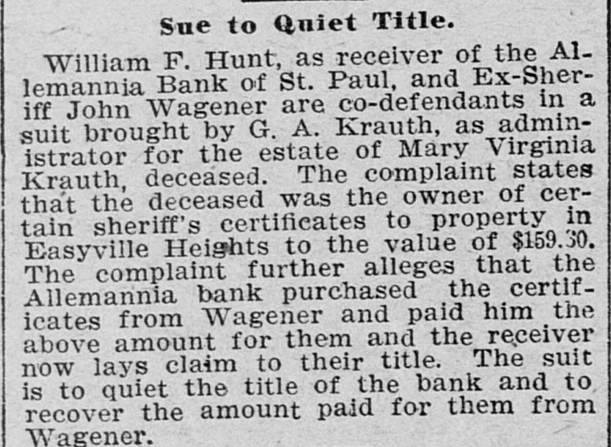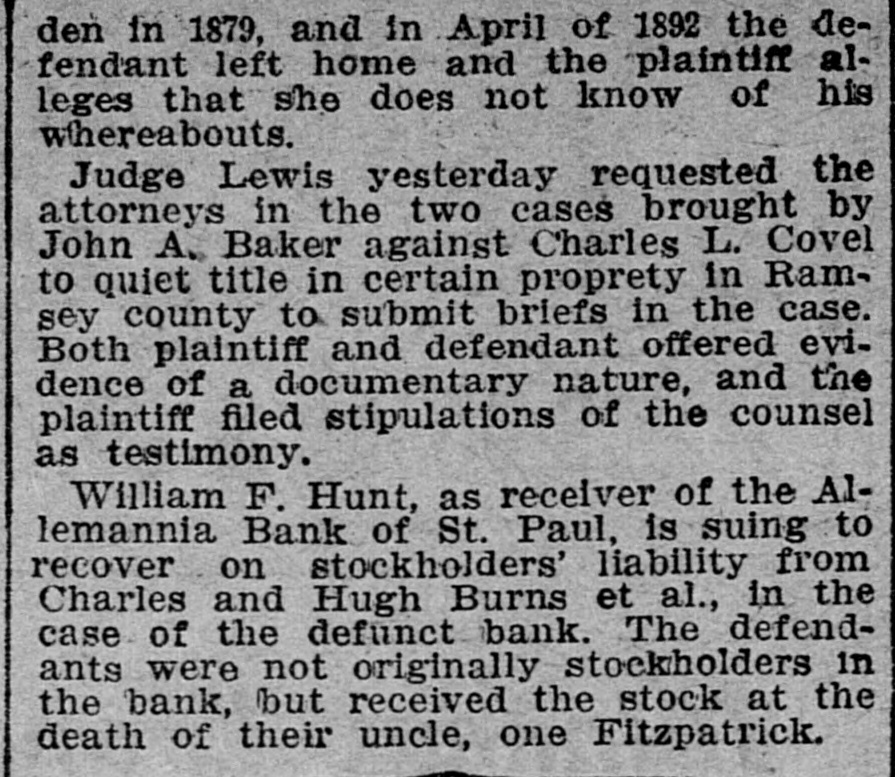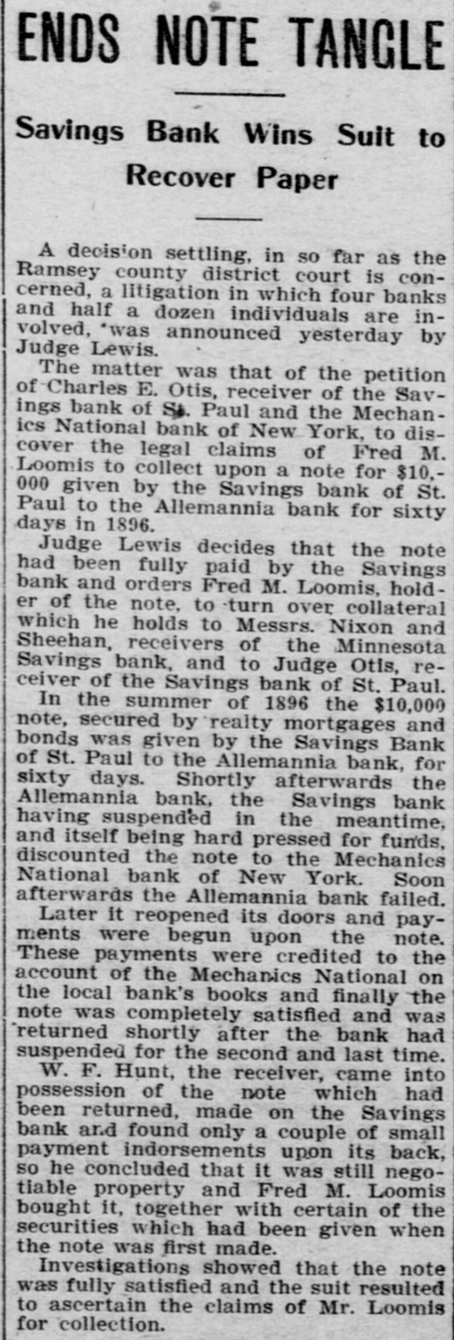 COURT NAMES RECEIVER WILLIAM F. HUNT IS PLACED IN CHARGE OF THE ALLEMANNIA BANK SALARY IS FIXED AT $1,500 Receiver Is Directed to Enforce Statutory Liability of Stockholders and Convert Assets Into Money. William F. Hunt was yesterday appointed receiver of the Allemannia bank by Judge Lewis of the district court. The appointment was made upon the application of W. B. Douglas, attorney general of this state. The court orders that said receiver shall file a bond for $15,000, to be signed by one or more good sureties, and that he shall take charge of the property of said institution and collect, sue for and recover the debts and demands now due, and if necessary, enforce the statutory individual liability of the stockholders of said bank. He shall also, as speedily as possible, convert the bank's property and effects into money and in due time, as the court may direct, apply the same to the debts of said bank. The court fixed the salary of the receiver at $1,500 a year, to be paid in monthly installments of $125.