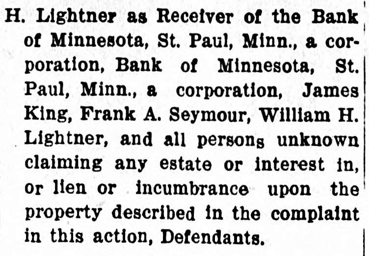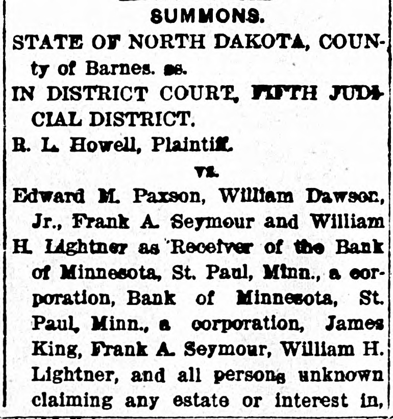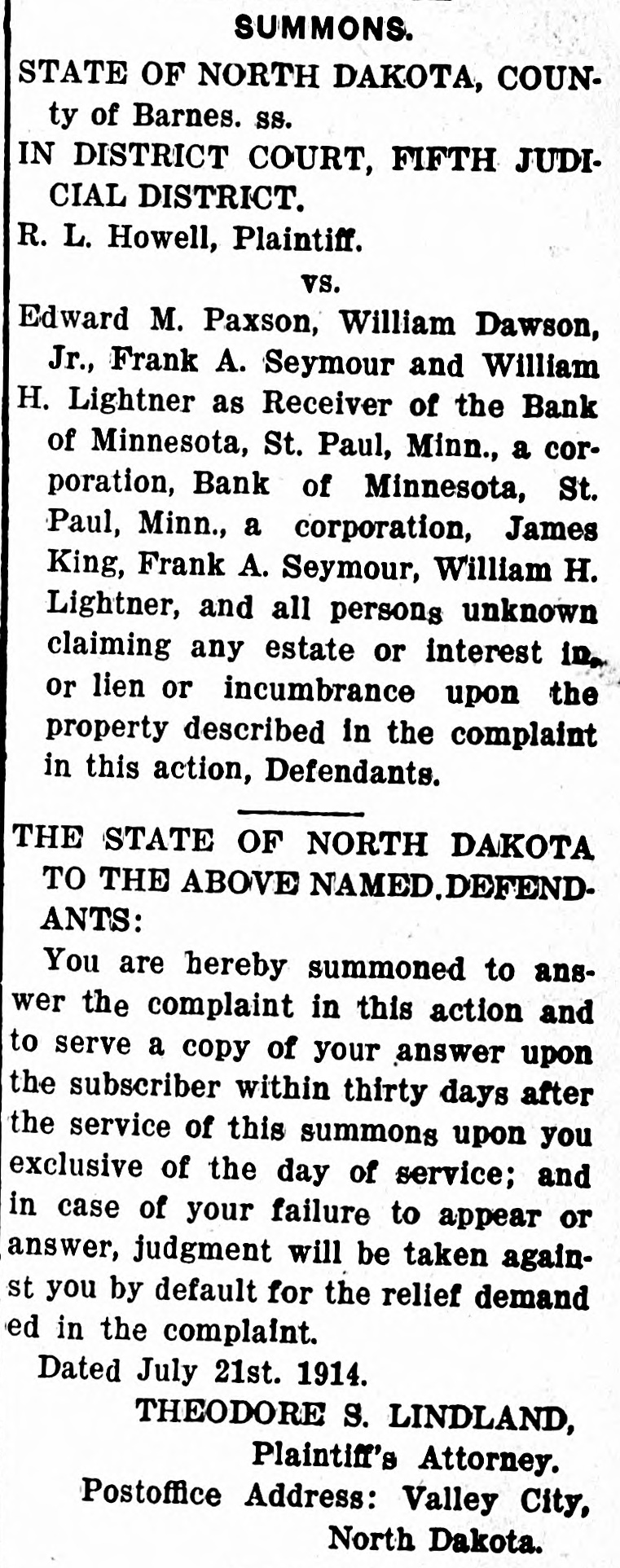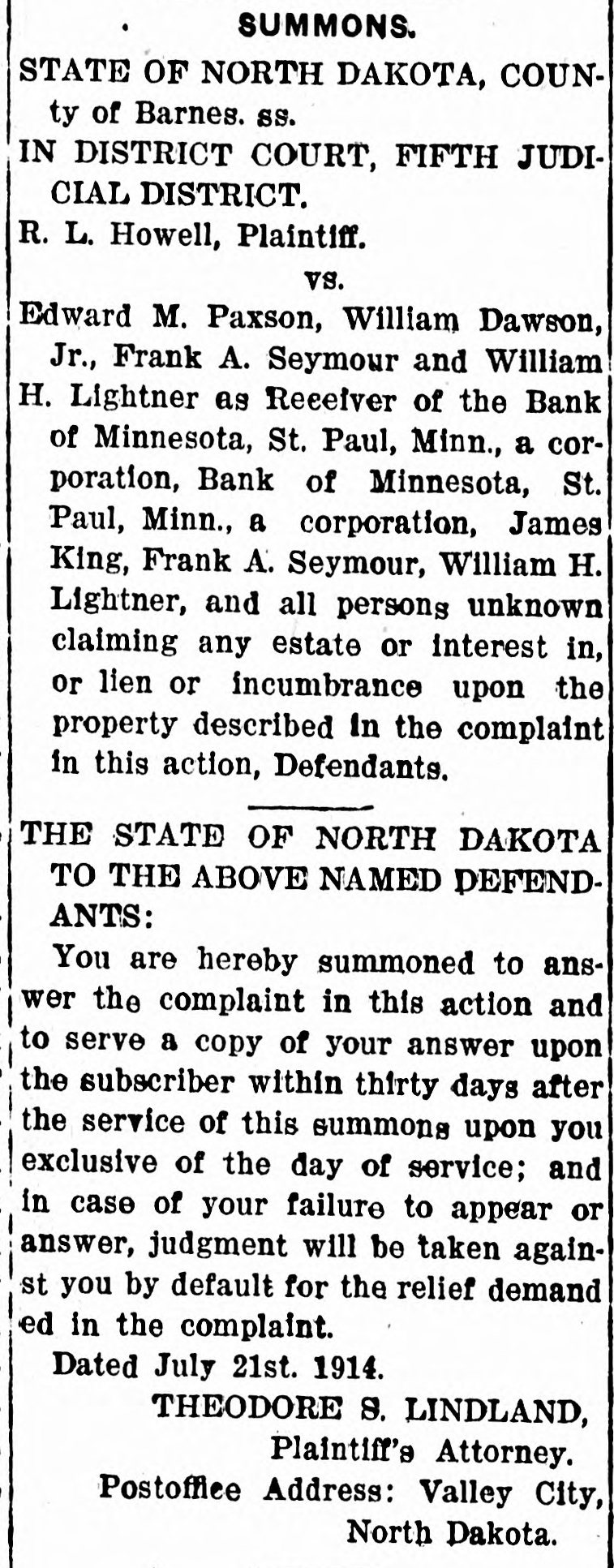 SUMMONS. STATE OF NORTH DAKOTA, COUNty of Barnes. SS. IN DISTRICT COURT, FIFTH JUDICIAL DISTRICT. R. L. Howell, Plaintiff. VS. Edward M. Paxson, William Dawson, Jr., Frank A. Seymour and William H. Lightner as Receiver of the Bank of Minnesota, St. Paul, Minn., a corporation, Bank of Minnesota, St. Paul, Minn., a corporation, James King, Frank A. Seymour, William H. Lightner, and all persons unknown claiming any estate or interest in or lien or incumbrance upon the property described in the complaint in this action, Defendants. THE STATE OF NORTH DAKOTA TO THE ABOVE NAMED.DEFENDANTS: You are hereby summoned to answer the complaint in this action and to serve a copy of your answer upon the subscriber within thirty days after the service of this summons upon you exclusive of the day of service; and in case of your failure to appear or answer, judgment will be taken against you by default for the relief demand ed in the complaint. Dated July 21st. 1914. THEODORE S. LINDLAND, Plaintiff's Attorney. Postoffice Address: Valley City, North Dakota.