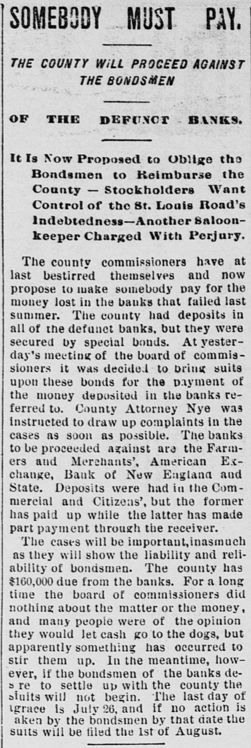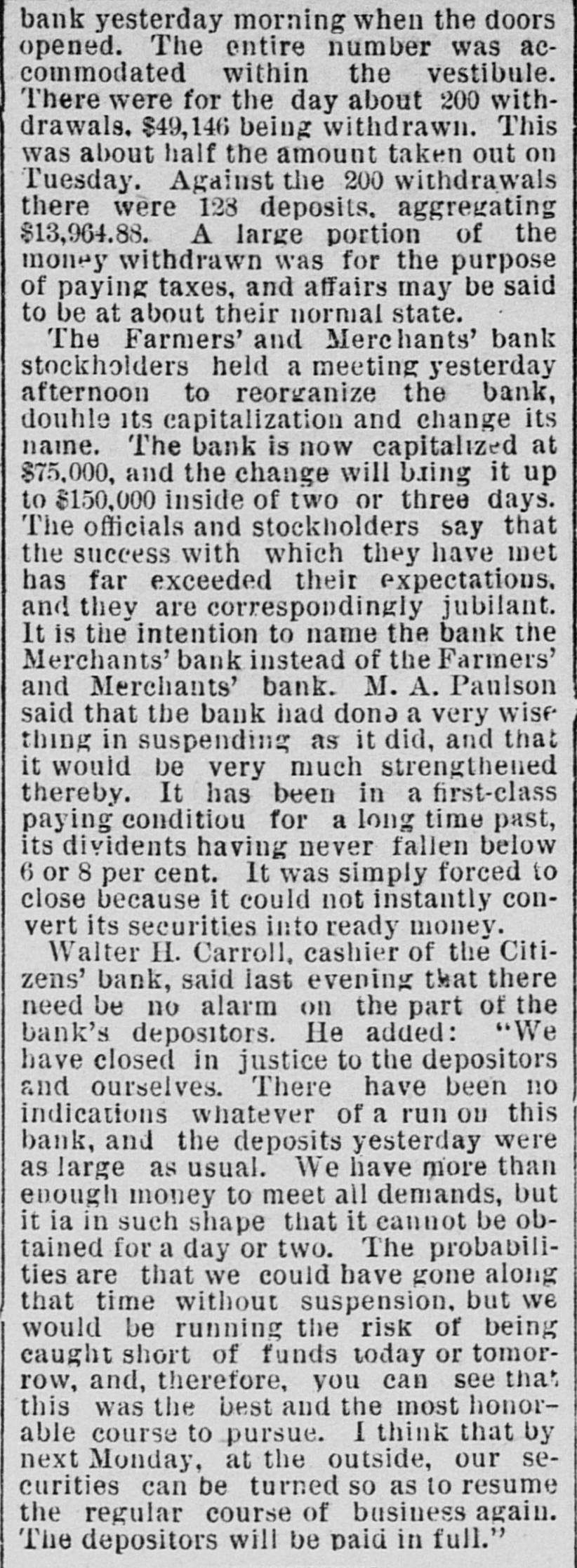# BANK REORGANIZED bank yesterday morning when the doors opened. The entire number was accommodated within the vestibule. There were for the day about 200 withdrawals, $49,146 being withdrawn. This was about half the amount taken out on Tuesday. Against the 200 withdrawals there were 128 deposits, aggregating $13,964.88. A large portion of the money withdrawn was for the purpose of paying taxes, and affairs may be said to be at about their normal state. The Farmers' and Merchants' bank stockholders held a meeting yesterday afternoon to reorganize the bank, double its capitalization and change its name. The bank is now capitalized at $75,000, and the change will bring it up to $150,000 inside of two or three days. The officials and stockholders say that the success with which they have met has far exceeded their expectations, and they are correspondingly jubilant. It is the intention to name the bank the Merchants' bank instead of the Farmers' and Merchants' bank. M. A. Paulson said that the bank had done a very wise thing in suspending as it did, and that it would be very much strengthened thereby. It has been in a first-class paying condition for a long time past, its dividents having never fallen below 6 or 8 per cent. It was simply forced to close because it could not instantly convert its securities into ready money. Walter H. Carroll, cashier of the Citizens' bank, said last evening that there need be no alarm on the part of the bank's depositors. He added: "We have closed in justice to the depositors and ourselves. There have been no indications whatever of a run on this bank, and the deposits yesterday were as large as usual. We have more than enough money to meet all demands, but it is in such shape that it cannot be obtained for a day or two. The probabilities are that we could have gone along that time without suspension, but we would be running the risk of being caught short of funds today or tomorrow, and, therefore, you can see that this was the best and the most honorable course to pursue. I think that by next Monday, at the outside, our securities can be turned so as to resume the regular course of business again. The depositors will be paid in full."