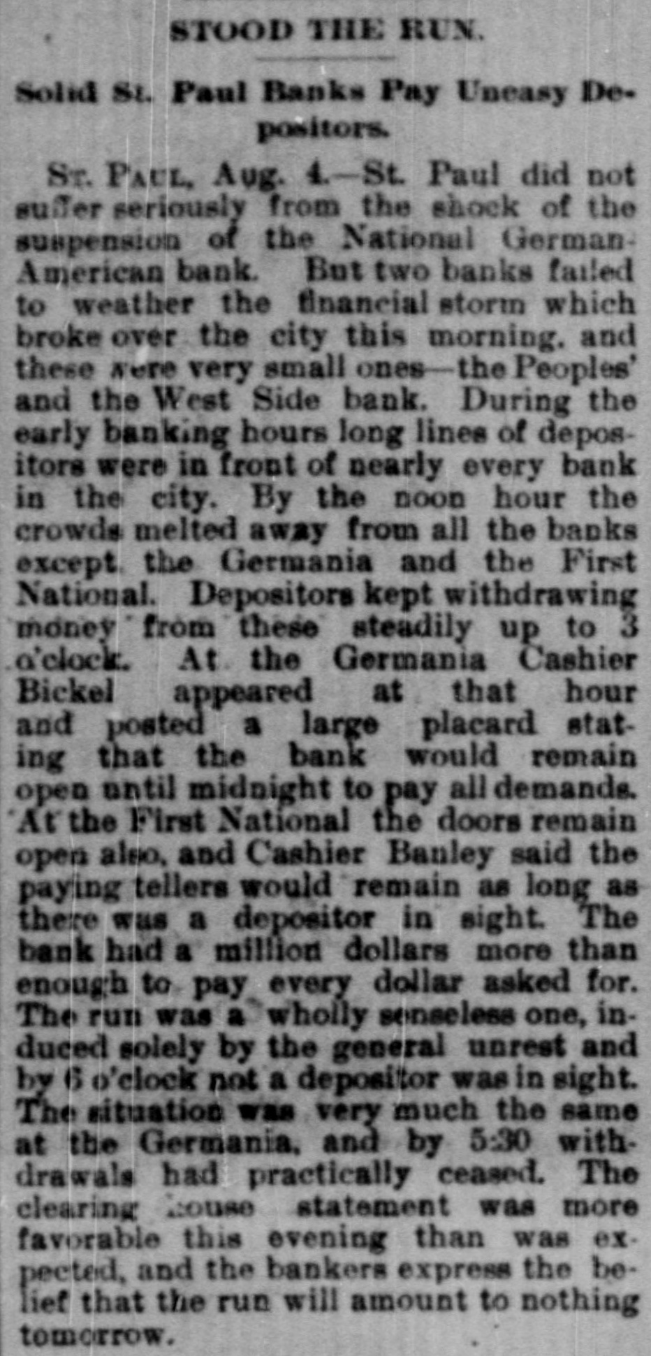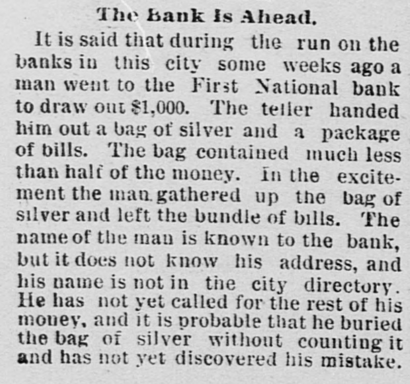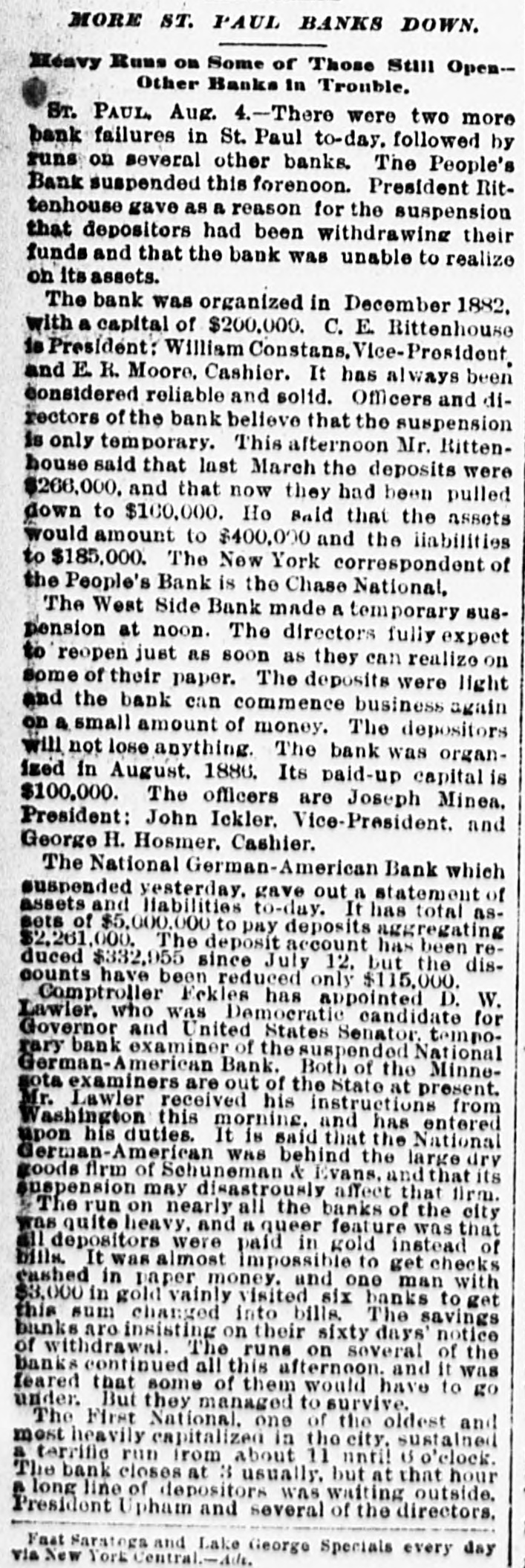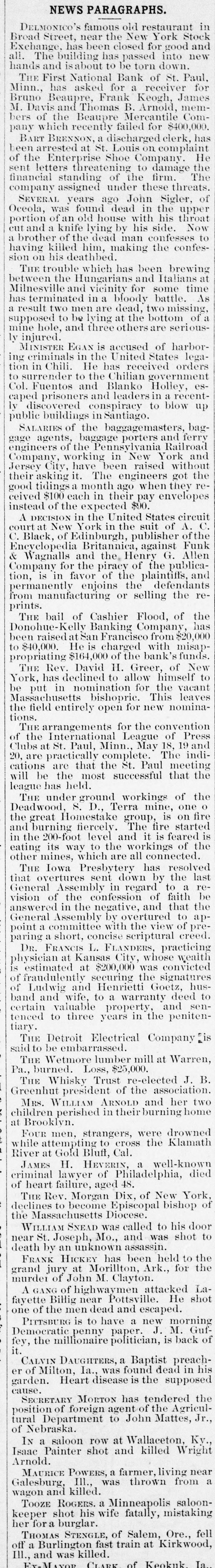 in old NEWS PARAGRAFILLE restaurant Stock DELMONICO'S near famous the New for York good and Broad Street, been closed into new hands building has torn down. all. Exchange The and isabout has to Bank be passed of St. Paul. First National for a receiver James for Minn., has Frank memBruno THE Beaupre, asked B. Keogh, Arnold, ComDavis ano Thomas Mercantile $400,000. bers M. of the recently Beaupre failed for clerk, has BART BRENNON, St. Louis pany which a discharged on complaint He been arrested at Shoe Company. damage the of the Enterprise threatening to firm. The sent letters of the these threats. John financial standing assigned under Sigler, of company SEVERAL years found ago dead with in the his throat upper I | a portion Oceola, of was knife an old lying house by man his confesses side. Now to killed cutand brother of a of the him, "dead making the confession having on trouble his deathbed which has and been Italians brewing time at between THE the Hungarians vicinity for some battle. As and in a bloody dead, two missing, of result two to men be lying at others the are ly a has mine supposed hole, and three are bottom of serious- harbor- a injured. EGAN is accused United States orders legain Chili. Chilian MINISTER criminals in the received nment tion ing to surrender to and He the has Blanko government Holley, in a recent- esCol. Fuentos prisoners conspiracy and leaders to blow up lv caped discovered in Santiago. bagpublic buildings of the baggagemasters porters ferry SALARIES baggage vylvania Railroad and been the got engineers gage agents, of working the Pennsylvill in New raised York without Company Jersey City, it. have The engineers when they retheir tidings asking a month their ago pay envelopes instead good ceived $100 of the each in expected the in United $90. suit States of circuit A. the court A Black, DECISION at New of Edinburgh, York Britannica, in the publisher against G. Allen of Funk C. Encyclopedi and the Henry of the publica& Wagnalls for the piracy the plaintiffs, defendants and Company favor of the retion, from is in enjoins or selling the of the Cashier Flood, has prints. THE bail Kelly of Banking Company, from $20,000 raised charged Donohue- at San Francisco with misap- funds. to New to been propriating $40,000. He $164, is 000 of H. the Greer, bank's himself of for THE Rev: declined David to allow the vacant leaves York, put has in nomination bishopric. This nominabe Massachusetts open for new tions. the field arrangements entirely for League the convention 18, of 19 and Press THE International May The indications of the at St. Paul, complete. Paul meeting the most 20, Clubs are practically are that the successful St. that the the league will be has held. ground workings mine, of one THE under D., Terra is on fire Deadwood Homestake S. group The fire feared started is the great burning fiercely level and workings it is of the eating its which are has and in the 200-foot way to the all connected. resolved other mines, Presbytery by the last reIowa sent down to a THE overtures Assembly in regard of faith the be General that the negative, fession and that to apvision of in the by overtured view of preanswered Assembly with scriptural the creed. DR. General point paring a a committee short, concise L. FLANDERS, whose practicing wealth FRANCIS Kansas City, was convicted is physician e estimated fraudulently at at securing Henrietti $200,000 the Goetz, signatures deed hus- to of and warranty and senof band certain Ludwig and valuable wife, three to years property, a in the penitentenced tiary. Detroit to Electrical Company Warren, said THE to be embarrassed. lumber mill at B. THE Wetmore Loss, $25,000. re-elected J. Pa., burned. Trust of the association. two Greenhut THE MRS. Whiskydent WILLIAM perished president ARNOLD in their burning and drowned her home at children per. Brooklyn. FOUR men, strangers, to cross were the Klamath while attempting.to Cal. well-known JAMES lawyer of 48. River at Gold H. a died York, of criminal heart Rev. failure, Morgan aged Episcopal Dix, of New bishop of SNEAD and was the declines THE Massachusetts to husetts become was Diocese. called to his shot door to death near FRANK WILLIAM St. by Joseph, an HICKEY unknown Mo., brillton, has assassin. been Ark., held for to the La- the jury John at M. Clayton tacked grand murder GANG of of highw wayment He shot fayette A the Billig men near dead and a new M. morning the fey, a Baptist one Democratic Pomaire PITTSBURG of penny is to have politician, J. is preach- back Guf- of dead his garden. has er it CALVIN of Milton, Heart DAUGHTERS, Ia., disease was found is the tendered supposed the the Agriculpositionepartment cause. SECRETARY of foreign MORTON agent to John of Mattes, Jr., Ky., of tural IN Nebraska. a Painter saloon shot row at and Wallacetownight killed living near Ill., Arnold. Isaac MAURICE POWERS, was a farmer,1 thrown from a saloonshot wagon Galesburg: TOOZE and ROGERS. killed. his wife a Minneapolinistaking fatally, fell Ore., THOMAS fast 11., her keeper for a burglar. STENGLE, of train Salem, at Kirkwood, YOR off a Burlingtoned. and was of Keokuk La
