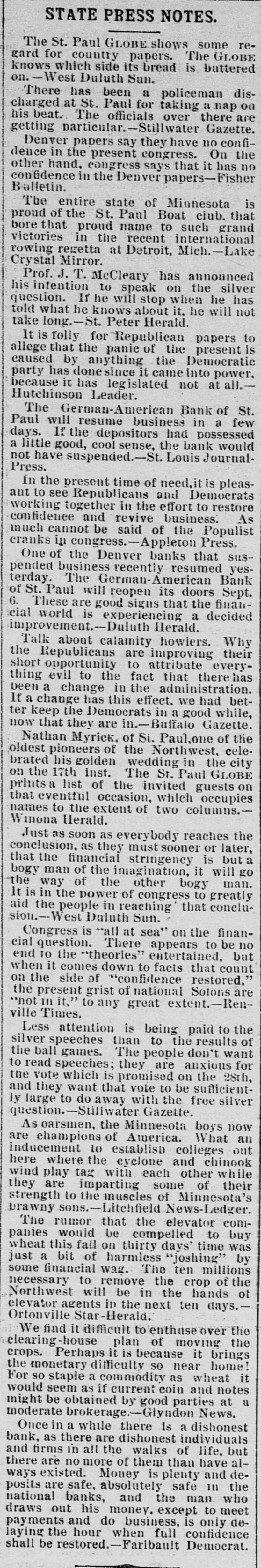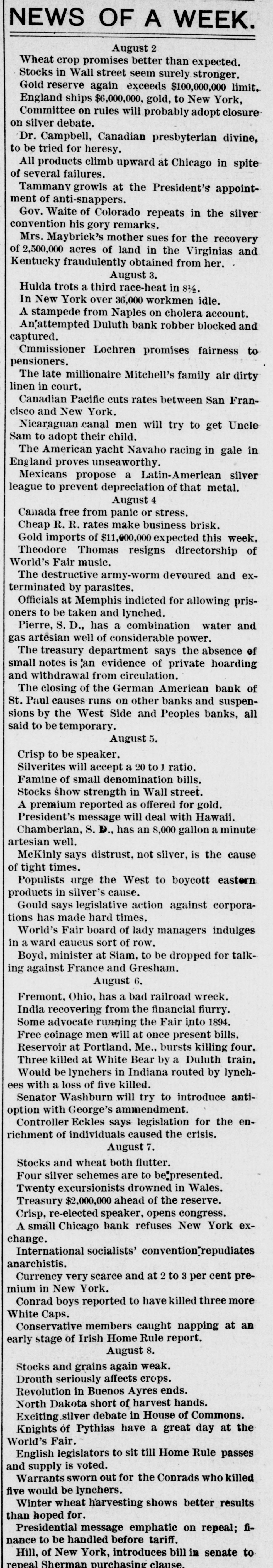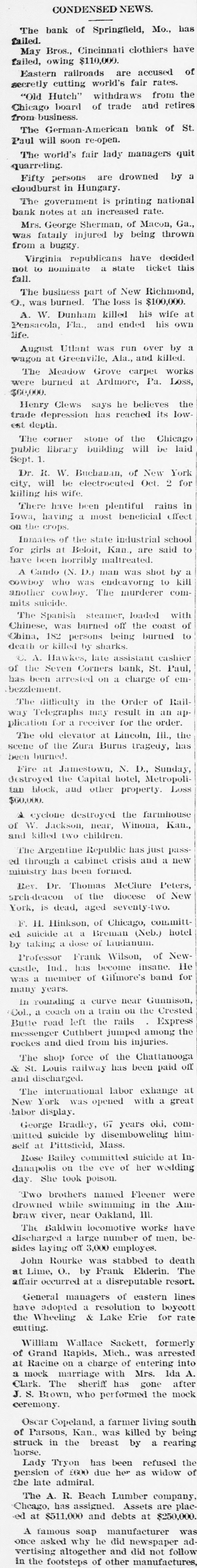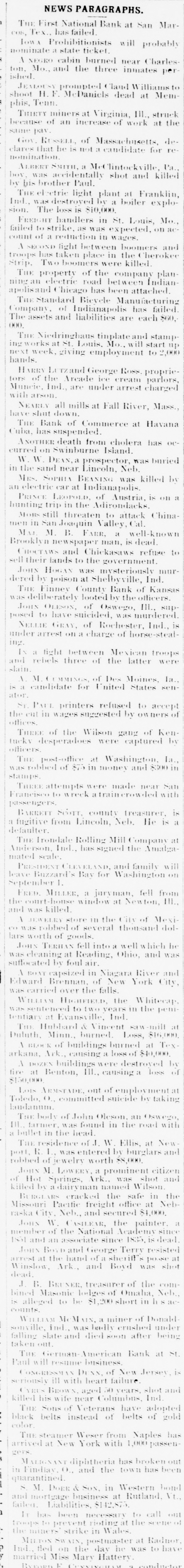 THE el etric light plant at Franki Ind., was destroved by a boiler exp sion. The loss is $10,000. FREIGHT handlers in St. Louis, M failed to strike, as was expected, on count of a reduction 10 wages. \ SECOND fight between boomers a troops has taken place in the herok Strip, Two boomers were killed. THE property of the company pla ming an electric road between India apolisand bicago has been attached THE Standard Bievele Manufacturi Company, of Indianapolis has faile The assets and liabilities are each $6 000. THE Niedringhaus timplate and stan ing works at St. Louis. Mo., will start next week. giving employment to 2,0 hands. ARRY Lt rzand George Ross. propr tors of the Areade ice cream parlo Muncie, Ind., are under arrest charg with arson. NEARLY all mills at Fall River, Mas have shut down. THE Bank of Commerce at Hava Cuba, has suspended. ANOTHER death from cholera has curred on Swinburne Island. W. W. DEAN,a prospector, was buri in the sand near Lincoln, Neb. MRS. SOPHIA BEANING was killed an electric car at Indianapolis. PRINCE LEOPOLD, of Austria, is of hunting trip in the Adirondacks. MOBS still threaten to attack Chir men in San Joaquin Valley, Cal. MAIL M. B. FARR, a well-kno Brookly newspaper man, is dead. CHOCTAWS and Chickasaws refuse sell their lands to the government. JOHN HOGAN was mysteriously mi dered by poison at Shelbyville, Ind. THE Finney County Bank of Kans was deliberately looted by the officers JOHN OLESON, of Oswego, III., SI posed to have suicided, was murder NELLIE GRAY, of Rochester, Ind under arrest on a charge of horse-ste ing. IN a fight between Mexican troo and rebels three of the latter we slain 1. M. MMINGS, of Des Moines, I IS a candidate for United States NE ator. ST. PAUL printers refused to acce the cut in wages suggested by owners offices. THREE of the Wilson gang of Ke tucky desperadoes were captured officers. THE post-office at Washington, I was robbed of $75 in money and $300 stamps. THREE attempts were made near S Francisco to wreck atraincrowded " passengers. BARRETT Scorr. county treasurer a fugitive from Lincoln, Neb. He is defaulter. THE Irondale Rolling Mill Company Anderson, Ind., has signed the Annal: mated scale. PRESIDENT CLEVELAND, and family " leave Buzzard's Bay for Washington September 1. FRED. MILLER, a juryman, fell fro the court-house window at Newton, I and was killed. \ JEWELRY store in the City of Me CO was robbed of several thousand de lars worth of goods. JOHN TERHAN fell into a well which was cleaning at Reading, Ohio, and " suffocated by foul air. \ BOAT capsized in Niagara River a Edward Brennan, of New York Ci was.carried over the falls. WILLIAM HIGHFIELD, the Whitee: was sentenced to two years 111 the pe tentiary at Evansville, Ind. THE Hubbard & Vincent saw mill Duluth. Minn., burned. Loss, $16.0 \ BLOCK of buildings burned at T. arkana, Ark., causing a loss of $40,000 \ DOZEN buildings were destroved fire at Benton, III., causing a loss $150,000 Lois ARMSTADE, ont of employment Toledo, O., committed suicide by taki laudanum. THE body of John Oleson, an Oswes 111. farmer, was found in the road " a bullet in the head. THE residence of .I. W. Ellis, at No port, R. 1., was entered by burglars a robbed of jewelry worth $8,000. JOHN M. LOWERY, a prominent citiz of Hot Springs, Ark., was shot killed by a dairy named Wilson. BURGI VRS cracked the safe in 1 Missouri Pacific freight office at No raska City, Neb., and secured $1,000. JOHN W. ASILEAR, the painter member of the National Academy sit 1851 and an associate since 1835. is JOHN BOYD and George Terry resist arrest at the hand of a sheriff's posse Winslow, Ark., and Boyd was si dead. J. B. BRT NER. treasurer of the CO bined Masonic lodges of Omaha, No IS alleged to be $1,200 short in h counts. WILLIAM Mo MAIN, a miner of Dona souville, ind., was badly erushed 11110 falling slate and died soon after bei taken out. THE German American Bank at Paul will resume business. CONGRESSMAN DENN. of New Jersey seriously ill with heart failure. CYRUS BROWN. aged 50 years, shot killed his wife near Columbus, Ind THE Sons of Veterans have adop black belts instead of belts of g color THE steamer Weser from Naples arrived at New York with 1,000 pass gers. MALIGNANT diphtheria has broken in Findiay, O., and the town has be quarantined. S M. DORR & Sox, in Western be and mortgage business at Rutland. ) failed. Liabilities, $142,875. In has been necessary to call