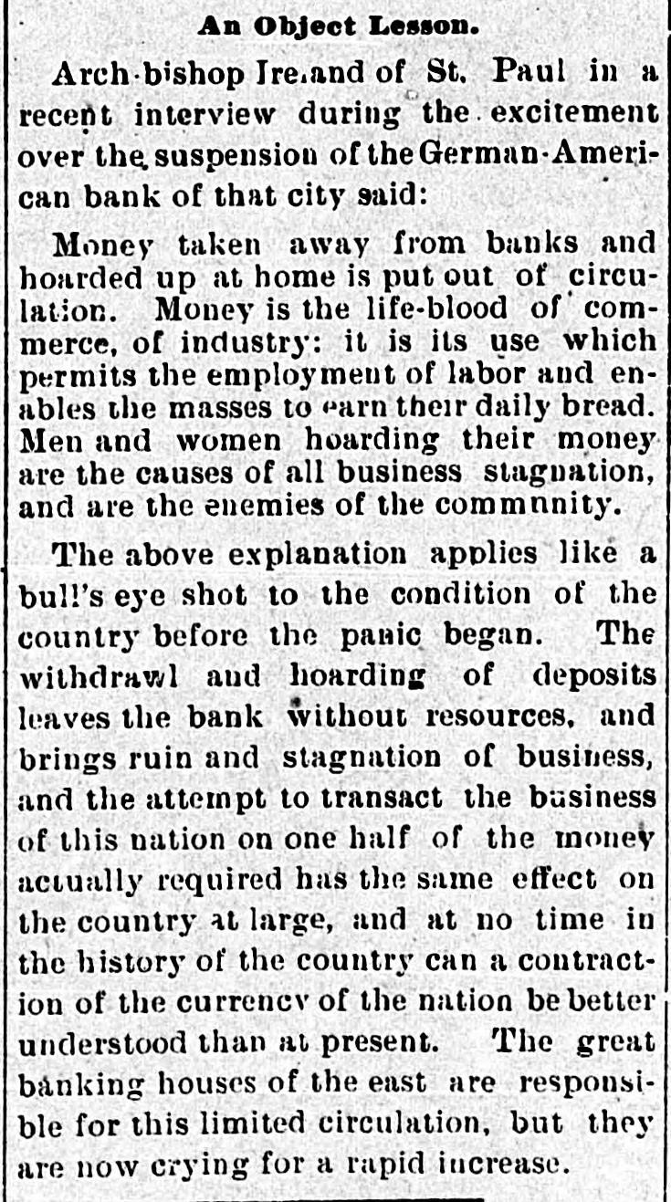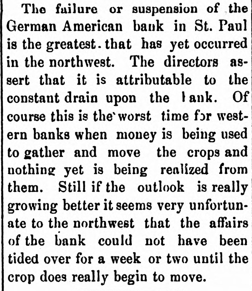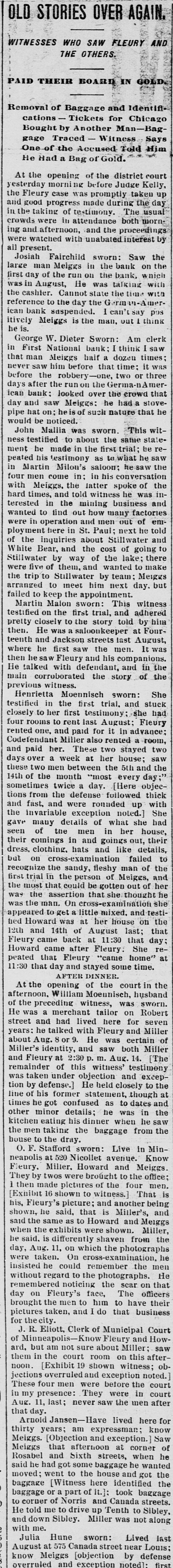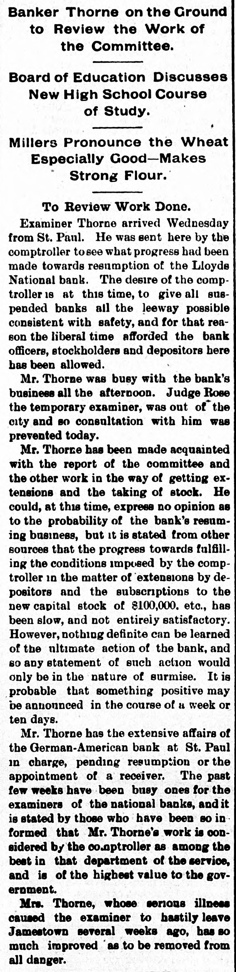 THE el etric light plant at Franki Ind., was destroved by a boiler exp sion. The loss is $10,000. FREIGHT handlers in St. Louis, M failed to strike, as was expected, on count of a reduction 10 wages. \ SECOND fight between boomers a troops has taken place in the herok Strip, Two boomers were killed. THE property of the company pla ming an electric road between India apolisand bicago has been attached THE Standard Bievele Manufacturi Company, of Indianapolis has faile The assets and liabilities are each $6 000. THE Niedringhaus timplate and stan ing works at St. Louis. Mo., will start next week. giving employment to 2,0 hands. ARRY Lt rzand George Ross. propr tors of the Areade ice cream parlo Muncie, Ind., are under arrest charg with arson. NEARLY all mills at Fall River, Mas have shut down. THE Bank of Commerce at Hava Cuba, has suspended. ANOTHER death from cholera has curred on Swinburne Island. W. W. DEAN,a prospector, was buri in the sand near Lincoln, Neb. MRS. SOPHIA BEANING was killed an electric car at Indianapolis. PRINCE LEOPOLD, of Austria, is of hunting trip in the Adirondacks. MOBS still threaten to attack Chir men in San Joaquin Valley, Cal. MAIL M. B. FARR, a well-kno Brookly newspaper man, is dead. CHOCTAWS and Chickasaws refuse sell their lands to the government. JOHN HOGAN was mysteriously mi dered by poison at Shelbyville, Ind. THE Finney County Bank of Kans was deliberately looted by the officers JOHN OLESON, of Oswego, III., SI posed to have suicided, was murder NELLIE GRAY, of Rochester, Ind under arrest on a charge of horse-ste ing. IN a fight between Mexican troo and rebels three of the latter we slain 1. M. MMINGS, of Des Moines, I IS a candidate for United States NE ator. ST. PAUL printers refused to acce the cut in wages suggested by owners offices. THREE of the Wilson gang of Ke tucky desperadoes were captured officers. THE post-office at Washington, I was robbed of $75 in money and $300 stamps. THREE attempts were made near S Francisco to wreck atraincrowded " passengers. BARRETT Scorr. county treasurer a fugitive from Lincoln, Neb. He is defaulter. THE Irondale Rolling Mill Company Anderson, Ind., has signed the Annal: mated scale. PRESIDENT CLEVELAND, and family " leave Buzzard's Bay for Washington September 1. FRED. MILLER, a juryman, fell fro the court-house window at Newton, I and was killed. \ JEWELRY store in the City of Me CO was robbed of several thousand de lars worth of goods. JOHN TERHAN fell into a well which was cleaning at Reading, Ohio, and " suffocated by foul air. \ BOAT capsized in Niagara River a Edward Brennan, of New York Ci was.carried over the falls. WILLIAM HIGHFIELD, the Whitee: was sentenced to two years 111 the pe tentiary at Evansville, Ind. THE Hubbard & Vincent saw mill Duluth. Minn., burned. Loss, $16.0 \ BLOCK of buildings burned at T. arkana, Ark., causing a loss of $40,000 \ DOZEN buildings were destroved fire at Benton, III., causing a loss $150,000 Lois ARMSTADE, ont of employment Toledo, O., committed suicide by taki laudanum. THE body of John Oleson, an Oswes 111. farmer, was found in the road " a bullet in the head. THE residence of .I. W. Ellis, at No port, R. 1., was entered by burglars a robbed of jewelry worth $8,000. JOHN M. LOWERY, a prominent citiz of Hot Springs, Ark., was shot killed by a dairy named Wilson. BURGI VRS cracked the safe in 1 Missouri Pacific freight office at No raska City, Neb., and secured $1,000. JOHN W. ASILEAR, the painter member of the National Academy sit 1851 and an associate since 1835. is JOHN BOYD and George Terry resist arrest at the hand of a sheriff's posse Winslow, Ark., and Boyd was si dead. J. B. BRT NER. treasurer of the CO bined Masonic lodges of Omaha, No IS alleged to be $1,200 short in h counts. WILLIAM Mo MAIN, a miner of Dona souville, ind., was badly erushed 11110 falling slate and died soon after bei taken out. THE German American Bank at Paul will resume business. CONGRESSMAN DENN. of New Jersey seriously ill with heart failure. CYRUS BROWN. aged 50 years, shot killed his wife near Columbus, Ind THE Sons of Veterans have adop black belts instead of belts of g color THE steamer Weser from Naples arrived at New York with 1,000 pass gers. MALIGNANT diphtheria has broken in Findiay, O., and the town has be quarantined. S M. DORR & Sox, in Western be and mortgage business at Rutland. ) failed. Liabilities, $142,875. In has been necessary to call