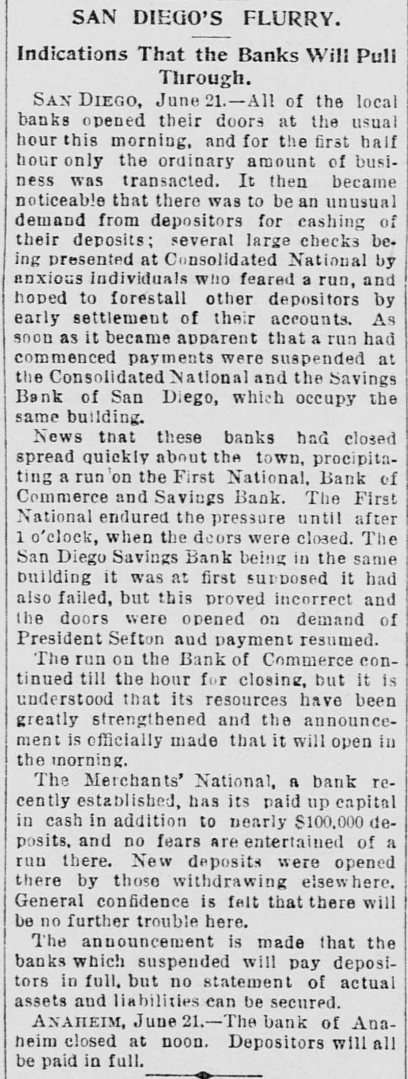 SAN DIEGO'S FLURRY. Indications That the Banks Will Pull Through. SAN DIEGO, June 21.-All of the local banks opened their doors at the usual hour this morning, and for the first half hour only the ordinary amount of business was transacted. It then became noticeable that there was to be an unusual demand from depositors for cashing of their deposits; several large checks being presented at Consolidated National by anxious individuals who feared a run, and hoped to forestall other depositors by early settlement of their accounts. As soon as it became apparent that a run had commenced payments were suspended at the Consolidated National and the Savings Bank of San Diego, which occupy the same building. News that these banks had closed spread quickly about the town, procipitating a run on the First National, Bank of Commerce and Savings Bank. The First National endured the pressure until after 1 o'clock, when the deors were closed. The San Diego Savings Bank being in the same building it was at first supposed it had also failed, but this proved incorrect and the doors were opened on demand of President Sefton and payment resumed. The run on the Bank of Commerce continued till the hour for closing, but it is understood that its resources have been greatly strengthened and the announcement is officially made that it will open in the morning. The Merchants' National, a bank recently established, has its paid up capital in cash in addition to nearly $100,000 deposits, and no fears are entertained of a run there. New deposits were opened there by those withdrawing elsew here. General confidence is felt that there will be no further trouble here. The announcement is made that the banks which suspended will pay depositors in full, but no statement of actual assets and liabilities can be secured. ANAHEIM, June 21.-The bank of Anaheim closed at noon. Depositors will all be paid in full.