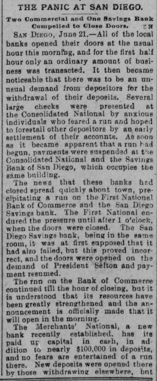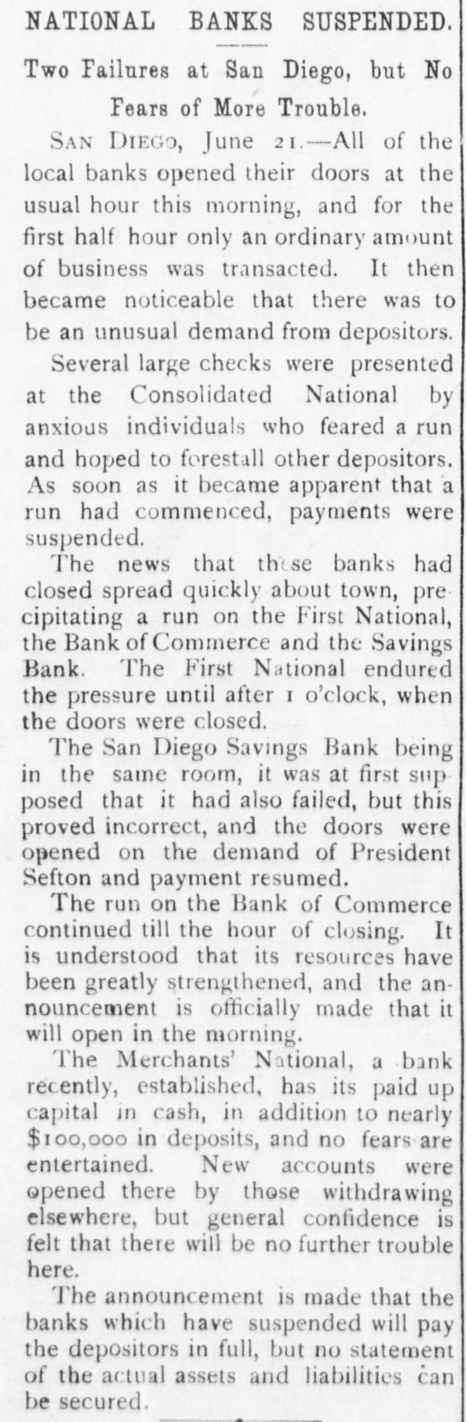 THE PANIC AT SAN DIEGO. Two Commercial and One Savings Bank N Compelled to Close Doors. z SAN DIEGO, June 21.-All of the local banks opened their doors at the usual hour this morning, and for the first half hour only an ordinary amount of business was transacted. It then became noticeable that there was to be an unusual demand from depositors for the withdrawal of their deposits. Several large checks were precented at the Consolidated National by anxious individuale who feared a run and hoped to foreetall other depositors by an early settlement of their accounts. As soon as it became apparent that a run had begun, payments were suspended at the Consolidated National and the Savings Bank of San Diego, which occupies the same building. The news that these banks had closed spread quickly about town, precipitating a run on the First National Bank of Commerce and the San Diego Savings bank. The Firet National endured the pressure until after 1 o'clock, when the doors were closed. The San Diego Savinga bank, being in the same room, it was at first supposed that it had also failed, but this proved incorrect, and the doors were opened on the demand of President Sefton and payment reenmed. The rnn on the Bank of Commerce continued till the hour of closing, but it is understood that its resources have been greatly strengthened and the announcement is officially made that it will open in the morning. The Merchants' National, a new bank recently established, has its paid up capital in cash, in addition to nearly $100,000 in deposits, and no fears are entertained of a run there. New deposits were opened there by those withdrawing elsewhere, bnt