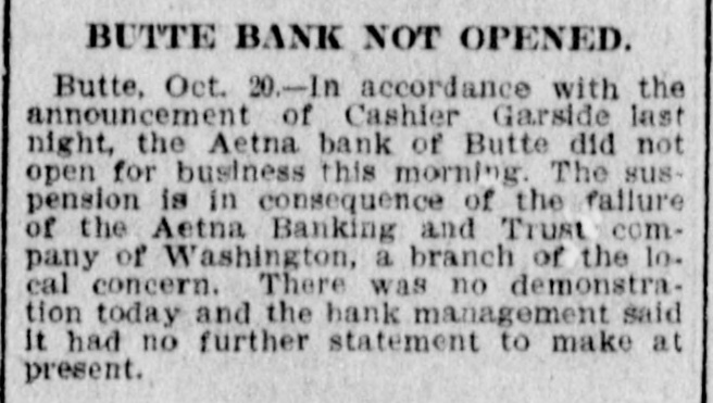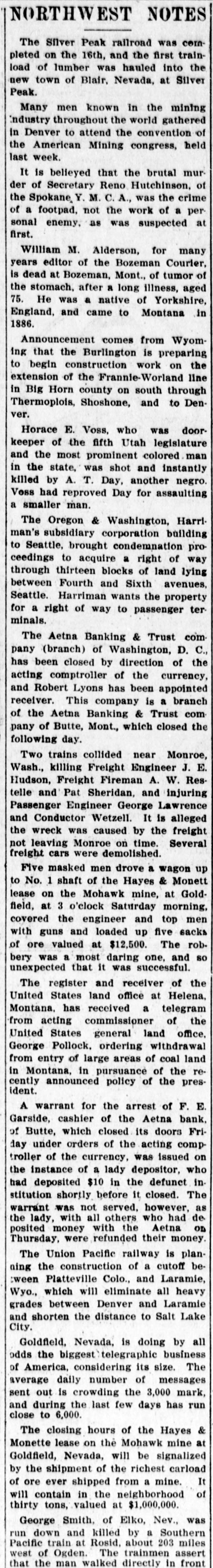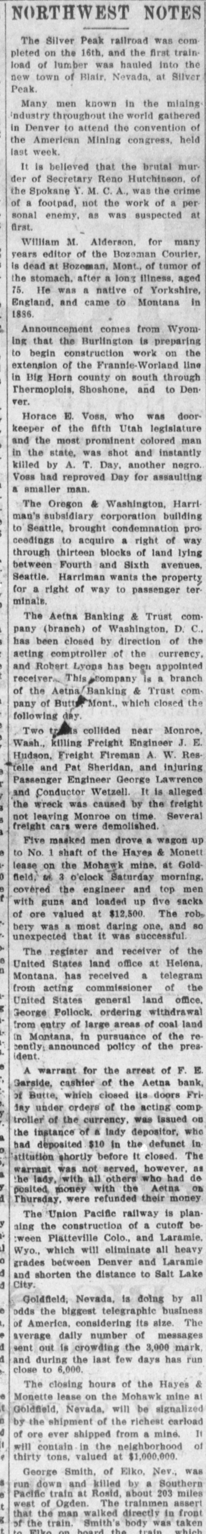 NORTHWEST NOTES The Silver Peak railroad was completed on the 16th, and the first train load of lumber was hauled into the new town of Blair, Nevada, at Silver Peak. Many men known in the mining Industry throughout the world gathered in Denver to attend the convention of the American Mining congress, held last week. It is believed that the brutal murder of Secretary Reno Hutchinson. of the Spokane was the crime of a footpad, not the work of a personal enemy, as was suspected at first. William M. Alderson, for many years editor of the Bozeman Courier, is dead at Bozeman, Mont., of tumor of the stomach, after a long illness, aged 75. He was a native of Yorkshire, England, and came to Montana in 1886. Announcement comes from Wyoming that the Burlington is preparing to begin construction work on the extension of the Frannie-Worland line in Big Horn county on south through ] Thermoplois, Shoshone, and to Denver. Horace E. Voss, who was doorkeeper of the fifth Utah legislature and the-most prominent colored man in the state, was shot and instantly killed by A. T. Day, another negro. Voss had reproved Day for assaulting a smaller man. Y The Oregon & Washington, Harriman's subsidiary corporation building 0 to Seattle, brought condemnation proceedings to acquire a right of way through thirteen blocks of land lying between Fourth and Sixth avenues, Seattle. Harriman wants the property for a right of way to passenger terminals. : The Aetna Banking & Trust company (branch) of Washington, D. C., #: has been closed by direction of the acting comptroller of the currency and Robert Lyons has been appointed receiver. This company is a branch of the Aetna Banking & Trust company of Butte, Mont., which closed the following day. Two trains collided near Monroe, Wash., killing Freight Engineer J. E. Hudson, Freight Fireman A. W. Restelle and Pat Sheridan, and injuring Passenger Engineer George Lawrence and Conductor Wetzell. It is alleged the wreck was caused by the freight not leaving Monroe on time. Several freight cars were demolished. Five masked men drove a wagon up to No. 1 shaft of the Hayes & Monett lease on the Mohawk mine, at Gold field, at 3 o'clock Saturday morning, covered the engineer and top men with guns and loaded up five sacks of ore valued at $12.500. The robbery was . most daring one, and so ,unexpected that it was successful. The register and receiver of the United States land office at Helena, Montana, has received a telegram from acting commissioner of the United States general land office, George Pollock, ordering withdrawal from entry of large areas of coal land in Montana, in pursuance of the recently announced policy of the presIdent. A warrant for the arrest of F. E Garside, cashier of the Aetna bank of Butte, which closed its doors Friday under orders of the acting comptroller of the currency, was issued on the instance of a lady depositor, who had deposited $10 in the defunct in stitution shortly before it closed. The warrant was not served, however, as the lady, with all others who had de posited money with the Aetna on Thursday, were refunded their money ''he Union Pacific railway is planning the construction of a cutoff be tween Platteville Colo., and Laramie, Wyo., which will eliminate all heavy grades between Denver and Laramie and shorten the distance to Salt Lake City. Goldfield, Nevada, is doing by all odds the biggest telegraphic business of America, considering its size. The average daily number of messages seut out is crowding the 3,000 mark, and during the last few days has run close to 6,000. The closing hours of the Hayes & Monette lease on the Mohawk mine at Goldfield, Nevada, will be signalized by the shipment of the richest carload of ore ever shipped from a mine. It will contain in the neighborhood of thirty tons, valued at $1,000,000. George Smith, of Elko, Nev., was run down-and killed by a Southern Pacific train at Rosid, about 203 miles west of Ogden: The trainmen assert that the man walked directly in front of the train. Smith's body was taken to Elko on board the train which killed him. In the finals of the most important stakes of the national coursing meet t at Hot Springs, S. D., the Waterloo cup was won by Mr. Blue, owned by o Tonkin and Saunders of Butte. Movt., the Waterloo plate was won by Lord t Blake, the property of L. F: Bartles of Denver.
