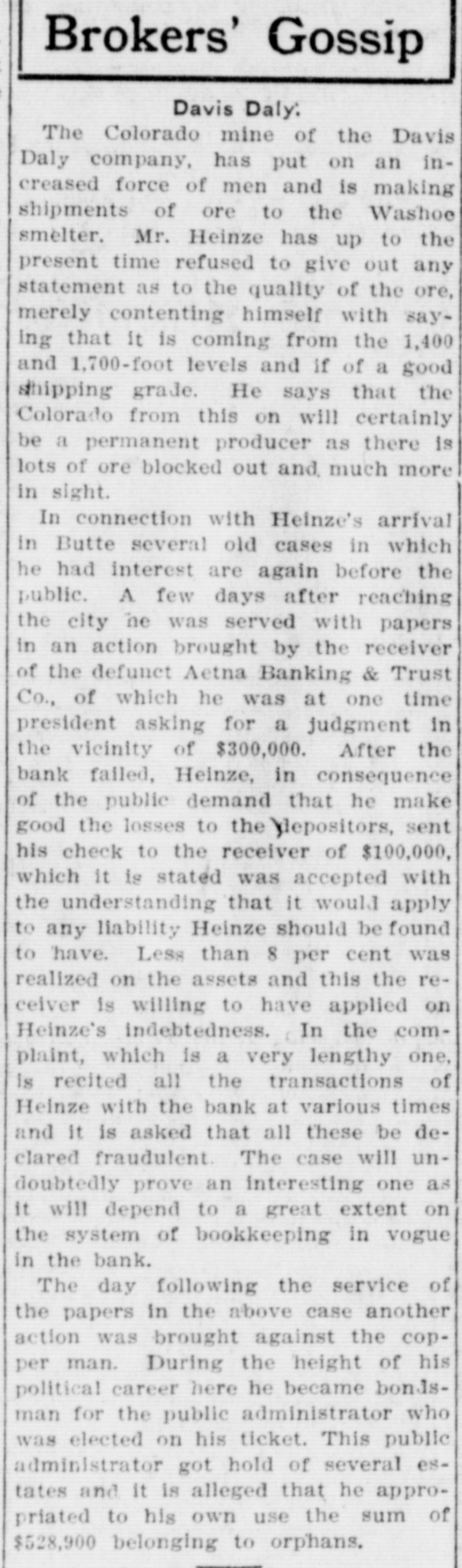Papers were filed in the district court at Butte in a sensational suit against F. Augustus Heinze, in which Robert Lyons, as receiver of the Aetna Banking and Trust company, seeks to recover $250,000 alleged to have been obtained illegally by Heinze.