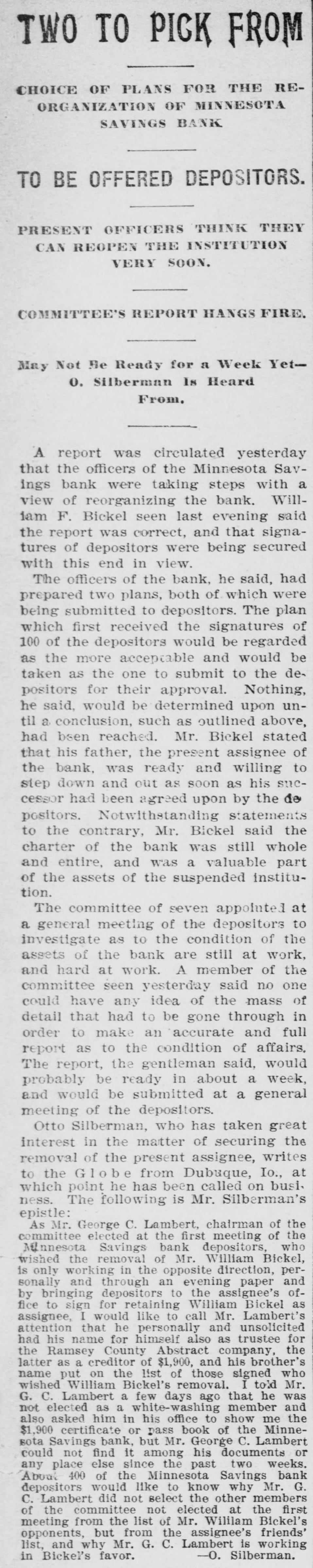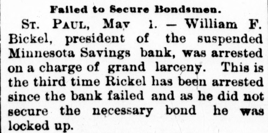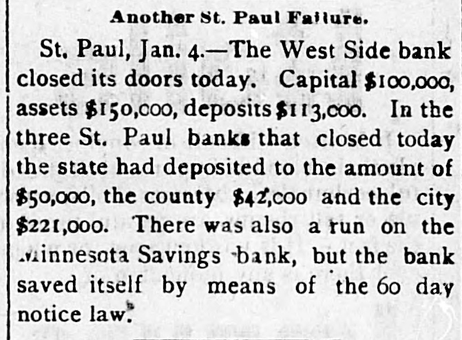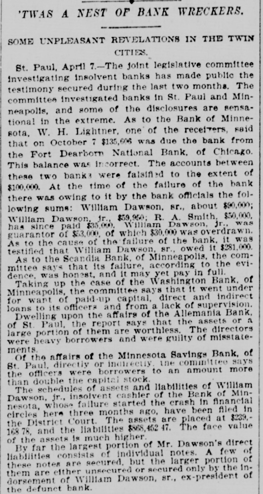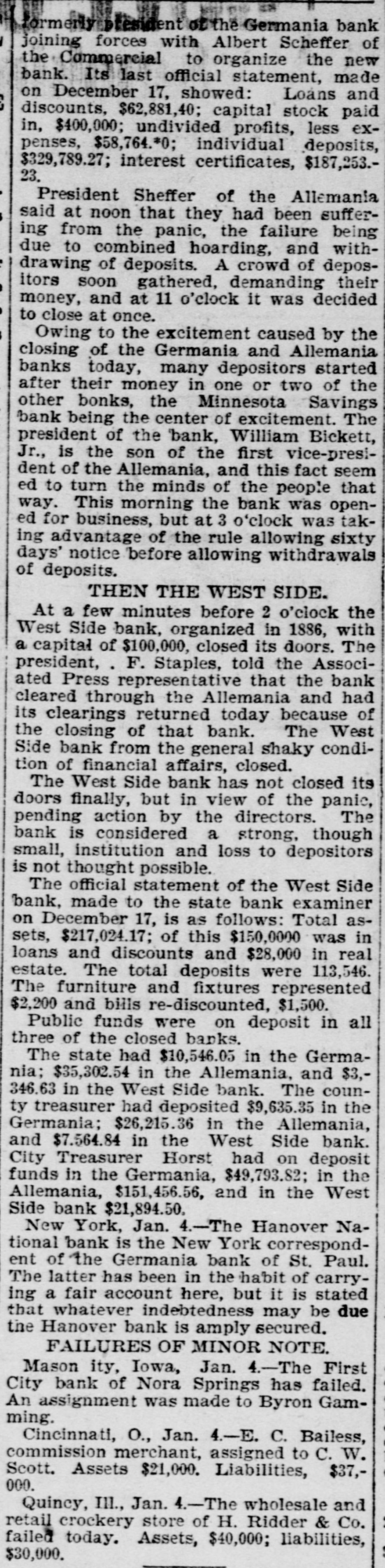 THREE MORE ST. PAUL BANKS. Two Were Large Institutions, the Other Was small. St. Paul, Minn., Jan. 4.-As a direct Minne- rethe closing of the Bank weeks ago, which sota, sult of two and created of started new distrust among depositors were a number of city banks not to be as strong as reputed runs on banks-the the that deposthree St. Paul the Allemania and of them national Germania, itors none wished, institutions, the doors Vest all Side, closely associated-closed their state today, one being in the hands of the asbank examiner and the others making signments. the time that had interv ened During closing of the Bank of Minne- to the Germania paid out sota, since the $225,000 today the frightened depositors, and early the directors concluded they would stop the drain and make an assignment to cashier, Peter M. Keerst. The Allemania bank, which, like the Germania, had a large clientage among and whose vice president the been vice president a the had Germans, formerly target of for Germania, then became the the run. Crowds gathered about the doors lively and fairly fought for a place window. in before the paying teller's such line bank officials realized fully what on The run meant, and promptly called a Bank Examiner Kenyon to take posses- now sion of the bank, and that official is in charge. The West Side bank, a small but possi- Alstronger bank, cleared through the rebly lemania, and today its clearings were turned by the latter institution. Follow~ this there was a decided run inaugu- this ing on the bank, and at 2 o'clock the rated the bank officials closed afternoon and called a meeting of the directors decisdoors decide what action to take. Their to was apparent late in the afternoon, to S. ion filed a deed of assignment H. president of the when Staples, they bank. tied Considerable public money is up m- in three institutions, but there is an in the ple the supply for all immediate needs other banks of the city. The assignment of the Germania and Side banks has brought up a laws some- of West new question in the banking called upwhat state, and the courts will be examiner the settle it. The state bank that on to their right to assign, holding turned doubts should have, under the law, they their assets to him. The attorney acover intimates that he will bring an general tion to test the matter as soon as papers be issued. of can the day numerous reports curDuring among the other banks were of trouble and a few banks suffered runs rent, or lesser intensity, but the that savings algreater were protected by the law before banks them to require 60 days' notice national lows out deposits; and the have no banks paying are in strong condition, and fear of anything of the sort. The Germania Bank. Germania bank was a state insti- The The and had a capital of $400,000. tution official statement of the condition and of last bank, December 21, gave loans resources, I discounts the as $975,420.53; total cap 1 Among the liabilities were undivided $1,625,788. stock, $400,000; surplus and subject ital $58,797; individual deposits certificates of 1 profits, check, $345,191; demand to deposit, $7899; time certificates of deposit, s 3633,019. Germania bank has been organized RamS The ex-Governor Alexander Wilmany being years, a long time president, and say Bickell, cashier. When the governor but liam Mr. Bickell became president, vice f retired, spring Bickell retired, becoming Alle2 last of the newly organized Gusmania president bank. He was succeeded by tav Willius. d Willius told an Associated President representative that the closing was and Press result of an unreasonable panic, the bank would be opened for business usua as the soon as the people regained their cool sense. it bank, as a result of the panicky in o The had paid the depositors $335,000 he fully 1 feeling, last nine days. Willius said by expected the to have the bank reopened the last of March. il The Allemania. r Allemania bank has a capital that of and a clientage similar to o The Allemania was $400,000, the The Germania. of the organ Com last year, as a successor G. ized mercial, William Bickell, formerly forces pres e ident of the Germania, joining Commercial with Albert Scheffer, of the last offl organize a new bank. The show y cial to statement made, December undivided 17, e loans and discounts, $706,842; individua e ed less expenses, $508,764; certificates profits, deposits, $329,789; interest cil n $187,253. President Scheffer, of the Allemania combine n the failure was due to of de twithdrawal said of deposits. A crowd the at positors gathered today demanding decide money, and at 11 o'clock it was to close. Runs on Other Banks. n, to the excitement caused by Alle th Owing of the Germania and the afte ht closing mania banks, many depositors went banks 'S. en their money in one or two other th the Minnesota Savings bank being