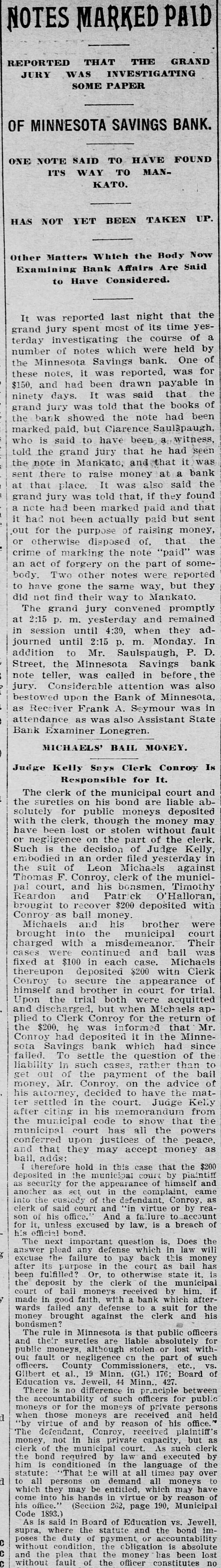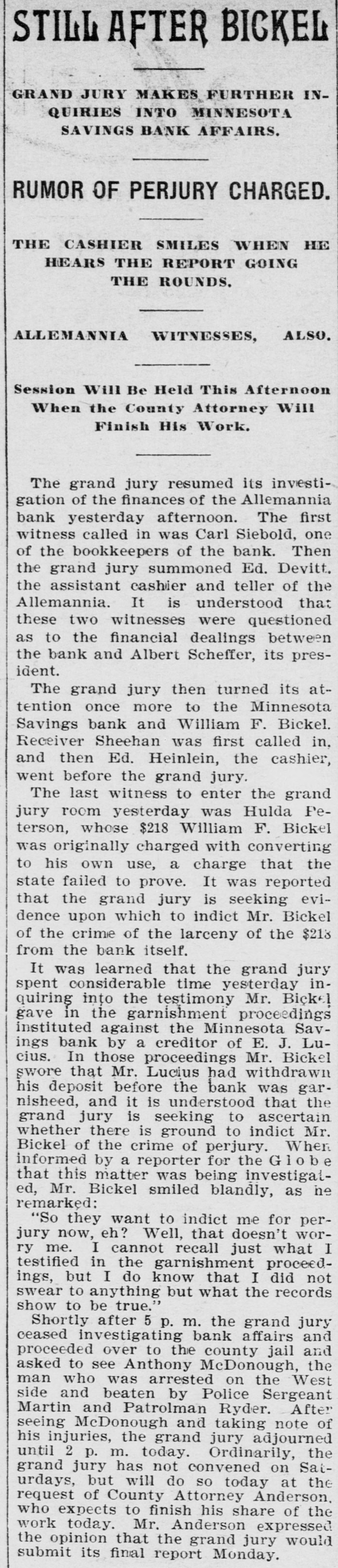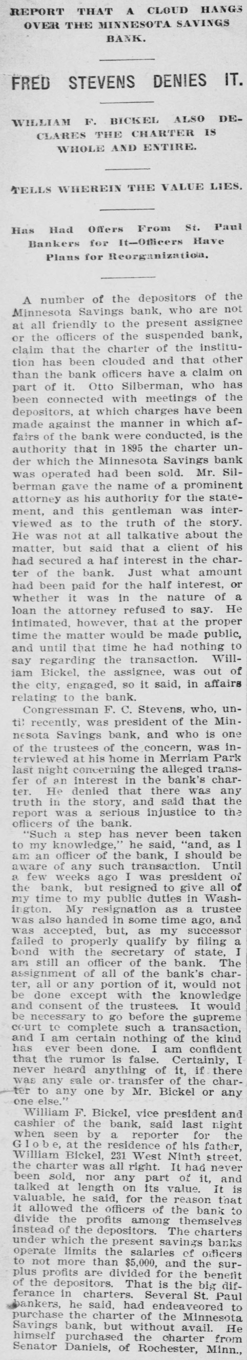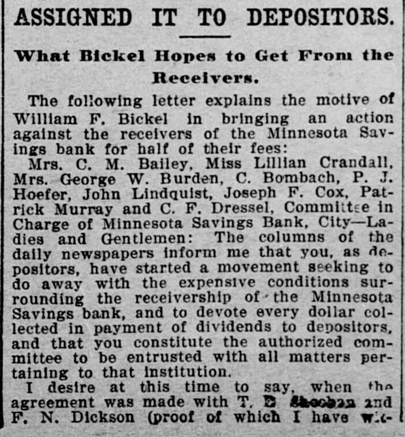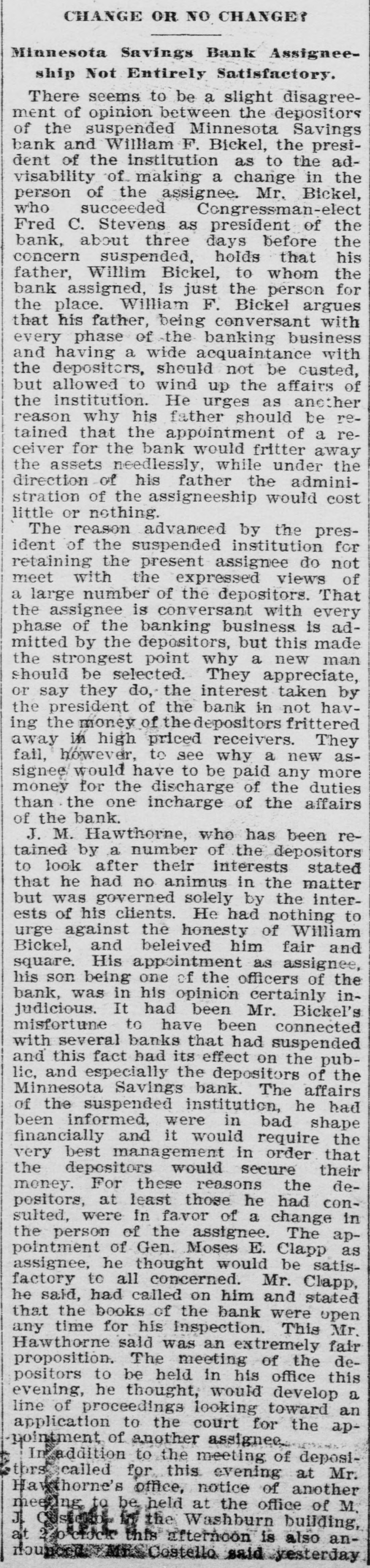THREE MORE ST. PAUL BANKS. Two Were Large Institutions, the Other Was small. St. Paul, Minn., Jan. 4.-As a direct Minne- rethe closing of the Bank weeks ago, which sota, sult of two and created of started new distrust among depositors were a number of city banks not to be as strong as reputed runs on banks-the the that deposthree St. Paul the Allemania and of them national Germania, itors none wished, institutions, the doors Vest all Side, closely associated-closed their state today, one being in the hands of the asbank examiner and the others making signments. the time that had interv ened During closing of the Bank of Minne- to the Germania paid out sota, since the $225,000 today the frightened depositors, and early the directors concluded they would stop the drain and make an assignment to cashier, Peter M. Keerst. The Allemania bank, which, like the Germania, had a large clientage among and whose vice president the been vice president a the had Germans, formerly target of for Germania, then became the the run. Crowds gathered about the doors lively and fairly fought for a place window. in before the paying teller's such line bank officials realized fully what on The run meant, and promptly called a Bank Examiner Kenyon to take posses- now sion of the bank, and that official is in charge. The West Side bank, a small but possi- Alstronger bank, cleared through the rebly lemania, and today its clearings were turned by the latter institution. Follow~ this there was a decided run inaugu- this ing on the bank, and at 2 o'clock the rated the bank officials closed afternoon and called a meeting of the directors decisdoors decide what action to take. Their to was apparent late in the afternoon, to S. ion filed a deed of assignment H. president of the when Staples, they bank. tied Considerable public money is up m- in three institutions, but there is an in the ple the supply for all immediate needs other banks of the city. The assignment of the Germania and Side banks has brought up a laws some- of West new question in the banking called upwhat state, and the courts will be examiner the settle it. The state bank that on to their right to assign, holding turned doubts should have, under the law, they their assets to him. The attorney acover intimates that he will bring an general tion to test the matter as soon as papers be issued. of can the day numerous reports curDuring among the other banks were of trouble and a few banks suffered runs rent, or lesser intensity, but the that savings algreater were protected by the law before banks them to require 60 days' notice national lows out deposits; and the have no banks paying are in strong condition, and fear of anything of the sort. The Germania Bank. Germania bank was a state insti- The The and had a capital of $400,000. tution official statement of the condition and of last bank, December 21, gave loans resources, I discounts the as $975,420.53; total cap 1 Among the liabilities were undivided $1,625,788. stock, $400,000; surplus and subject ital $58,797; individual deposits certificates of 1 profits, check, $345,191; demand to deposit, $7899; time certificates of deposit, s 3633,019. Germania bank has been organized RamS The ex-Governor Alexander Wilmany being years, a long time president, and say Bickell, cashier. When the governor but liam Mr. Bickell became president, vice f retired, spring Bickell retired, becoming Alle2 last of the newly organized Gusmania president bank. He was succeeded by tav Willius. d Willius told an Associated President representative that the closing was and Press result of an unreasonable panic, the bank would be opened for business usua as the soon as the people regained their cool sense. it bank, as a result of the panicky in o The had paid the depositors $335,000 he fully 1 feeling, last nine days. Willius said by expected the to have the bank reopened the last of March. il The Allemania. r Allemania bank has a capital that of and a clientage similar to o The Allemania was $400,000, the The Germania. of the organ Com last year, as a successor G. ized mercial, William Bickell, formerly forces pres e ident of the Germania, joining Commercial with Albert Scheffer, of the last offl organize a new bank. The show y cial to statement made, December undivided 17, e loans and discounts, $706,842; individua e ed less expenses, $508,764; certificates profits, deposits, $329,789; interest cil n $187,253. President Scheffer, of the Allemania combine n the failure was due to of de twithdrawal said of deposits. A crowd the at positors gathered today demanding decide money, and at 11 o'clock it was to close. Runs on Other Banks. n, to the excitement caused by Alle th Owing of the Germania and the afte ht closing mania banks, many depositors went banks 'S. en their money in one or two other th the Minnesota Savings bank being