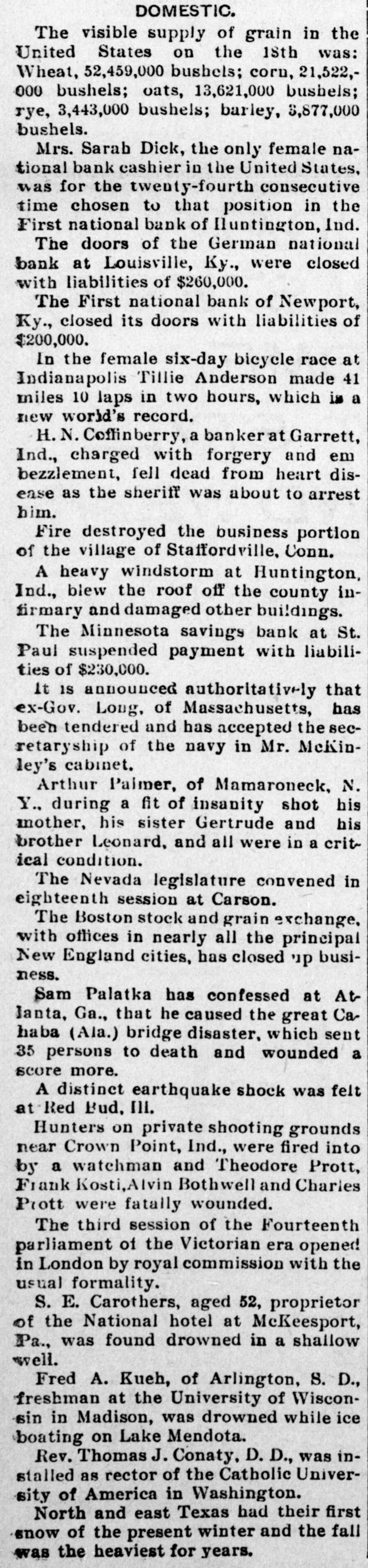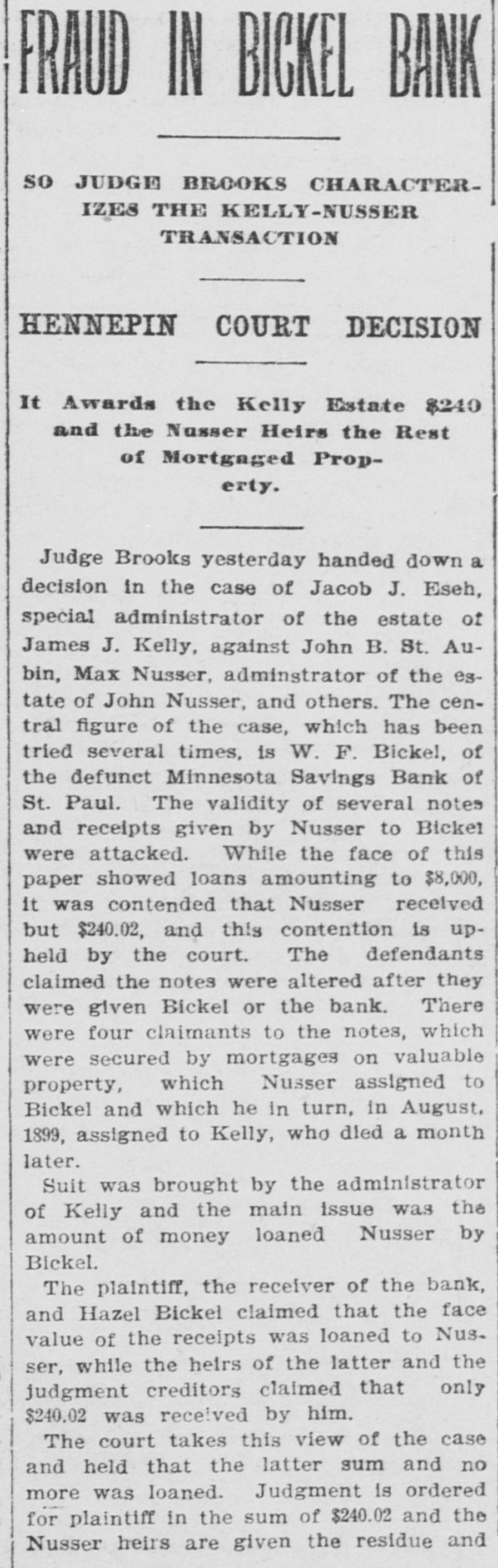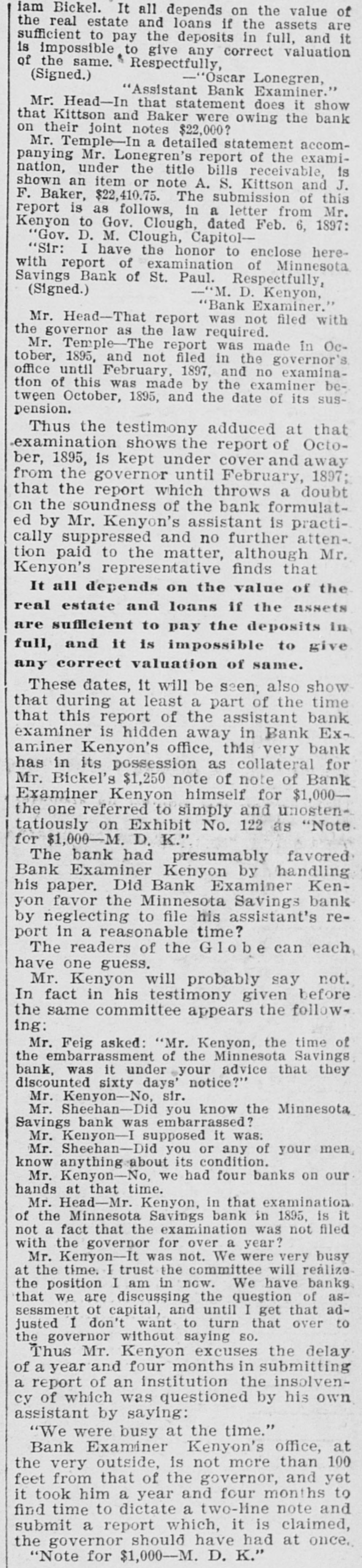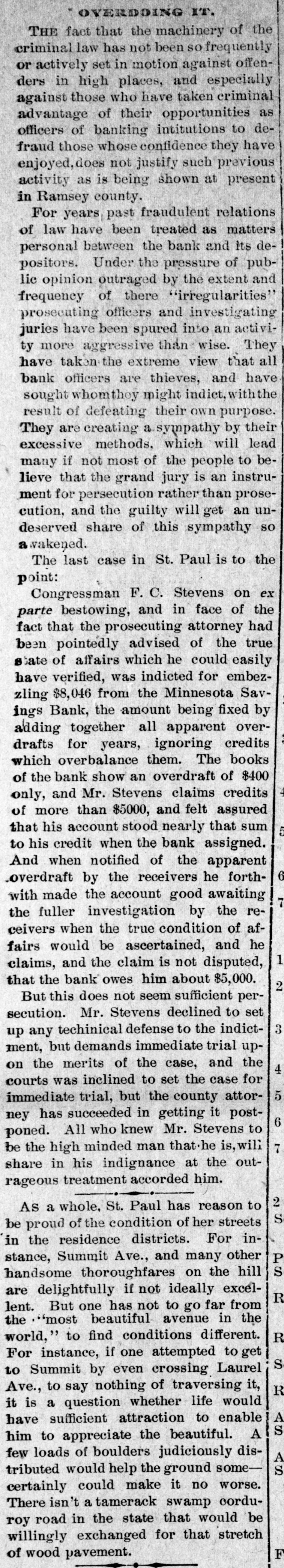 THREE MORE ST. PAUL BANKS. Two Were Large Institutions, the Other Was small. St. Paul, Minn., Jan. 4.-As a direct Minne- rethe closing of the Bank weeks ago, which sota, sult of two and created of started new distrust among depositors were a number of city banks not to be as strong as reputed runs on banks-the the that deposthree St. Paul the Allemania and of them national Germania, itors none wished, institutions, the doors Vest all Side, closely associated-closed their state today, one being in the hands of the asbank examiner and the others making signments. the time that had interv ened During closing of the Bank of Minne- to the Germania paid out sota, since the $225,000 today the frightened depositors, and early the directors concluded they would stop the drain and make an assignment to cashier, Peter M. Keerst. The Allemania bank, which, like the Germania, had a large clientage among and whose vice president the been vice president a the had Germans, formerly target of for Germania, then became the the run. Crowds gathered about the doors lively and fairly fought for a place window. in before the paying teller's such line bank officials realized fully what on The run meant, and promptly called a Bank Examiner Kenyon to take posses- now sion of the bank, and that official is in charge. The West Side bank, a small but possi- Alstronger bank, cleared through the rebly lemania, and today its clearings were turned by the latter institution. Follow~ this there was a decided run inaugu- this ing on the bank, and at 2 o'clock the rated the bank officials closed afternoon and called a meeting of the directors decisdoors decide what action to take. Their to was apparent late in the afternoon, to S. ion filed a deed of assignment H. president of the when Staples, they bank. tied Considerable public money is up m- in three institutions, but there is an in the ple the supply for all immediate needs other banks of the city. The assignment of the Germania and Side banks has brought up a laws some- of West new question in the banking called upwhat state, and the courts will be examiner the settle it. The state bank that on to their right to assign, holding turned doubts should have, under the law, they their assets to him. The attorney acover intimates that he will bring an general tion to test the matter as soon as papers be issued. of can the day numerous reports curDuring among the other banks were of trouble and a few banks suffered runs rent, or lesser intensity, but the that savings algreater were protected by the law before banks them to require 60 days' notice national lows out deposits; and the have no banks paying are in strong condition, and fear of anything of the sort. The Germania Bank. Germania bank was a state insti- The The and had a capital of $400,000. tution official statement of the condition and of last bank, December 21, gave loans resources, I discounts the as $975,420.53; total cap 1 Among the liabilities were undivided $1,625,788. stock, $400,000; surplus and subject ital $58,797; individual deposits certificates of 1 profits, check, $345,191; demand to deposit, $7899; time certificates of deposit, s 3633,019. Germania bank has been organized RamS The ex-Governor Alexander Wilmany being years, a long time president, and say Bickell, cashier. When the governor but liam Mr. Bickell became president, vice f retired, spring Bickell retired, becoming Alle2 last of the newly organized Gusmania president bank. He was succeeded by tav Willius. d Willius told an Associated President representative that the closing was and Press result of an unreasonable panic, the bank would be opened for business usua as the soon as the people regained their cool sense. it bank, as a result of the panicky in o The had paid the depositors $335,000 he fully 1 feeling, last nine days. Willius said by expected the to have the bank reopened the last of March. il The Allemania. r Allemania bank has a capital that of and a clientage similar to o The Allemania was $400,000, the The Germania. of the organ Com last year, as a successor G. ized mercial, William Bickell, formerly forces pres e ident of the Germania, joining Commercial with Albert Scheffer, of the last offl organize a new bank. The show y cial to statement made, December undivided 17, e loans and discounts, $706,842; individua e ed less expenses, $508,764; certificates profits, deposits, $329,789; interest cil n $187,253. President Scheffer, of the Allemania combine n the failure was due to of de twithdrawal said of deposits. A crowd the at positors gathered today demanding decide money, and at 11 o'clock it was to close. Runs on Other Banks. n, to the excitement caused by Alle th Owing of the Germania and the afte ht closing mania banks, many depositors went banks 'S. en their money in one or two other th the Minnesota Savings bank being