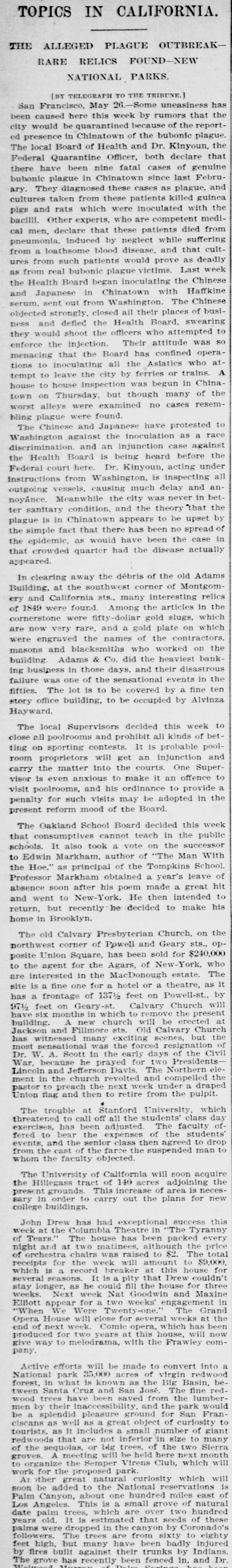 TOPICS IN CALIFORNIA. THE ALLEGED PLAGUE OUTBREAK RARE RELICS FOUND-NEW NATIONAL PARKS [BY TELEGRAPH TO THE TRIBUNE.} San Francisco, May 26.-Some uneasiness has been caused here this week by rumors that the city would be quarantined because of the reported presence in Chinatown of the bubonic plague. The local Board of Health and Dr. Kinyoun, the Federal Quarantine Officer, both declare that there have been nine fatal cases of genuine bubonic plague in Chinatown since last February. They diagnosed these cases as plague, and cultures taken from these patients killed guinea pigs and rats which were inoculated with the bacilli. Other experts, who are competent medical men, declare that these patients died from pneumonia, induced by neglect while suffering from a loathsome blood disease, and that cultures from such patients would prove as deadly as from real bubonic plague victims. Last week the Health Board began inoculating the Chinese and Japanese in Chinatown with Haffkine serum, sent out from Washington. The Chinese objected strongly, closed all their places of business and defied the Health Board, swearing they would shoot the officers who attempted to enforce the injection. Their attitude was so menacing that the Board has confined operations to inoculating all the Asiatics who attempt to leave the city by ferries or trains A house to house inspection was begun in Chinatown on Thursday but though many of the worst alleys were examined no cases resembling plague were found. The Chinese and Japanese have protested to Washington against the inoculation as a race discrimination and an injunction case against the Health Board is being heard before the Federal court here Dr. Kinyoun, acting under instructions from Washington, is inspecting all outgoing vessels, causing much delay and annoyance. Meanwhile the city was never in better sanitary condition, and the theory *that the plague is in Chinatown appears to be upset by the simple fact that there has been no spread of the epidemic, as would have been the case in that crowded quarter had the disease actually appeared. In clearing away the débris of the old Adams Building, at the southwest corner of Montgomery and California sts., many interesting relics of 1849 were found. Among the articles in the cornerstone were fifty-dollar gold slugs, which are now very rare, and a gold plate on which were engraved the names of the contractors, masons and blacksmiths who worked on the building Adams & Co. did the heaviest banking business in those days. and their disastrous failure was one of the sensational events in the fifties. The lot is to be covered by a fine ten story office building, to be occupied by Alvinza Hayward. The local Supervisors decided this week to close all poolrooms and prohibit all kinds of bet ting on sporting contests. It is probable poolroom proprietors will get an injunction and carry the matter into the courts One Supervisor is even anxious to make it an offence to visit poolrooms, and his ordinance to provide a penalty for such visits may be adopted in the present reform mood of the Board. The Oakland School Board decided this week that consumptives cannot teach in the public schools. It also took a vote on the successor to Edwin Markham, author of "The Man With the Hoe," as principal of the Tompkins School. Professor Markham obtained a year's leave of absence soon after his poem made a great hit and went to New-York. He then intended to return, but recently he decided to make his home in Brooklyn. The old Calvary Presbyterian Church, on the northwest corner of Powell and Geary sts., opposite Union Square, has been sold for $240,000 to the agent for the Agars, of New-York, who are interested in the MacDonough estate. The site is a fine one for a hotel or a theatre, as it has a frontage of 137 1/2 feet on Powell-st., by 971/2 feet on Geary-st. Calvary Church will have six months in which to remove the present at building. A new church will be erected Jackson and Fillmore sts. Old Calvary Church scenes, but the has witnessed many exciting most sensational was the forced resignation of Dr. W. A. Scott in the early days of the Civil War, because he prayed for two Presidents Lincoln and Jefferson Davis. The Northern ment in the church revolted and compelled the pastor to preach the next week under draped Union flag and then to retire from the pulpit. The trouble at Stanford University, which threatened to call off all the students' class day exercises, has been adjusted The faculty of fered to bear the expenses of the students' events, and the senior class then agreed to drop from the cast of the farce the suspended man to whom the faculty objected. The University of California will soon acquire the Hillegass tract of 140 acres adjoining the present grounds This increase of area is necessary in order to carry out the plans for new college buildings. John Drew has had exceptional success this week at the Columbia Theatre in "The Tyranny of Tears. The house has been packed every night and at two matinees, although the price of orchestra chairs was raised to $2 The total receipts for the week will amount to $9,000, which is a record breaker at this house for several seasons. It pity that Drew couldn't stay longer, as he could fill the house for three weeks Next week Nat Goodwin and Maxine Elliott appear for a two weeks' engagement in "When We Were Twenty-one." The Grand Opera House will close for several weeks at the end of next week Comic opera, which has been produced for two years at this house, will now give way to melodrama, with the Frawley company. Active efforts will be made to convert into National park 35,000 acres of virgin redwood beforest, in what is known as the Big Basin, tween Santa Cruz and San Jose. The fine redwood trees have been saved from the lumbermen by their Inaccessibility, and the park would be a splendid pleasure ground for San Franciscans as well as great object of curiosity to tourists, as it include