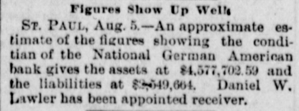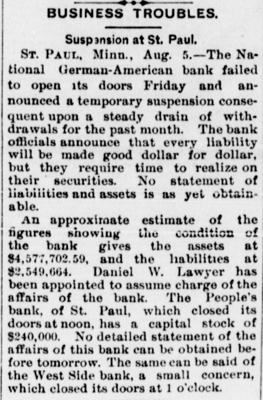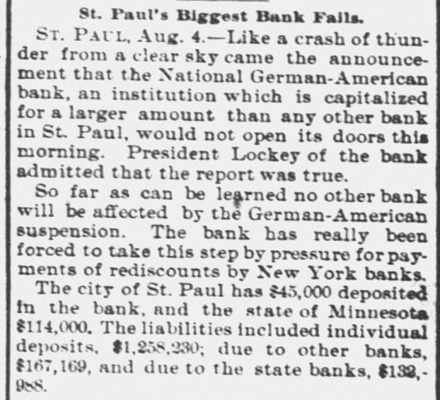 St. Paul's Biggest Bank Fails. Sr. PAUL, Aug. 4.-Like a crash of thunder from a clear sky came the announcement that the National German-American bank, an institution which is capitalized for a larger amount than any other bank in St. Paul, would not open its doors this morning. President Lockey of the bank admitted that the report was true. So far as can be learned no other bank will be affected by the German-American suspension. The bank has really been forced to take this step by pressure for payments of rediscounts by New York banks. The city of St. Paul has $45,000 deposited in the bank, and the state of Minnesota $114,000. The liabilities included individual deposits, $1,258,230; due to other banks, $167, 169, and due to the state banks, $132,988.