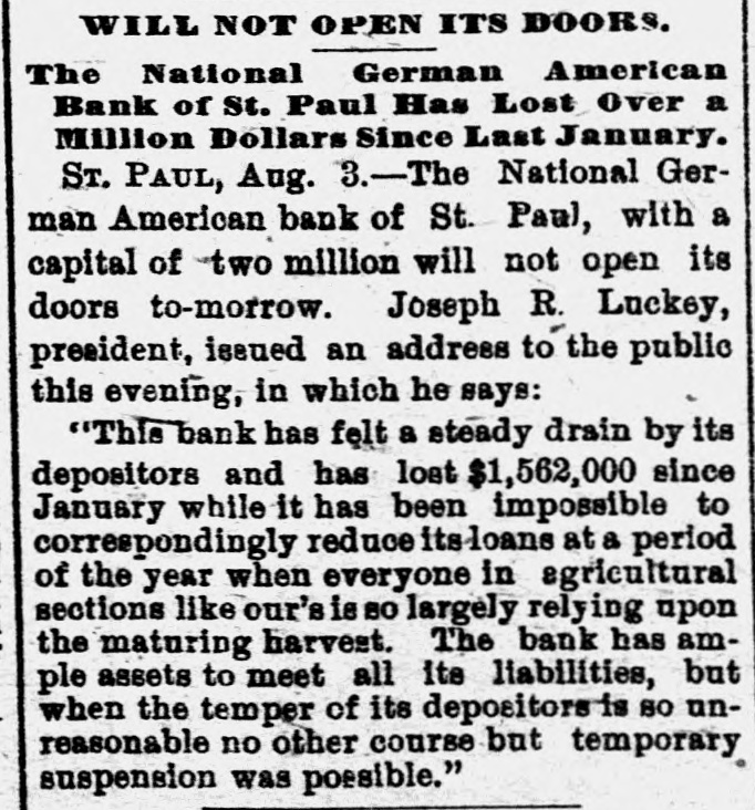 The intense folly of withdrawing deposits from sound banks in times of commercial stress was never more clearly illustrated than by withdrawal of funds from the National German-American bank of St. Paul, which so depleted it of current funds as to force suspension. With assets nearly double its liabilities, a well conducted and prosperous bank was knocked out of the business swim by those who should have been its best friends. For fear of losing a small current deposit, these fools congest the whole financial condition of an aiready heavily burdened country.