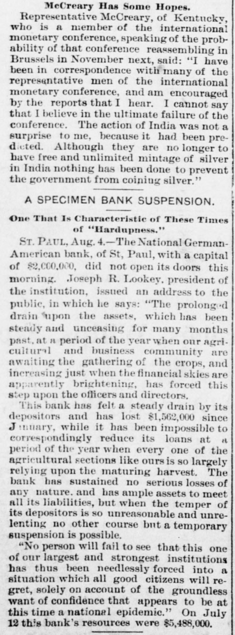 McCreary Has Some Hopes. Representative McCreary, of Kentucky, who is a member of the international monetary conference, speaking of the probability of that conference reassembling in Brussels in November next, said: "I have been in correspondence with many of the representative men of the international monetary conference, and am encouraged by the reports that I hear. I cannot say that I believe in the ultimate failure of the conference. The action of India was not a surprise to me, because it had been predieted. Although they are no longer to have free and unlimited mintage of silver in India nothing has been done to prevent the government from coining silver." A SPECIMEN BANK SUSPENSION. One That Is Characteristic of These Times of "Hardupness." ST. PAUL, Aug. 4.-The National GermanAmerican bank, of St, Paul, with a capital of $2,000,000, did not open its doors this morning. Joseph R. Lookey, president of the institution, issued an address to the public, in which he says: "The prolonged drain upon the assets, which has been steady and unceasing for many months past, at a period of the year when our agricultural and business community are awaiting the gathering of the crops, and increasing just when the financial skies are apparently brightening, has forced this step upon the officers and directors. This bank has felt a steady drain by its depositors and has lost $1,562,000 since J muary, while it has been impossible to correspondingly reduce its loans at a period of the year when every one of the agricultural sections like ours is so largely relying upon the maturing harvest. The bank has sustained no serious losses of any nature. and has ample assets to meet all its liabilities, but when the temper of its depositors is so unreasonable and unrelenting no other course but a temporary suspension is possible. "No person will fail to see that this one of our largest and strongest institutions has thus been needlessly forced into a situation which all good citizens will regret, solely on account of the groundless want of confidence that appears to be at this time a national epidemic." On July 12 this bank's resources were $5,488,000.