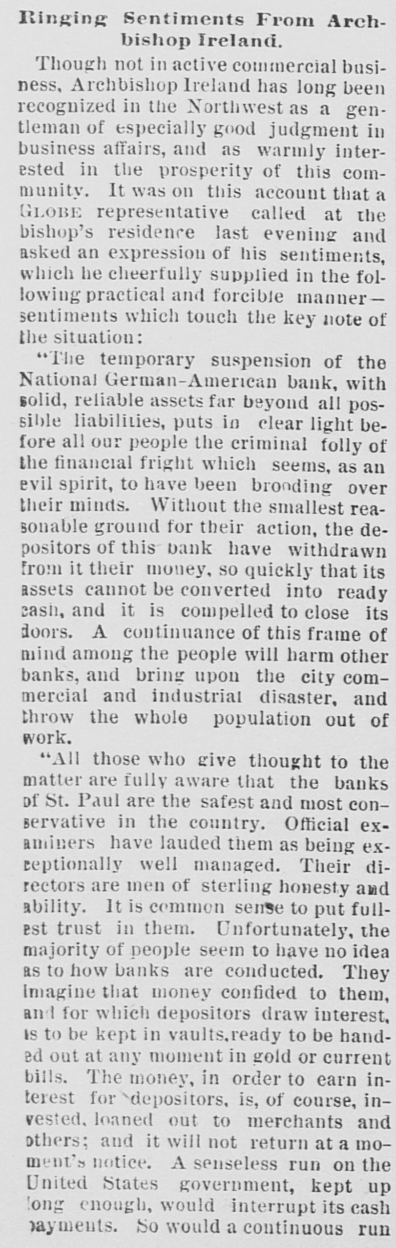 Ringing Sentiments From Archbishop Ireland. Though not in active commercial business, Archbishop Ireland has long been recognized in the Northwest as a gentleman of especially good judgment in business affairs, and as warmly interested in the prosperity of this community. It was on this account that a GLOBE representative called at the bishop's residence last evening and asked an expression of his sentiments, which he cheerfully supplied in the following practical and forcible mannersentiments which touch the key note of the situation: "The temporary suspension of the National German-American bank, with solid, reliable assets far beyond all possible liabilities, puts in clear light before all our people the criminal folly of the financial fright which seems, as an evil spirit, to have been brooding over their minds. Without the smallest reasonable ground for their action, the depositors of this bank have withdrawn from it their money, SO quickly that its assets cannot be converted into ready cash, and it is compelled to close its doors. A continuance of this frame of mind among the people will harm other banks, and bring upon the city commercial and industrial disaster, and throw the whole population out of work. "All those who give thought to the matter are fully aware that the banks of St. Paul are the safest and most conservative in the country. Official examiners have lauded them as being exreptionally well managed. Their directors are men of sterling honesty and ability. It is common sense to put fullest trust in them. Unfortunately, the majority of people seem to have no idea as to how banks are conducted. They Imagine that money confided to them, and for which depositors draw interest, is to be kept in vaults, ready to be handed out at any moment in gold or current bills. The money, in order to earn interest for depositors, is, of course, invested, loaned out to merchants and others; and it will not return at a moment's notice. A senseless run on the United States government, kept up long enough, would interrupt its cash payments. So would a continuous run
