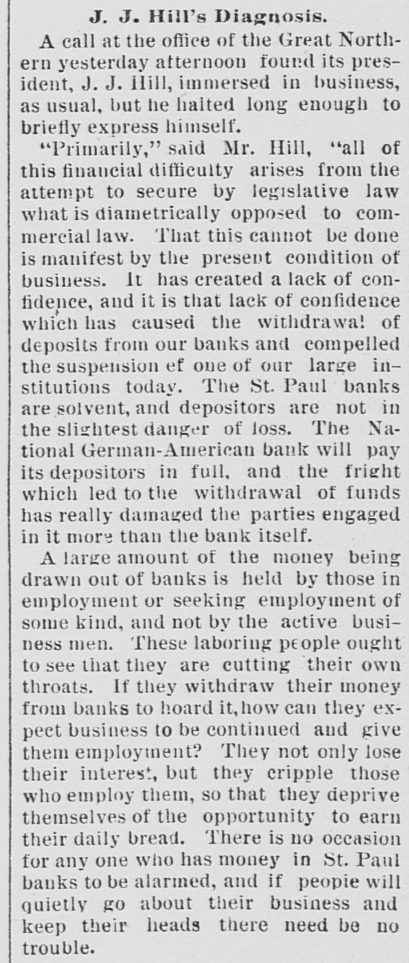 J. J. Hill's Diagnosis. A call at the office of the Great Northern yesterday atternoon found its president, J. J. Hill, immersed in business, as usual, but he halted long enough to briefly express himself. "Primarily," said Mr. Hill, "all of this financial difficulty arises from the attempt to secure by legislative law what is diametrically opposed to commercial law. That this cannot be done is manifest by the present condition of business. It has created a lack of confidence, and it is that lack of confidence which has caused the withdrawal of deposits from our banks and compelled the suspension ef one of our large institutions today. The St. Paul banks are solvent, and depositors are not in the slightest danger of loss. The National German-American bank will pay its depositors in full, and the fright which led to the withdrawal of funds has really damaged the parties engaged in it more than the bank itself. A large amount of the money being drawn out of banks is held by those in employment or seeking employment of some kind, and not by the active business men. These laboring people ought to see that they are cutting their own throats. If they withdraw their money from banks to hoard it, how can they expect business to be continued and give them employment? They not only lose their interest, but they cripple those who employ them, SO that they deprive themselves of the opportunity to earn their daily bread. There is no occasion for any one who has money in St. Paul banks to be alarmed, and if people will quietly go about their business and keep their heads there need be no trouble.