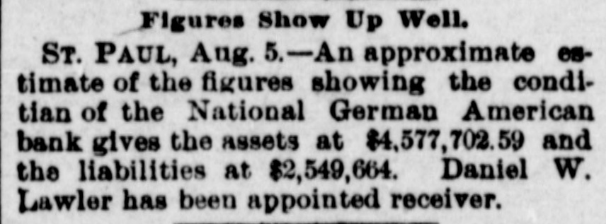 Figures Show Up Well. ST. PAUL, Aug. 5.-An approximate estimate of the figures showing the conditian of the National German American bank gives the assets at $4,577,702.59 and the liabilities at $2,549,664. Daniel W. Lawler has been appointed receiver.