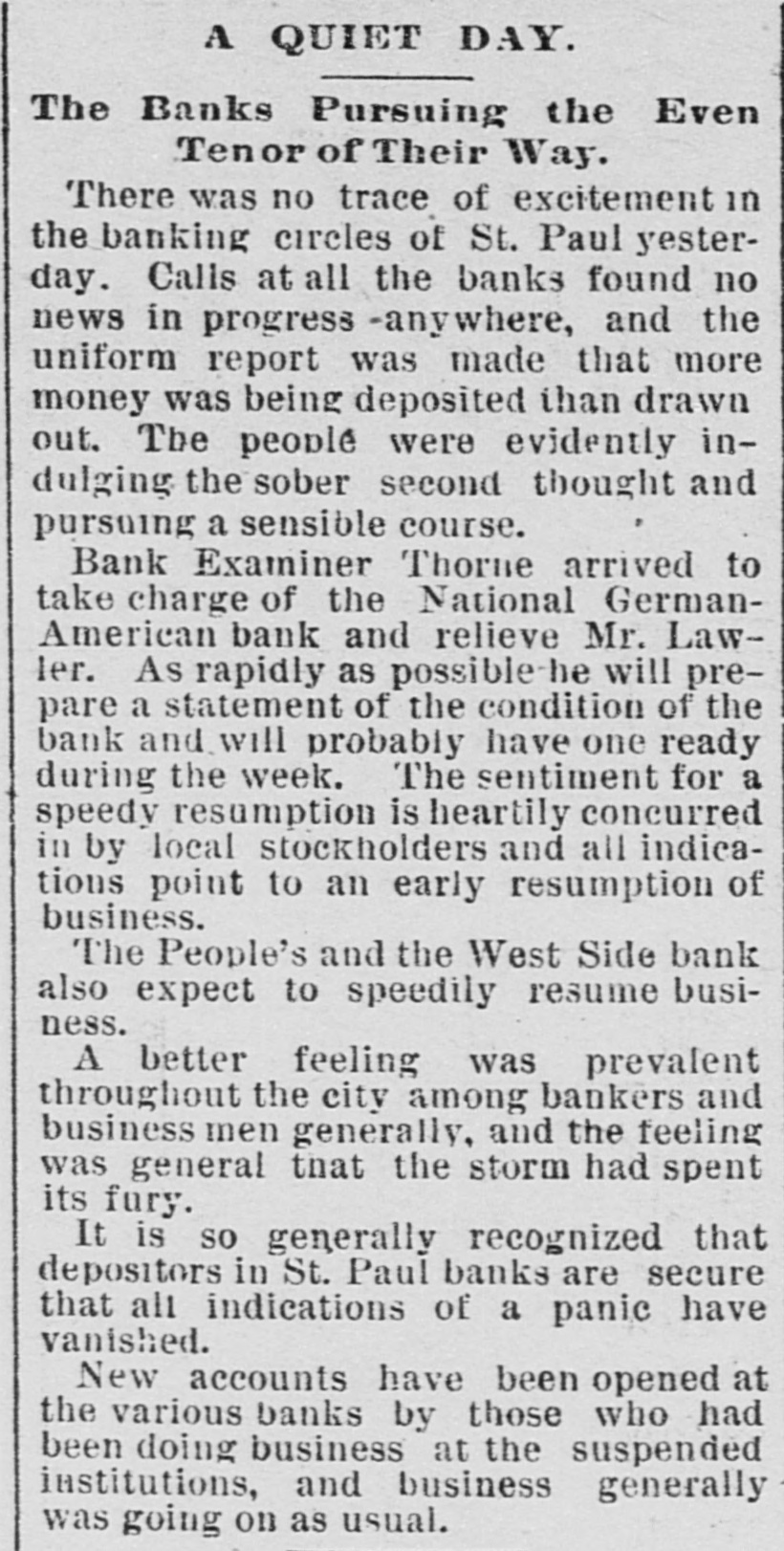 A QUIET DAY. The Banks Pursuing the Even Tenor of Their Way. There was no trace of excitement in the banking circles of St. Paul yesterday. Calls at all the banks found no news in progress -anywhere, and the uniform report was made that more money was being deposited than drawn out. The people were evidently indulging the sober second thought and pursuing a sensible course. Bank Examiner Thorne arrived to take charge of the National GermanAmerican bank and relieve Mr. Lawler. As rapidly as possible he will prepare a statement of the condition of the bank and will probably have one ready during the week. The sentiment for a speedy resumption is heartily concurred in by local stockholders and all indications point to an early resumption of business. The People's and the West Side bank also expect to speedily resume business. A better feeling was prevalent throughout the city among bankers and business men generally, and the feeling was general that the storm had spent its fury. It is so generally recognized that depositors in St. Paul banks are secure that all indications of a panic have vanished. New accounts have been opened at the various banks by those who had been doing business at the suspended institutions, and business generally was going on as usual.