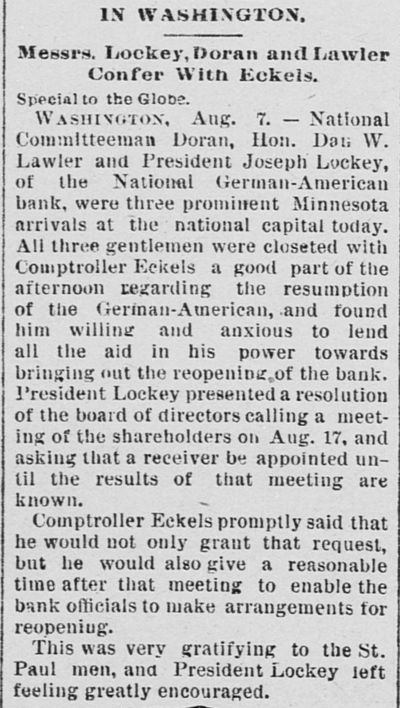 IN WASHINGTON, Messrs. Lockey, Doran and Lawler Confer With Eckels. Special to the Globe. WASHINGTON, Aug. 7. - National Committeeman Doran, Hon. Dat W. Lawler and President Joseph Lockey, of the National German-American bank, were three prominent Minnesota arrivals at the national capital today. All three gentlemen were closeted with Comptroller Eckels a good part of the afternoon regarding the resumption of the Gerinan-American, and found him willing and anxious to lend all the aid in his power towards bringing out the reopening, of the bank. President Lockey presented a resolution of the board of directors calling a meeting of the shareholders on Aug. 17, and asking that a receiver be appointed until the results of that meeting are known. Comptroller Eckels promptly said that he would not only grant that request, but he would also give a reasonable time after that meeting to enable the bank officials to make arrangements for reopeniug. This was very gratifying to the St. Paul men, and President Lockey left feeling greatly encouraged.