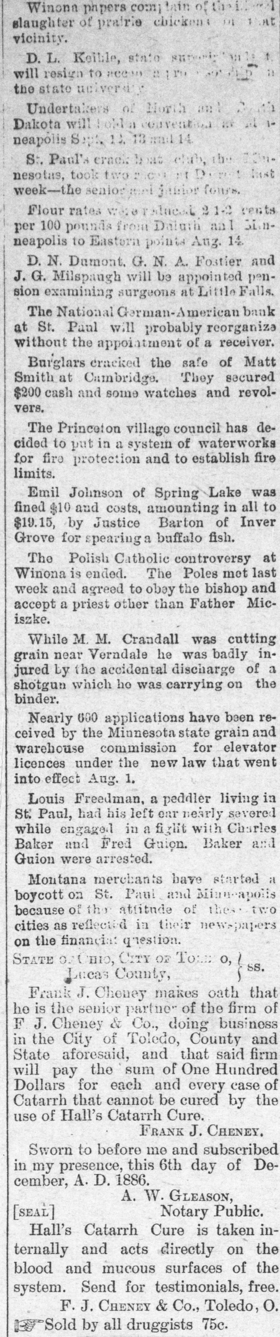 The National German-American bank of St. Paul will reopen its doors Oct. 23, and again do business. Its suspension was caused by the cowardly, who withdrew their cash just when the presence of cash was most needed and most unattainable. With assets almost double its liabilities, this sound concern was forced, for self-protection, to assign owing to foul blows from its supposed friends. Executive clemency in the case of Thompson the De Smet, S. D., murderer may be wisely exercised. But it would seem that when a jury and judge, these days. find a man guilty of a shocking, cold-blooded murder, and sentence him to be hanged in expiation, that that sentence should be carried out. Such cases of emotional leniency do not seem to benefit the cause of justice, law and order; but rather are inclined to antagonize the people towards them and incite disorder. In a speech in the Rotunda at Dublin. John Redmond, the Parnellite faction leader, clearly indicated that he and his followers had had enough of "the grand old" fraud, who had no more use for Ireland after the Irish had plucked the official chestnuts out of the political fire. Mr. Redmond declared that his faction would no longer vote with the Liberals on English questions. He eulogized Parnell and declared his belief in the lack of patriotism of the other wing of the Irish party. The closing scenes of the bi-metallic congress were pitifully ludicrous. A few earnest men striving to arouse enthusiam and attract the nation's attention which would not be attracted by their theories. Gov. Tillman mingled negro domination and Grant's bayonets with his belief that the South and West could control the presidency. Gov. Lewelling spoke of Kansas having sent ex-confederates to congress and the convention exhausted itself in cheering, and adjourned to meet at Atlanta, Ga., next year. The Ameer of Afghanstan shows his appreciation of Neil's genius, who during the Indian mutiny, promptly stopped assassinations by blowing the fanatics from a cannon's mouth. The dismemberd Moslem can not achieve his Paradise. To assassinate an infidel and be hanged is glorious martyrdom to the Moslem fanatic; to be shot to pieces is death and damnation combined. The Ameer saw the force of this argument and promptly put down his revolting soldiery by blowing the ringleaders to pieces,