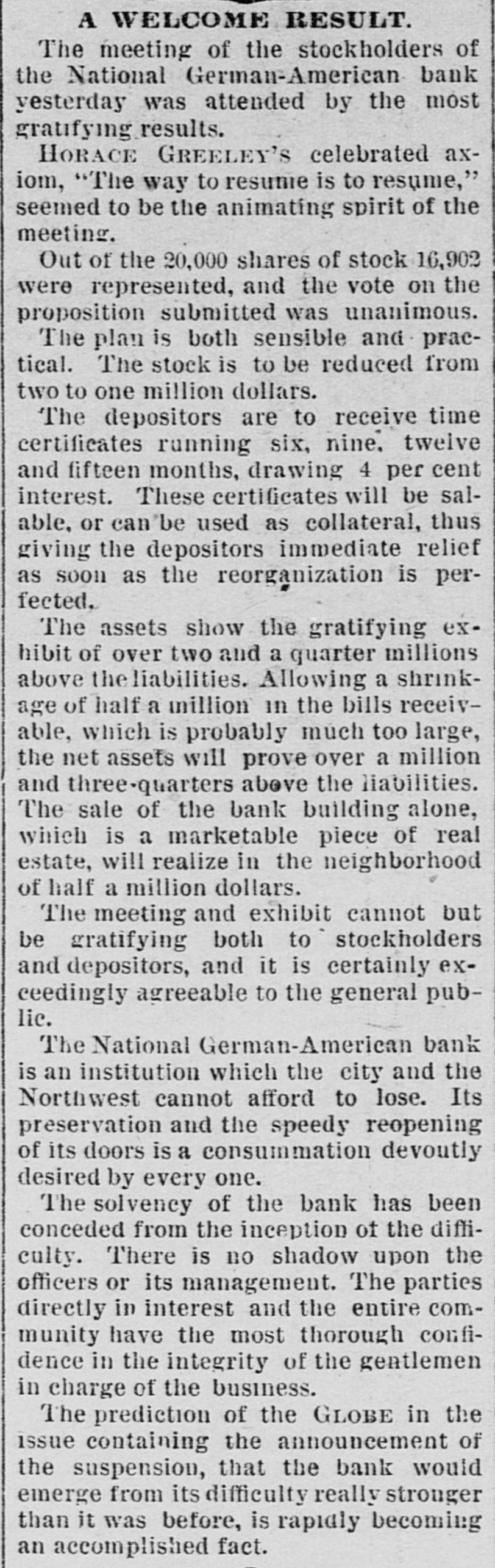 A WELCOME RESULT. The meeting of the stockholders of the National German-American bank yesterday was attended by the most gratifying results. HORACE GREELEY'S celebrated axiom, "The way to resume is to resume," seemed to be the animating spirit of the meeting. Out of the 20,000 shares of stock 16,902 were represented, and the vote on the proposition submitted was unanimous. The plan is both sensible and practical. The stock is to be reduced from two to one million dollars. The depositors are to receive time certificates running six, nine, twelve and fifteen months, drawing 4 per cent interest. These certificates will be salable, or can'be used as collateral, thus giving the depositors immediate relief as soon as the reorganization is perfected. The assets show the gratifying exhibit of over two and a quarter millions above the liabilities. Allowing a shrinkage of half a million in the bills receivable, which is probably much too large, the net assets will prove over a million and three-quarters above the liabilities. The sale of the bank building alone, which is a marketable piece of real estate, will realize in the neighborhood of half a million dollars. The meeting and exhibit cannot but be gratifying both to stockholders and depositors, and it is certainly exceedingly agreeable to the general public. The National German-Ameriean bank is an institution which the city and the Northwest cannot afford to lose. Its preservation and the speedy reopening of its doors is a consummation devoutly desired by every one. The solvency of the bank has been conceded from the inception of the difficulty. There is no shadow upon the officers or its management. The parties directly in interest and the entire community have the most thorough confidence in the integrity of the gentlemen in charge of the business. The prediction of the GLOBE in the issue containing the announcement of the suspension, that the bank would emerge from its difficulty really stronger than it was before, is rapidly becoming an accomplished fact.