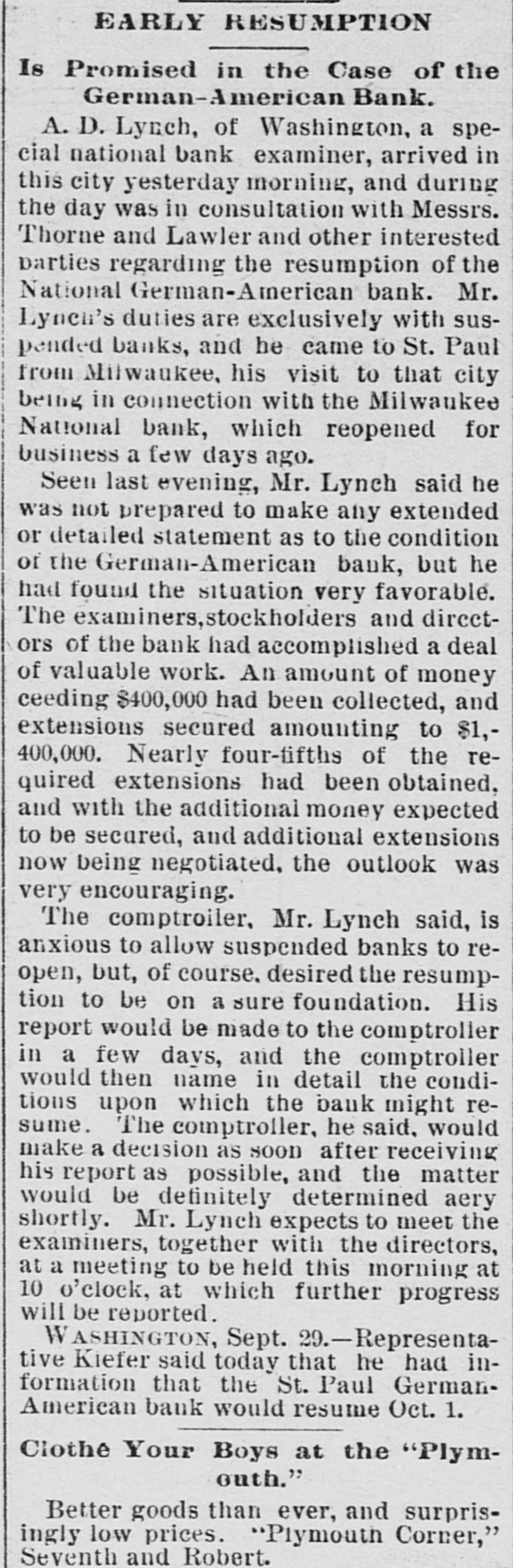 EARLY RESUMPTION Is Promised in the Case of the German-American Bank. A. D. Lynch, of Washington, a special national bank examiner, arrived in this city yesterday morning, and during the day was in consultation with Messrs. Thorne and Lawler and other interested parties regarding the resumption of the National German-American bank. Mr. Lynen's duties are exclusively with suspended banks, and he came to St. Paul from Milwaukee, his visit to that city being in connection with the Milwaukee National bank, which reopened for business a few days ago. Seen last evening, Mr. Lynch said he was not prepared to make any extended or detailed statement as to the condition or the German-American bank, but he had found the situation very favorable. The examiners, stockholders and directors of the bank had accomplished a deal of valuable work. An amount of money ceeding $400,000 had been collected, and extensions secured amounting to $1,400,000. Nearly four-fifths of the required extensions had been obtained, and with the additional money expected to be secured, and additional extensions now being negotiated, the outlook was very encouraging. The comptroiler, Mr. Lynch said, is anxious to allow suspended banks to reopen, but, of course. desired the resumption to be on a sure foundation. His report would be made to the comptroller in a few days, and the comptroller would then name in detail the conditions upon which the bank might resume. The comptroller, he said, would make a decision as soon after receiving his report as possible, and the matter would be definitely determined aery shortly. Mr. Lynch expects to meet the examiners, together with the directors, at a meeting to be held this morning at 10 o'clock, at which further progress will be reported. WASHINGTON, Sept. 29.-Representative Kiefer said today that he had information that the St. Paul GermanAmerican bank would resume Oct. 1. Clothe Your Boys at the "Plymouth." Better goods than ever, and surprisingly low prices. "Plymouth Corner," Seventh and Robert.