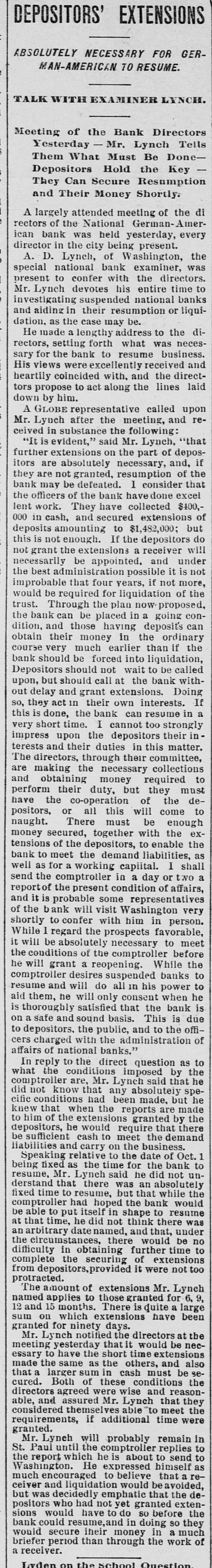 DEPOSITORS' EXTENSIONS ABSOLUTELY NECESSARY FOR GERMAN-AMERICAN TO RESUME. TALK WITH EXAMINER LYNCH. Meeting of the Bank Directors Yesterday - Mr. Lynch Tells Them What Must Be DoneDepositors Hold the Key They Can Secure Resumption and Their Money Shortly. A largely attended meeting of the di rectors of the National German-American bank was held yesterday, every director in the city being present. A. D. Lynch, of Washington, the special national bank examiner, was present to confer with the directors. Mr. Lynch devotes his entire time to investigating suspended national banks and aiding in their resumption or liquidation, as the case may be. He made a lengthy address to the directors, setting forth what was necessary for the bank to resume business. His views were excellently received and heartily coincided with, and the directtors propose to act along the lines laid down by him. A GLOBE representative called upon Mr. Lynch after the meeting, and received in substance the following: "It is evident," said Mr. Lynch, "that further extensions on the part of depositors are absolutely necessary, and, if they are not granted, resumption of the bank may be defeated. 1 consider that the officers of the bank have done excel lent work. They have collected $400,000 in cash, and secured extensions of deposits amounting to $1,482,000; but this is not enough. If the depositors do not grant the extensions a receiver will necessarily be appointed, and under the best administration possible it is not improbable that four years, if not more, would be required for liquidation of the trust. Through the plan now.proposed, the bank can be placed in a going condition, and those having deposits can obtain their money in the ordinary course very much earlier than if the bank should be forced into liquidation, Depositors should not wait to be called upon, but should call at the bank without delay and grant extensions. Doing so, they act in their own interests. If this is done, the bank can resume in a very short time. I cannot too strongly impress upon the depositors their interests and their duties in this matter. The directors, through their committee, are making the necessary collections and obtaining money required to perform their duty, but they must have the co-operation of the depositors, or all this will come to naught. There must be enough money secured, together with the extensions of the depositors, to enable the bank to meet the demand liabilities, as well as for a working capiital. I shall send the comptroller in a day or two a report of the present condition of affairs, and it is probable some representatives of the bank will visit Washington very shortly