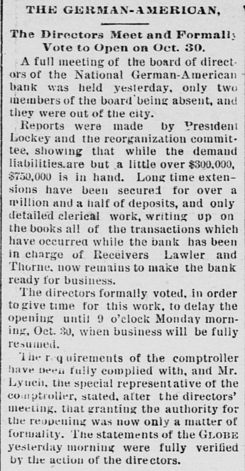 THE GERMAN-AMERICAN, The Directors Meet and Formally Vote to Open on Oct. 30. A full meeting of the board of directors of the National German-American bank was held yesterday, only two members of the board being absent, and they were out of the city. Reports were made by President Lockey and the reorganization committee, showing that while the demand liabilities.are but a little over $300,000, $750,000 is in hand. Long time extensions have been secured for over a million and a half of deposits, and only detailed clerical work, writing up on the books all of the transactions which have occurred while the bank has been in charge of Receivers Lawler and Thorne, now remains to make the bank ready for business. The directors formally voted, in order to give time for this work, to delay the opening until 9 o'clock Monday morning, Oct. 30, when business will be fully resumed. The req uirements of the comptroller have been fully complied with, and Mr. Lynch, the special representative of the comptroller, stated. after the directors' meeting. that granting the authority for the reopening was now only a matter of formality. The statements of the GLOBE yesterday morning were fully verified by the action of the directors.