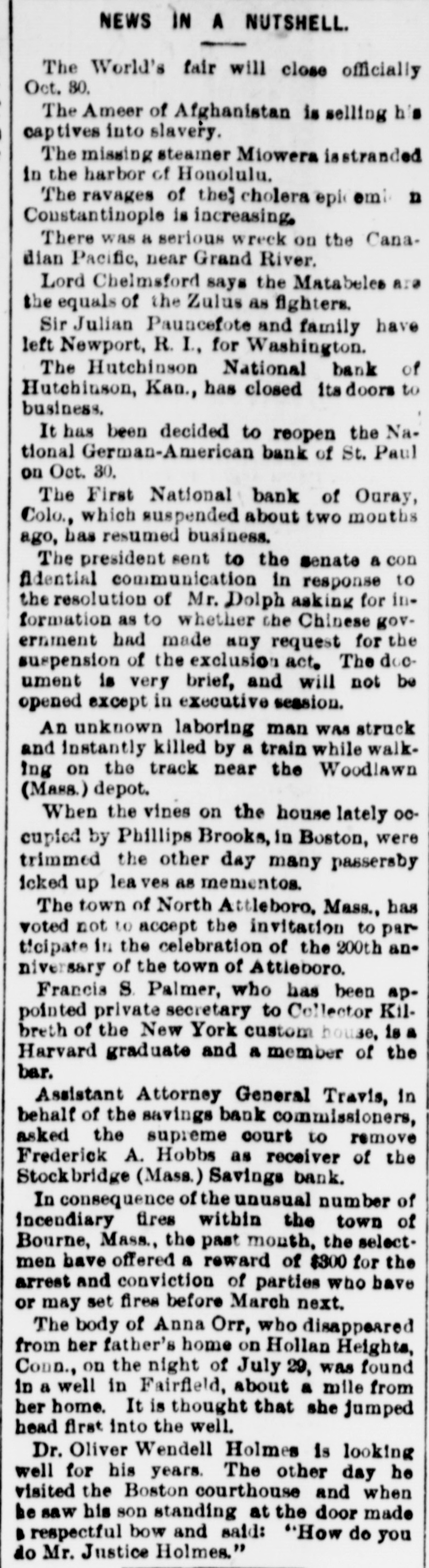 NEWS IN A NUTSHELL. The World's fair will close officially Oct. 80. The Ameer of Afghanistan is selling his captives into slavery. The missing steamer Miowera isstranded in the harbor of Honolulu. The ravages of the cholera epi emi n Constantinople is increasing, There was a serious wreck on the Canadian Pacific, near Grand River. Lord Chelmsford says the Matabeles are the equals of the Zulus as fighters. Sir Julian Pauncefote and family have left Newport, R. I., for Washington. The Hutchinson National bank of Hutchinson, Kan., has closed its doors to business. It has been decided to reopen the National German-American bank of St. Paul on Oct. 30. The First National bank of Ouray, Colo., which suspended about two months ago, has resumed business. The president sent to the senate a con Adential communication in response to the resolution of Mr. Dolph asking for information as to whether the Chinese government had made any request for the suspension of the exclusion act. The document is very brief, and will not be opened except in executive session. An unknown laboring man was struck and instantly killed by a train while walkIng on the track near the Woodlawn (Mass.) depot. When the vines on the house lately occupied by Phillips Brooks, in Boston, were trimmed the other day many passersby icked up lea ves as mementos. The town of North Attleboro, Mass., has voted not to accept the invitation to participate in the celebration of the 200th anniversary of the town of Attieboro. Francis S. Palmer, who has been appointed private secretary to Collector Kilbreth of the New York custom house, is a Harvard graduate and a member of the bar. Assistant Attorney General Travis, in behalf of the savings bank commissioners, asked the supreme court to remove Frederick A. Hobbs as receiver of the Stockbridge (Mass.) Savings bank. In consequence of the unusual number of incendiary fires within the town of Bourne, Mass., the past month, the selectmen have offered a reward of $300 for the arrest and conviction of parties who have or may set fires before March next. The body of Anna Orr, who disappeared from her father's home on Hollan Heights, Conn., on the night of July 29, was found in a well in Fairfield, about a mile from her home. It is thought that she jumped head first into the well. Dr. Oliver Wendell Holmes is looking well for his years. The other day he visited the Boston courthouse and when be saw his son standing at the door made B respectful bow and said: "How do you do Mr. Justice Holmes."