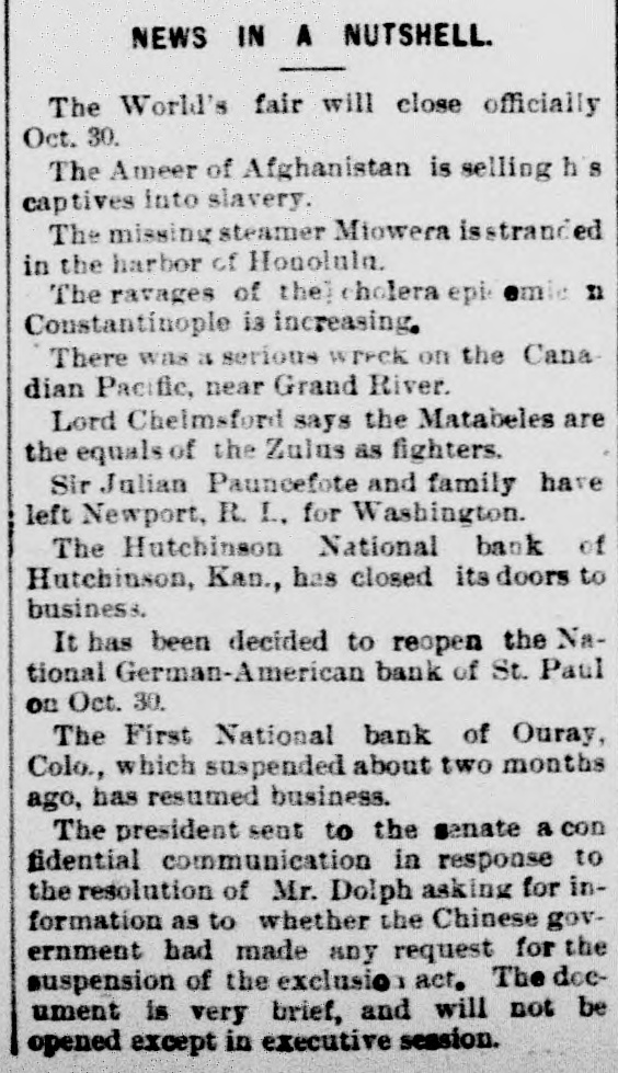 NEWS IN A NUTSHELL. The World's fair will close officially Oct. 30. The Ameer of Afghanistan is selling h's captives into slavery. The missing steamer Miowera isstranded in the harbor of Honolula. The ravages of the cholera epi- emic Il Constantinople is increasing, There was is serious wreck on the Cana dian Pacific, near Grand River. Lord Chelmsford says the Matabeles are the equals of the Zulus as fighters. Sir Julian Pauncefote and family have left Newport, R. L. for Washington. The Hutchinson National bank of Hutchinson, Kan., has closed its doors to business. It has been decided to reopen the National German-American bank of St. Paul on Oct. 30. The First National bank of Ouray, Colo., which suspended about two months ago, has resumed business. The president sent to the senate a con fidential communication in response to the resolution of Mr. Dolph asking for information as to whether the Chinese government had made any request for the suspension of the exclusion act. The doeument is very brief, and will not be opened except in executive session.