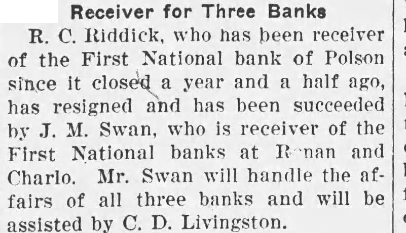 R. Riddick, has been receiver of the First National bank of Polson since closed year and half has resigned and has been succeeded by Swan, receiver of the First National banks and Charlo. Mr. Swan will handle the fairs all three banks and will be assisted by Livingston.