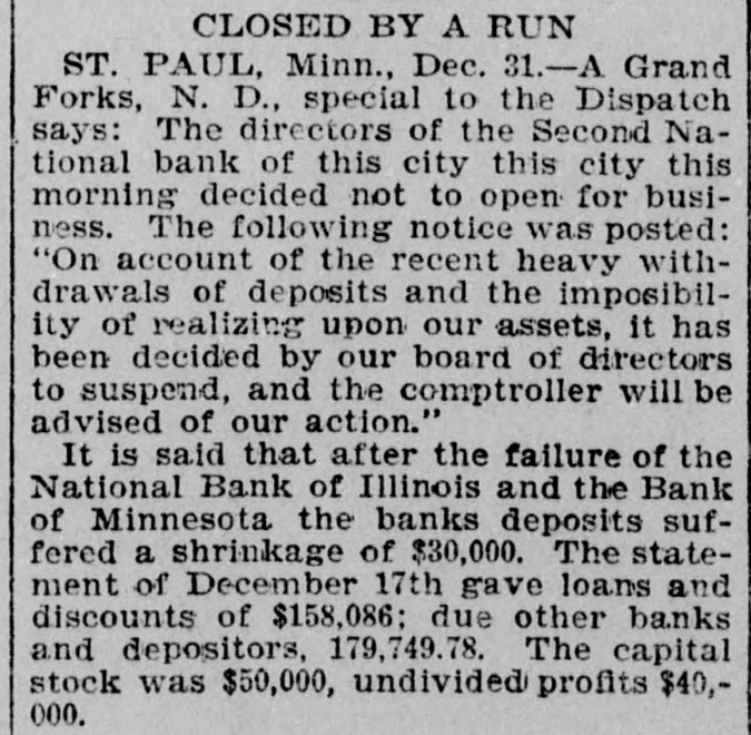 CLOSED BY A RUN ST. PAUL, Minn., Dec. 31.-A Grand Forks, N. D., special to the Dispatch says: The directors of the Second National bank of this city this city this morning decided not to open- for business. The following notice was posted: "On account of the recent heavy withdrawals of deposits and the imposibility of realizing upon our assets, it has been decided by our board of directors to suspend, and the comptroller will be advised of our action." It is said that after the failure of the National Bank of Illinois and the Bank of Minnesota the banks deposits suffered a shrinkage of $30,000. The statement of December 17th gave loans and discounts of $158,086; due other banks and depositors, 179,749.78. The capital stock was $50,000, undivided profits $40,000.