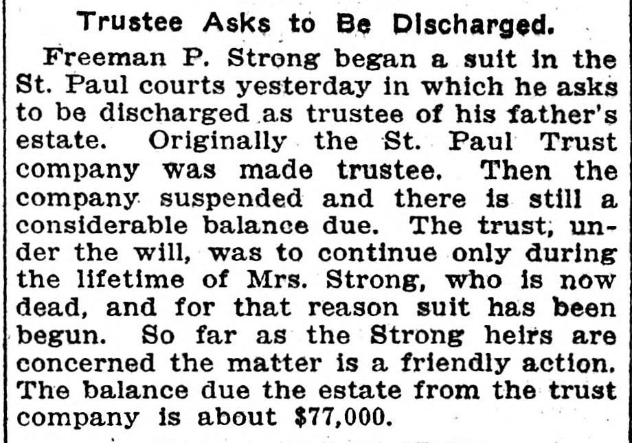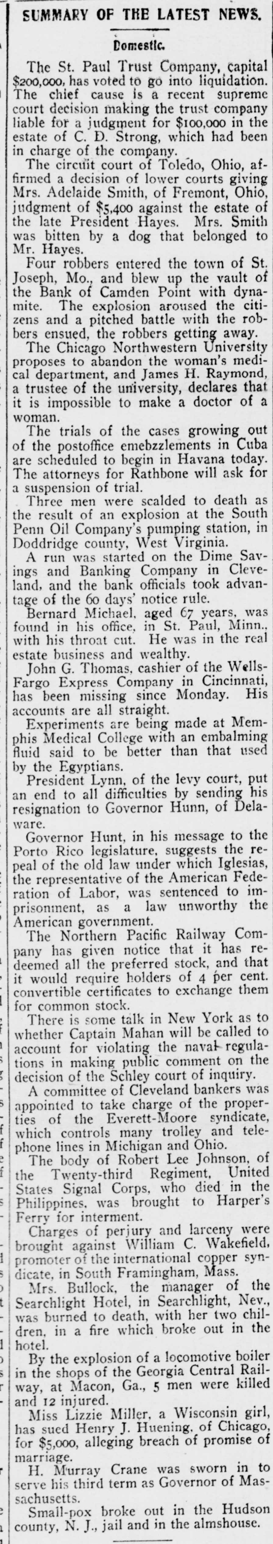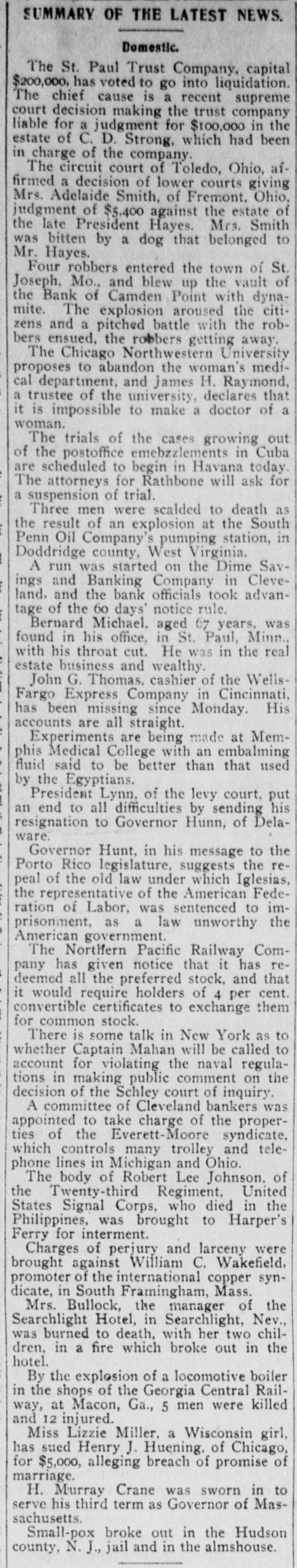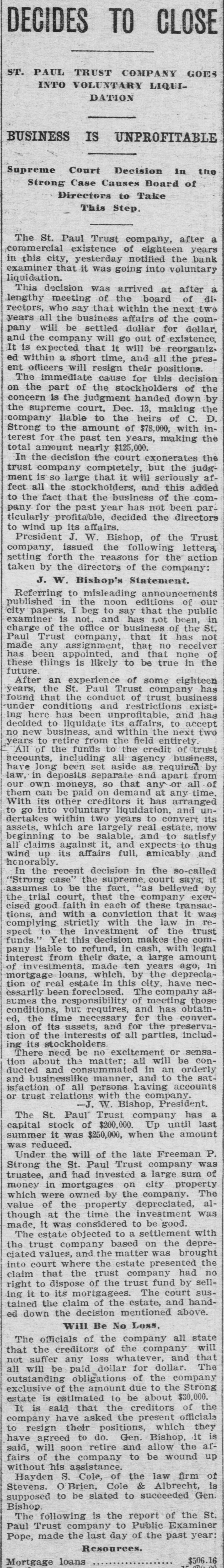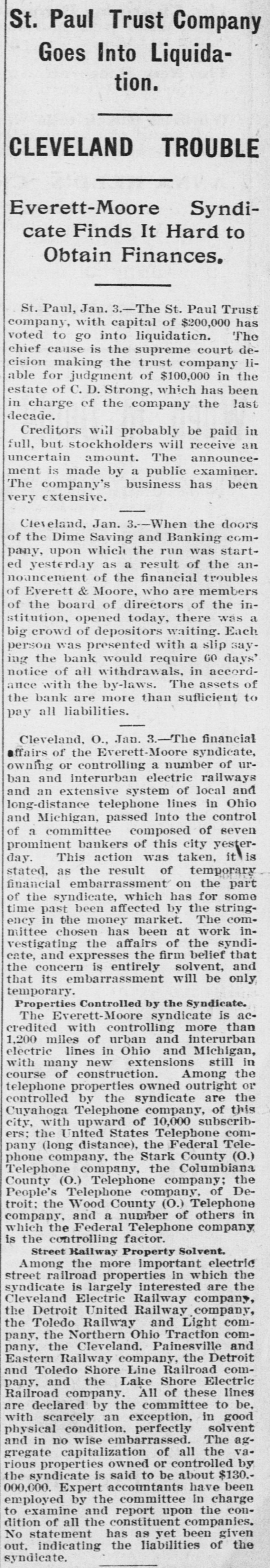 St. Paul Trust Company Goes Into Liquidation. TROUBLE CLEVELAND Everett-Moore Syndicate Finds It Hard to Obtain Finances. St. Paul, Jan. 3.-The St. Paul Trust company, with capital of $200,000 has voted to go into liquidation. The chief cause is the supreme court decision making the trust company liable for judgment of $100,000 in the estate of C.D. Strong, which has been in charge of the company the last decade. Creditors will probably be paid in full, but stockholders will receive an amount. is made by a ment uncertain public The has announce- examiner. been The company's business very extensive. Jan. 3.-When the doors Cleveland, the Saving Banking of Dime and comwhich the run was started as a result pany, yesterday upon of troubles the annoancement of the financial of Everett & Moore, who are members of the board of directors of the institution, opened today, there was a big crowd of depositors waiting. Each person was presented with a slip saying the bank would require GO days' notice of all withdrawals, in accordance with the by-laws. The assets of the bank are more than sufficient to pay all liabilities. O., Jan. 3.-The financial of the Everett-Moore affairs Cleveland, number syndicate, of uror controlling a interurban electric and extensive system of owning ban an and local railways and long-distance telephone lines in Ohio and Michigan, passed Into the control of a committee composed of seven prominent bankers of this city yester- it Vis This action was taken, as the result of embarrassment on stated, day. financial temporary the part of which time been affected by the past syndicate, has the The for string- some comency in the money market. mittee chosen has been at work investigating the affairs of the syndicate, and expresses the firm belief that and the concern is entirely solvent, that its embarrassment will be only temporary. Properties Controlled by the Syndicate. The Everett-Moore syndicate is accredited with controlling more than 1.200 miles of urban and interurban electric lines in Ohio and Michigan, in with many new extensions still course of construction. Among the telephone properties owned outright or controlled by the syndicate are the Cuyahoga Telephone company, of this city, with upward of 10,000 subscribthe United States Telephone comers: (long distance), the Federal Telepany phone company, the Stark County (O.) Telephone company, the Columbiana the County (O.) Telephone company; DePeople's Telephone company, of troit: the Wood County (O.) Telephone in company, and a number of others which the Federal Telephone company is the controlling factor. Street Railway Property Solvent. Among the more important electric the street railroad properties in which syndicate is largely interested are the Cleveland Electric Railway company, the Detroit United Railway company, the Toledo Railway and Light comthe Northern Ohio Traction com- and pany, the Cleveland. Painesville Eastern pany, Railway company, the Detroit and Toledo Shore Line Railroad comand the Lake Shore Electric pany, Railroad company. All of these lines be. are declared by the committee to with scarcely an exception, in good physical condition. perfectly solvent agand in no wise embarrassed. The gregate capitalization of all the various properties owned or controlled $130.- by the syndicate is said to be about 000,000. Expert accountants have been employed by the committee in charge conto examine and report upon the dition of all the constituent companies. No statement has as yet been given the out. indicating the liabilities of syndicate.