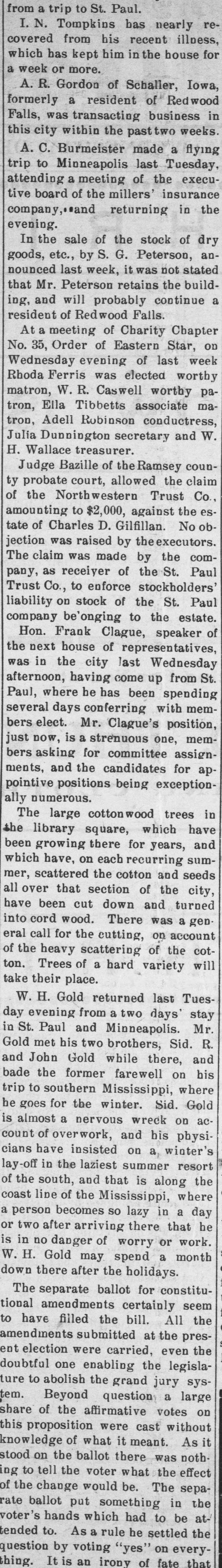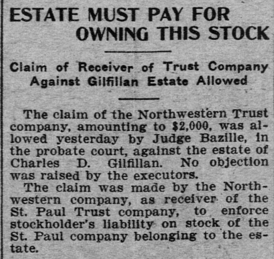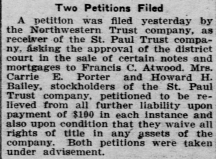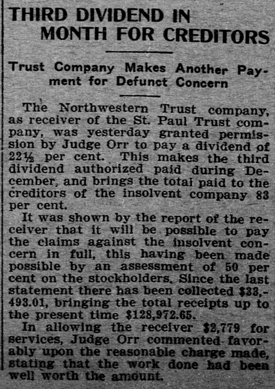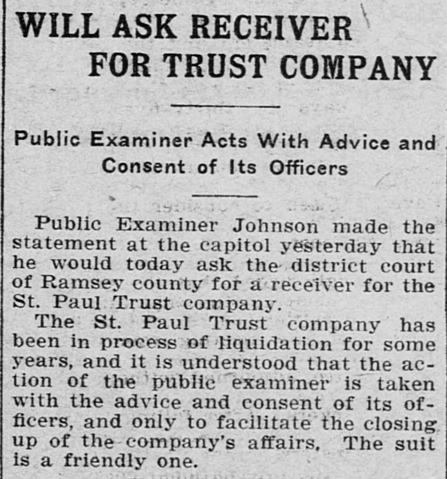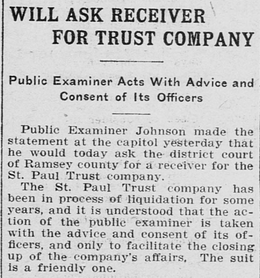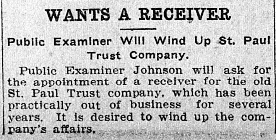 NAMES A RECEIVER Northwestern Trust to Wind up St. Paul Trust Company The Northwestern Trust company was appointed yesterday by Judge Lewis, of the district court, as receiver for the St. Paul Trust company, insolvent. A receiver was named on motion of Assistant Attorney General F. N. Dickson, following the application of State Public Examiner S. T. Johnson. The Northwestern Trust company was recommended as such receiver in a petition to the court signed by the principal creditors of the insolvent company. Examiner Johnson declares, in his application, that in January, 1902, it appeared to him that the decision of the Minnesota supreme court in the case of The St. Paul Trust Company, executors, etc., appellants, against Ab-igail Spurr Strong et al, respondents, would result in a very material increase of the trust company's liabilities and possibly in the insolvency of said company. "An examination of the company made by me," continues Mr. Johnson, disclosed that the business and affairs of the company had been conducted in an unsafe and unauthorized manner. The petitioner directed the company not to accept any new trust or business, and under a change of management. the company proceeded to dispose of its real estate and decrease its liabilities. The affairs of the company since January, 1902, have been conducted under the supervision and with the approval of your petitioner, and, as your petitioner believes, to the best interests of all concerned. The company is now insolvent, says Mr. Johnson. Its liabilities exceed its assets by about $54,000. These assets are: Cash and marketable bonds, $52,683; real estate, $43,000; real estate mortgages, $5,952; contract of sale, $1,709; miscellaneous, $8,450; total, $111,794. The liabilities include $15,330 due to stockholders. The request of creditors that the Northwestern Trust company, of St. Paul, be chosen as the receiver was signed by creditors. These creditors and their respective interests are: Freeman P. Strong, $68,000; Freeman P. Strong, trustee, $9,000; First National bank, $14,000; Merchants National bank, $13,000; St. Paul National bank, $12,000. A formal acceptance of the receivership was filed by the Northwestern Trust company.
