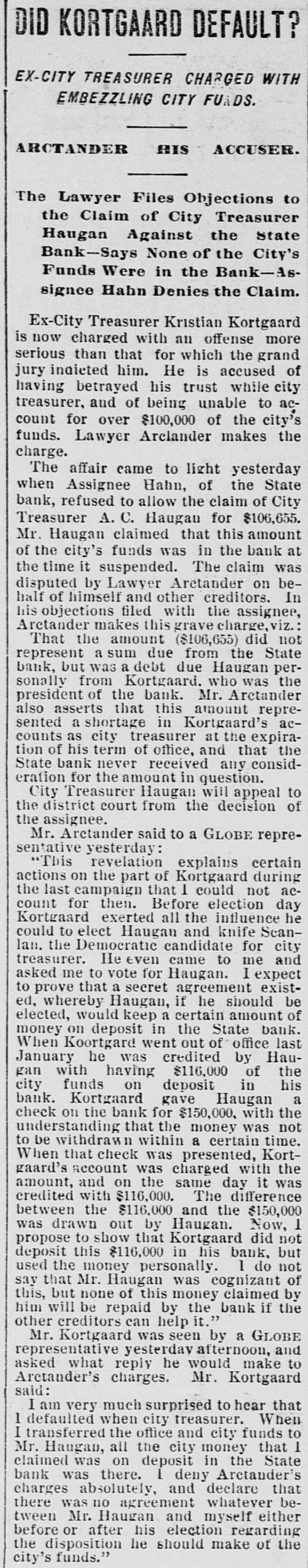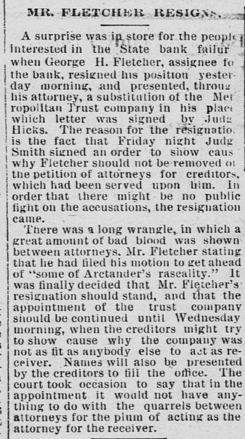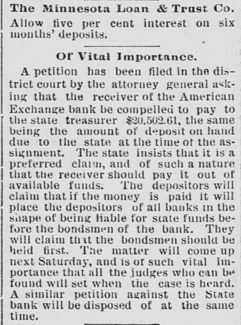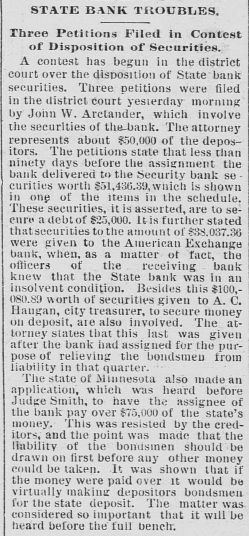 STATE BANK TROUBLES. Three Petitions Filed in Contest of Disposition of Securities. A contest has begun in the district court over the disposition of State bank securities. Three petitions were filed in the district court yesterday morning by John W. Arctander, which involve the securities of the bank. The attorney represents about $50,000 of the depositors. The petitions state that less than ninety days before the assignment the bank delivered to the Security bank se curities worth $51,436.39, which is shown in one of the items in the schedule. These securities, it is asserted, are to secure a debt of $25,000. Itis further stated thatsecurities to the amount of $38,037.36 were given to the American Exchange bank, when, as a matter of fact, the officers of the receiving bank knew that the State bank was in an insolvent condition. Besides this $100,080.89 worth of securities given to A. C. Haugan, city treasurer, to secure money on deposit, are also involved. The attorney states that this last was given after the bank had assigned for the purpose of relieving the bondsmen from liability in that quarter. The state of Minnesota also made an application, which was heard before Judge Smith, to have the assignee of the bank pay over $75,000 of the state's money. This was resisted by the creditors, and the point was made that the liability of the bondsmen should be drawn on first before any other money could be taken. It was shown that if the money were paid over It would be virtually making depositors bondsmen for the state deposit. The matter was considered SO important that it will be heard before the full bench.
