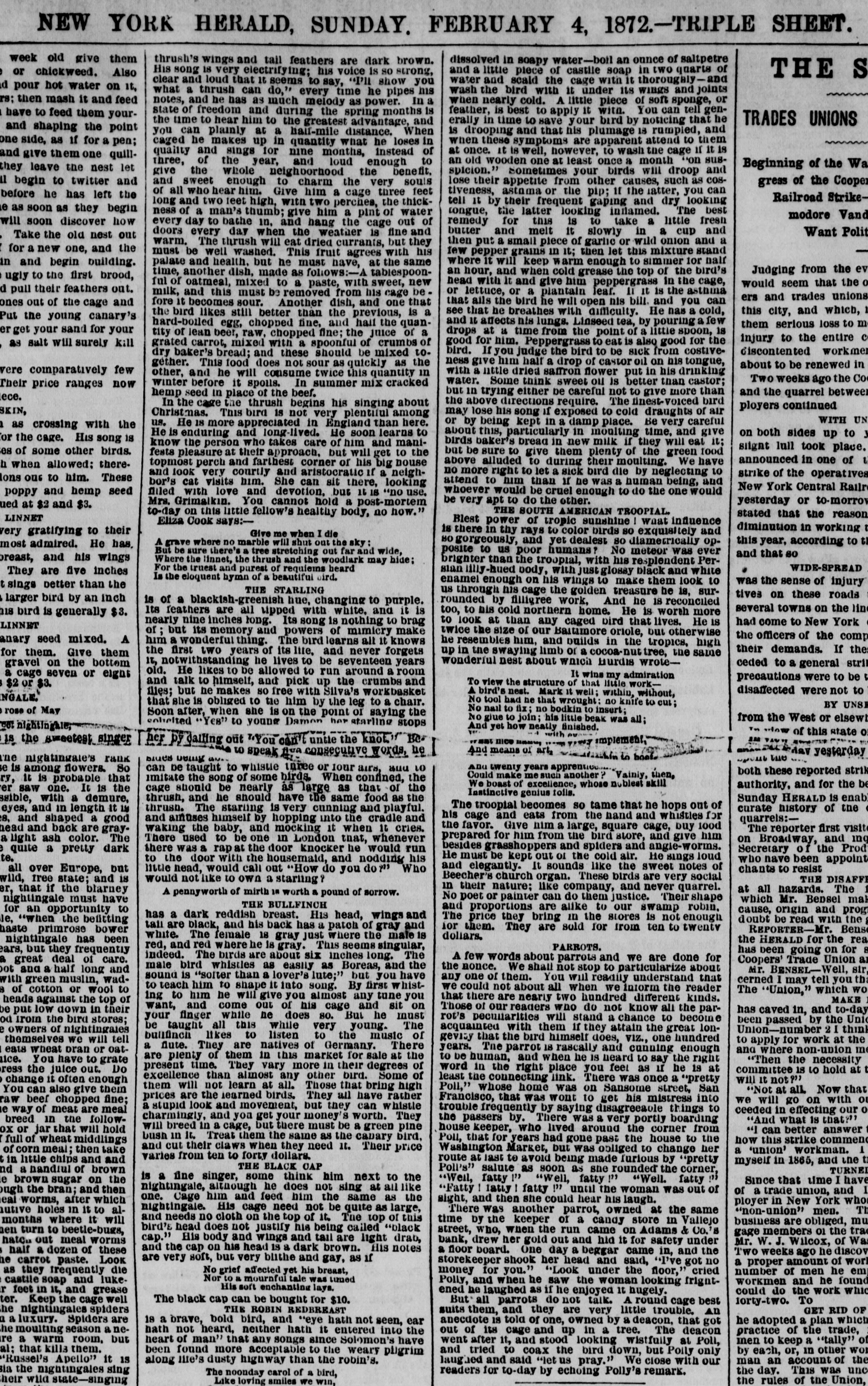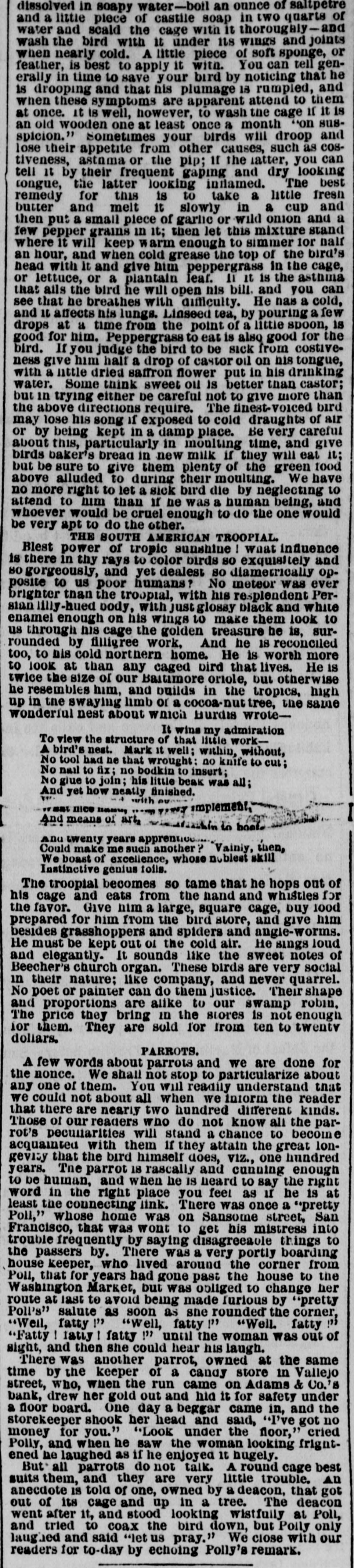 # NEW YORK HERALD, SUNDAY, FEBRUARY 4, 1872.—TRIPLE SHEET. week old give them or chickweed. Also pour hot water on it, then mash it and feed have to feed them your and shaping the point one side, as if for a pen; and give them one quill-they leave the nest let begin to twitter and before he has left the as soon as they begin will soon discover how Take the old nest out for a new one, and the in and begin building. ugly to the first brood. pull their feathers out. out of the cage and Put the young canary's get your sand for your as salt will surely kill were comparatively few Their price ranges now piece. SKIN, as crossing with the for the cage. His song is s of some other birds. when allowed; there-ons out to him. These poppy and hemp seed ed at $2 and $3. LINNET very gratifying to their most admired. He has breast, and his wings They are five inches larger bird by an inch his bird is generally $3. LINNET canary seed mixed. A for them. Give them gravel on the bottom a cage seven or eight $2 or $3. ENGALE, Rose of May nightingale is the sweetest singer thrush's wings and tail feathers are dark brown. His song is very electrifying; his voice is so strong, clear and loud that it seems to say, "Pil show you what a thrush can do," every time he pipes his notes, and he has as much melody as power. In a state of freedom and during the spring months is the time to hear him to the greatest advantage, and you can plainly at a half-mile distance. When caged he makes up in quantity what he loses in quality and sings for nine months, instead of three, of the year, and loud enough to give the whole neighborhood the benefit and sweet enough to charm the very souls of all who hear him. Give him a cage three feet long and two feet high, with two perches, the thickness of a man's thumb; give him a pint of water every day to bathe in, and hang the cage out of doors every day when the weather is fine and warm. The thrush will eat dried currants, but they must be well washed. This fruit agrees with his palate and health, but he must have, at the same time, another dish, made as follows:—A tablespoon-ful of oatmeal, mixed to a paste, with sweet, new milk, and this must be removed from his cage be-fore it becomes sour. Another dish, and one that the bird likes still better than the previous, is a hard-boiled egg, chopped fine, and half the quan-tity of lean beef, raw, chopped fine; the juice of a grated carrot, mixed with a spoonful of crumbs of dry baker's bread; and these should be mixed to-gether. This food does not sour as quickly as the other, and he will consume twice this quantity in winter before it spoils. In summer mix cracked hemp seed in place of the beef. In the cage the thrush begins his singing about Christmas. This bird is not very plentiful among us. He is more appreciated in England than here. He is enduring and long-lived. He soon learns to know the person who takes care of him and mani-fests pleasure at their approach, but will get to the topmost perch and farthest corner of his big house and look very courtly and aristocratic if a neigh-bor's cat visits him. She can sit there, looking filled with love and devotion, but it is "no use. Mrs. Grimalkin. You cannot hold a post-mortem to-day on this little fellow's healthy body, no how." Eliza Cook says:— Give me when I die A grave where no marble will shut out the sky; But be sure there's a tree stretching out far and wide, Where the linnet, the thrush and the woodlark may hide; For the truest and purest of requiems heard Is the eloquent hymn of a beautiful bird. THE STARLING Is of a blackish-greenish hue, changing to purple. Its feathers are all tipped with white, and it is nearly nine inches long. Its song is nothing to brag of; but its memory and powers of mimicry make him a wonderful thing. The bird learns all it knows the first two years of its life, and never forgets it, notwithstanding he lives to be seventeen years old. He likes to be allowed to run around a room and talk to himself, and pick up the crumbs and flies; but he makes so free with Silva's workbasket, that she is obliged to tie him by the leg to a chair. Soon after, when she is on the point of saying the solicited "Yes" to young Damon her starling stops her by calling out "You can't untie the knot," to speak three or four consecutive words, he can be taught to whistle three or four airs, and to imitate the song of some birds. When confined, the cage should be nearly as large as that of the thrush, and he should have the same food as the thrush. The starling is very cunning and playful. and amuses himself by hopping into the cradle and waking the baby, and mocking it when it cries. There used to be one in London that, whenever there was a rap at the door knocker he would run to the door with the housemaid, and nodding his head, would call out "How do you do?" Who would not like to own a starling? A pennyworth of mirth is worth a pound of sorrow. THE BULLFINCH Has a dark reddish breast. His head, wings and tail are black, and his back has a patch of gray and white. The female is gray just where the male is red, and red where he is gray. This seems singular, indeed. The birds are about six inches long. The male bird whistles as easily as Boreas, and the sound is "softer than a lover's lute;" but you have to teach him to shape it into song. By first whist-ing to him he will give you almost any tune you want, and come out of his cage and sit on your finger while he does so. But he must be taught all this while very young. The bullfinch likes to listen to the music of a flute. They are natives of Germany. There are plenty of them in this market for sale at the present time. They vary more in their degrees of excellence than almost any other bird. Some of them will not learn at all. Those that bring high prices are the learned birds. They all have rather a stupid look and movement, but they can whistle charmingly, and you get your money's worth. They will breed in a cage, but 