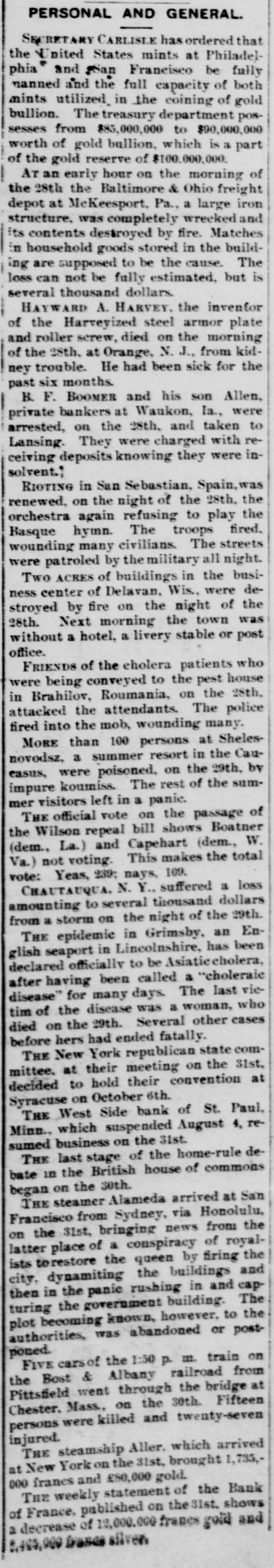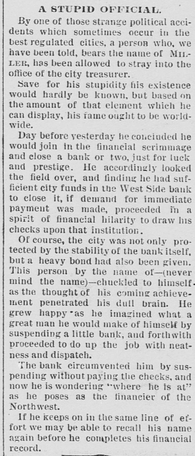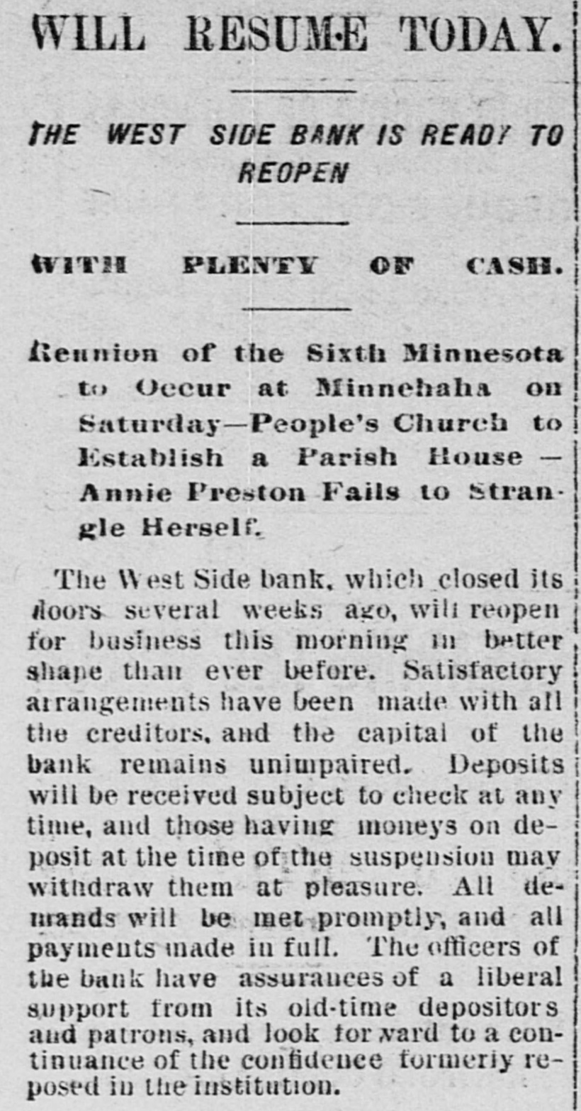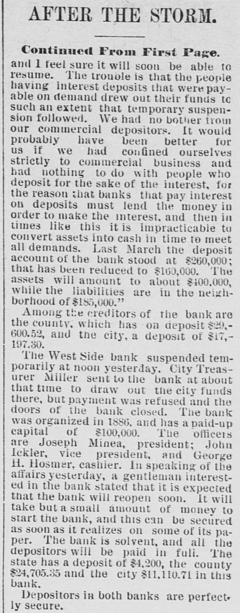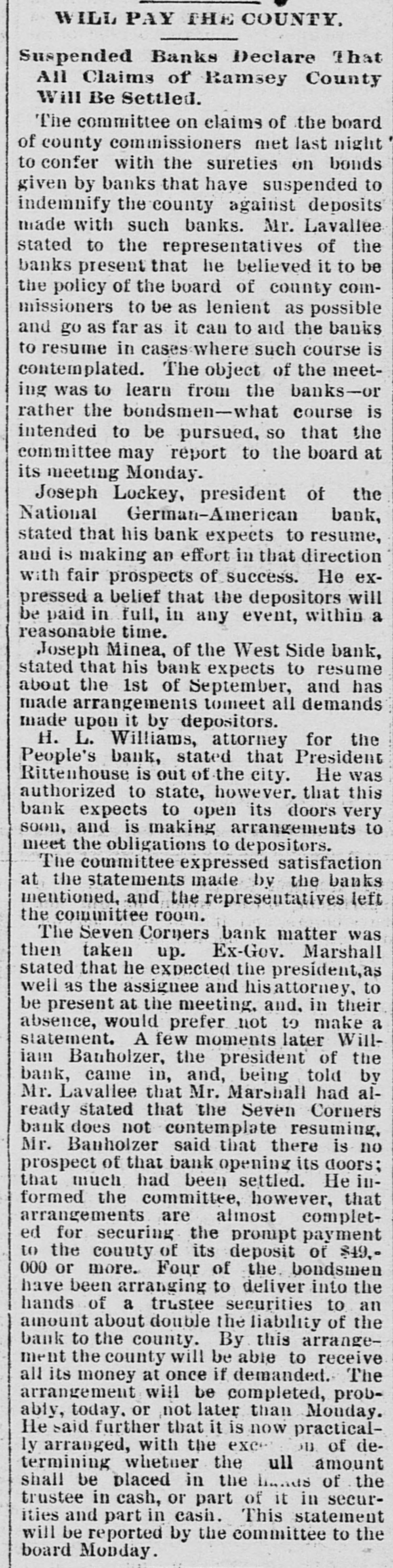COULDN'T REALIZE. Banks Forced to Suspend Owing to Inability to Sell Their Securities. MUNCIE, Ind., Aug. 4.-The Citizens National Bank, one of the oldest and soundest banks in this city, suspended business at 9 o'clock this morning. Withdrawals of deposits and inability to realize on paper are the cause. President Kerwood claims that the assets are as 2 to 1. Three other banks in this city are preparing for the worst, as the people are greatly excited over the fallure. LEBANON, Pa., Aug. 4.-The Lebanon Trust and Safe Deposit Bank failed to open its doors this morning. The announcement made was: "This bank closed by order of the directors." The bank is a state institution with a capital of $50,000. The inability to collect outstanding accounts, the general tightness of the money market and personal litigation of the president, Mr. Robert H. Coleman, locking up its securities and enjoining it from disposing of them, have compelled this step. ST. PAUL, Minn., Aug. 4.-The People's Savings Bank, one of the small concerns of the city, closed its doors at noon today. ST. PAUL, Minn., Aug. .-The National German American Bank failed to open its doors this morning and announced a temporary suspension consequent upon a steady drain of withdrawals for the past month. The bank officials announce that every liability will be made good, dollar for dollar, but they require time to realize on their securities. State, county and city funds are secured by bonds given by various wealthy business men outside of the bank. No statement of liabilities and assets is yet obtainable. By way of comparison with the last puby lished statement of the bank made July 12 the present footings of individual deposits show a total of over $631,000, as compared with $1,258,230. There is no excitement at the other banks and although some depositors are drawing out their money from some of the other institutions, there is no general action of that kind noticeable. ST. PAUL, Minn., Aug. 4.-The West Side Bank, a small bank on the west side of the river, closed its doors at 1 o'clock this afternoon.