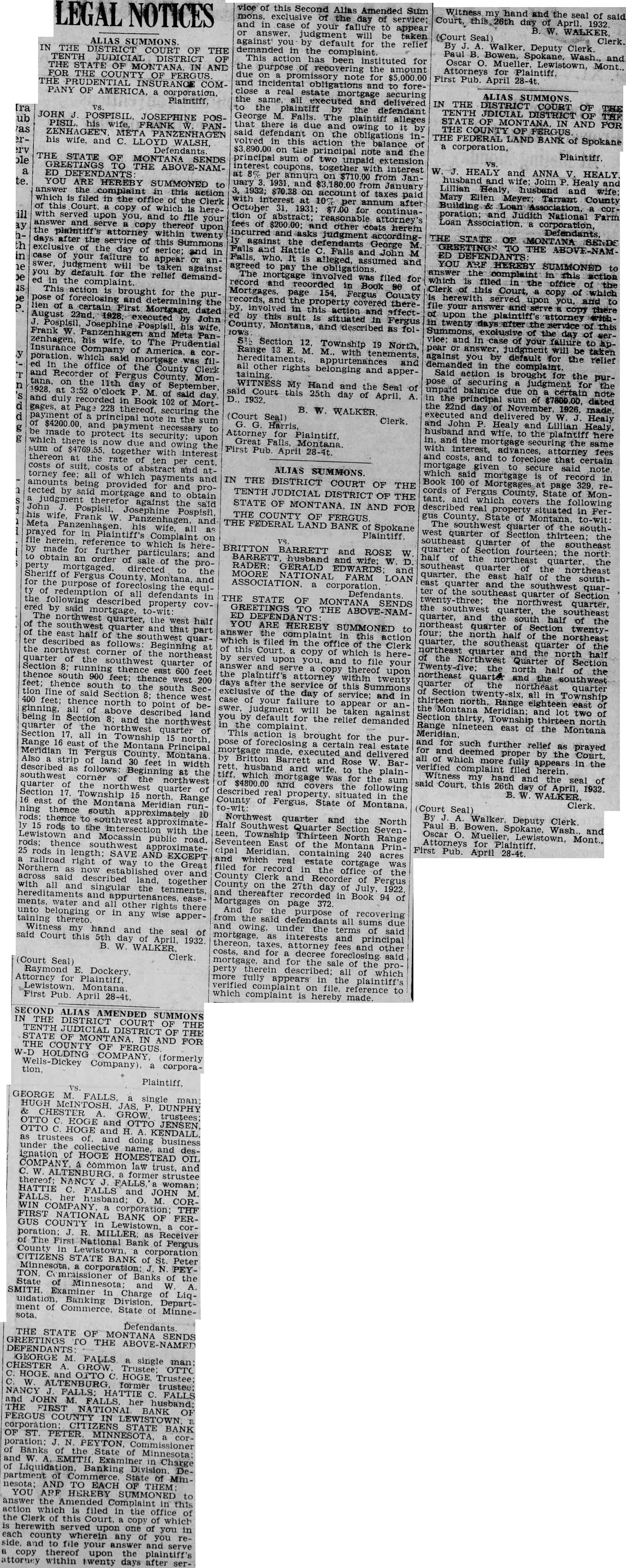 LEGAL NOTICES ALIAS SUMMONS. IN THE DISTRICT COURT OF THE TENTH JUDICIAL DISTRICT OF THE STATE OF MONT IN AND FOR THE COUNTY OF FERGUS. THE INSURANCE COMPANY OF AMERICA, a corporation, Plaintiff, JOHN J. POSPISIL, JOSEPHINE POSPISIL his wife, FRANK W. PANZENHAGEEN, META PANZENHAGEN his wife, and C. LLOYD WALSH, Defendants. THE STATE OF MONTANA SENDS GREETINGS TO THE ABOVE-NAMED DEFENDANTS YOU ARE HEREBY SUMMONED to answer the complaint in this action which is filed in the office of the Clerk of this Court. copy of which is herewith served upon you, and to file your answer and a copy thereof upon the plaintiff's attorney within twenty days after the service of this Summons exclusive of the day of serice; and in case of your failure to appear or answer judgment will be taken against you by default the relief demanded in the complaint. This action is brought for the purpose of foreclosing and determining the lien of a certain First Mortgage, dated August 22nd, 1928. executed by John J. Pospisil, Josephine Pospisil, his wife, Frank W. Panzenhagen and Meta Panzenhagen, his wife, to The Prudential Insurance Company of America, a corporation. which said mortgage was filed in the office of the County Clerk and Recorder of Fergus County Mon. tana, on the 11th day of September, 1928. at 3:52 o'clock P M. of said day, and duly recorded in Book 102 of Mortgages, at Page 228 thereof, securing the payment of a principal note in the sum of $4200 00 and payment necessary to be made to protect its security; upon which there is now due and owing the sum of $4769.55, together with interest thereon at the rate of ten per cent. costs of suit, costs of abstract and attorney fee: all of which payments and amounts being provided for and protected by said mortgage and to obtain a judgment therefor against the said John Pospisil, Josephine Pospisil, his wife, Frank W. Panzenhagen, and Meta Panzenhagen. wife, as prayed for in Plaintiff's Complaint on file herein, reference to which is hereby made for further particulars; and to obtain an order of sale of the property mortgaged, directed to the Sheriff of Fergus County Montana, and for the purpose of foreclosing equity of redemption of all defendants in the following described property COVered by said mortgage, to-wit: The northwest quarter, the west half the southwest quarter and that part of the east half of the southwest quarter described as follows Beginning at the northwest corner of the northeast quarter of the southwest quarter of Section 8: running thence east 600 feet thence south 900 feet; thence west 200 feet; thence south the south Section line said Section 8; thence west 400 feet; thence north to point of beginning. above described land being in Section 8; and the northwest in quarter of the northwest quarter Section 17. all in Township 15 north, Range 16 east of the Montana Principal Meridian Fergus County Montana Also a strip of land 30 feet in width described as follows Beginning at the southwest corner of the northwest quarter of the northwest quarter Section 17. Township 15 north. Range 16 east of the Montana Meridian running thence south approximately 10 rods: thence to southwest approximatelv 15 rods to the intersection with the Lewistown and Mocassin public road, rods; thence southwest approximate25 rods in length; SAVE AND EXCEPT a railroad right of way to the Great Northern as now established over and across said described land, together with all and singular the tenments, hereditaments and appurtenances, easements, water and all other rights there unto belonging or in any wise appertaining thereto. Witness my hand and the seal of said Court this 5th day April, 1932. B. W. WALKER. Clerk. (Court Seal) Raymond E. Dockery. Attorney for Plaintiff. Lewistown. Montana. First Pub. April 28-4t. SECOND ALIAS AMENDED SUMMONS IN THE DISTRICT COURT OF THE TENTH JUDICIAL DISTRICT OF THE STATE OF MONTANA, IN AND FOR THE COUNTY OF FERGUS W-D HOLDING COMPANY, (formerly Wells-Dickey Company). a corporation. vs. GEORGE M. FALLS. a single man: HUGH McINTOSH. JAS. P. DUNPHY & CHESTER A. GROW. trustees; OTTO C. HOGE and OTTO JENSEN. OTTO C. HOGE and H. A. KENDALL, as trustees of, and doing business under the collective name. and designation of HOGE HOMESTEAD OIL COMPANY a common law trust, and W. ALTENBURG. former strustee thereof; NANCY J. FALLS,'s woman; HATTIE C. FALLS and JOHN M. FALLS. her husband: O. M. CORWIN COMPANY, a corporation: THF FIRST NATIONAL BANK OF FERGUS COUNTY in Lewistown, a corporation: J. R. MILLER: as Receiver of The First National Bank of Fergus County in Lewistown, a corporation CITIZENS STATE BANK of St. Peter Minnesota, a corporation: J. N. PEYTON. C mmissioner of Banks of the State Minnesota: and W. A. SMITH. Examiner in Charge of Liquidation. Banking Division. Department of Commerce, State of Minne- Defendants THE STATE OF MONTANA SENDS GREETINGS ro THE ABOVE-NAMED DEFENDANTS: GEORGE M. FALLS R single man: CHESTER A. GROW. Trustee OTTC C. HOGE. and OTTO C. HOGE. Trustee: W. ALTENBURG. former trustee: NANCY J. FALLS: HATTIE C. FALLS and JOHN M. FALLS. her husband: THE FIRST NATIONAL BANK OF FERGUS COUNTY LEWISTOWN corporation: CITIZENS STATE BANK OF PETER MINNESOTA a corporation: J. N. PEYTON, Commissioner of Banks of the State of Minnesota: and W. A. EMITH. Examiner in Charge of Liquidation. Banking Division, Department of Commerce, State of Minnesota; AND TO EACH OF THEM: YOU ARF HEREBY SUMMONED to answer the Amended Complaint in this action which is filed in the office of the Clerk of this Court, a copy of which is herewith served upon one of you in each county wherein any of you reside. and to file your answer and serve a copy thereof upon the plaintiff's attorney within twenty days after ser- vice of this Second Alias Amended Sum mons, exclusive of the day of service: and in case of your failure to appear or answer, judgment will be taken against you by default for the relief demanded in the complaint. This action has been instit