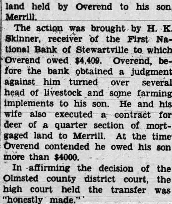 The action was brought by H. K. Skinner, receiver of the First National Bank of Stewartville to which Overend owed $4,409.