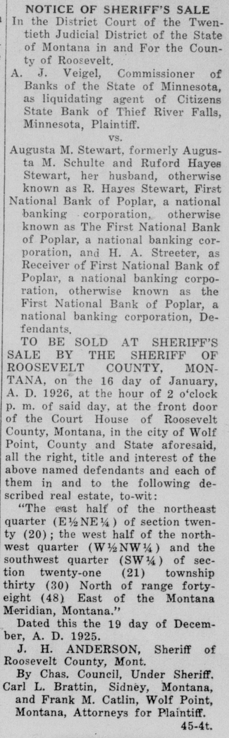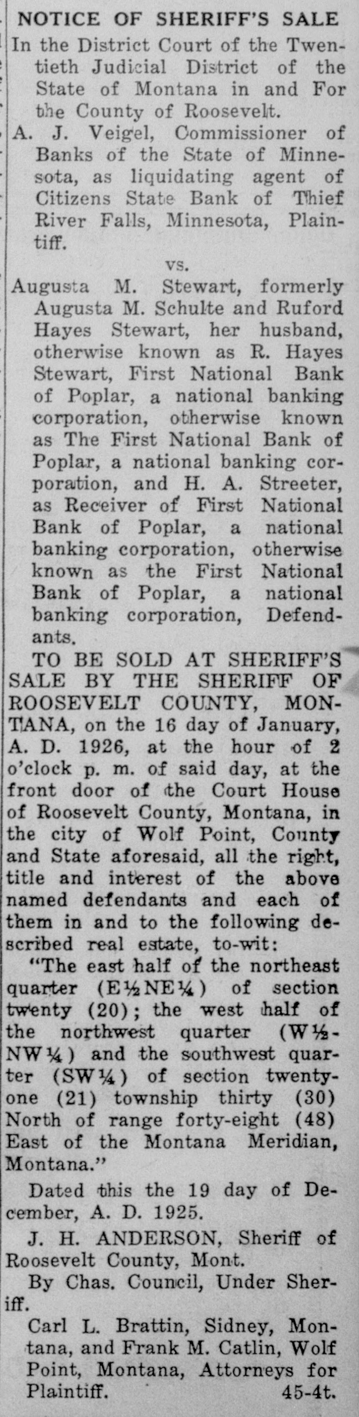 NOTICE OF SHERIFF'S SALE In the District Court of the Twentieth Judicial District of the State of Montana in and For the County of Roosevelt. A. J. Veigel, Commissioner of Banks of the State of Minnesota, as liquidating agent of Citizens State Bank of Thief River Falls, Minnesota, Plaintiff. vs. Augusta M. Stewart, formerly Augusta M. Schulte and Ruford Hayes Stewart, her husband, otherwise known as R. Hayes Stewart, First National Bank of Poplar, a national banking corporation, otherwise known as The First National Bank of Poplar, a national banking corporation, and H. A. Streeter, as Receiver of First National Bank of Poplar, a national banking corporation, otherwise known as the First National Bank of Poplar, a national banking corporation, Defendants. TO BE SOLD AT SHERIFF'S SALE BY THE SHERIFF OF ROOSEVELT COUNTY, MONTANA, on the 16 day of January, A. D. 1926, at the hour of 2 o'clock p. m. of said day, at the front door of the Court House of Roosevelt County, Montana, in the city of Wolf Point, County and State aforesaid, all the right, title and interest of the above named defendants and each of them in and to the following described real estate, to-wit: "The east half of the northeast quarter (E%NE%) of section twenty (20) the west half of the northwest quarter (WNW) and the southwest quarter (SW ¹/4) of section twenty-one (21) township thirty (30) North of range fortyeight (48) East of the Montana Meridian, Montana." Dated this the 19 day of December, A. D. 1925. J. H. ANDERSON, Sheriff of Roosevelt County, Mont. By Chas. Council, Under Sheriff. Carl L. Brattin, Sidney, Montana, and Frank M. Catlin, Wolf Point, Montana, Attorneys for Plaintiff. 45-4t.