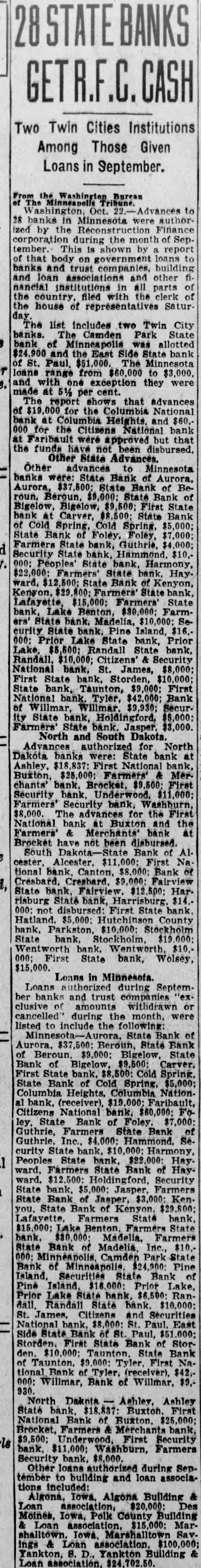 Two Twin Cities Institutions Among Those Given Loans in September. the Oct. to 28 banks in Minnesota authorized by the Finance corporation during the month of Sep. tember. This is shown by report body on government loans to banks and trust companies, building and loan associations and other nancial institutions all parts the country, with the clerk of the house of representatives Satur The list includes two Twin City banks. The Camden Park bank of Minneapolis was allotted and State bank St. Paul, $51,000. Minnesota loans range from $60,000 to $3,000, and with exception they were made at The report shows that advances of the Columbia National bank at Columbia Heights. and 000 for the Citizens National bank at Faribault were approved that the funds been disbursed. Other State Advances. Other advances Minnesota banks were: State Bank of Aurora, Aurora, $37,500; State Bank of Beroun, Beroun, $9,000; State Bank of Bigelow, Bigelow, First State bank at Carver, $8,500; State Bank of Cold Spring Cold $5 Farmers State bank, Guthrie, 000: Peoples' State bank, Harmony, $22,000: Farmers' State bank. Hay. ward. $12,500; State Bank of Kenyon, Kenyon, bank, Lafayette $15,000; Farmers' State ers' State bank. Madelia, $10,000: Security State bank. Pine Island, $16.000; Prior Lake State bank, Prior Lake, $5,500: Randall State bank, National bank, James, First State bank. Storden, $10,000; State bank, Taunton, First National bank Tyler, $42,000; Bank of Willmar, Willmar. $9,930; SecurFarmers' State bank. Jasper $3,000. North and South Dakota Advances for North Dakota banks authorized were: State bank at Ashley, $18,837: First National bank, Security bank $11,000; Farmers' Security bank Washburn, $8,000. The advances for the First National bank Buxton and the Farmers' Merchants bank at Brocket have not been disbursed. South Dakota- Bank of A1. cester Alcester. First Na 000: not disbursed: First State bank. 000: First State bank, Wolsey, $15,000.